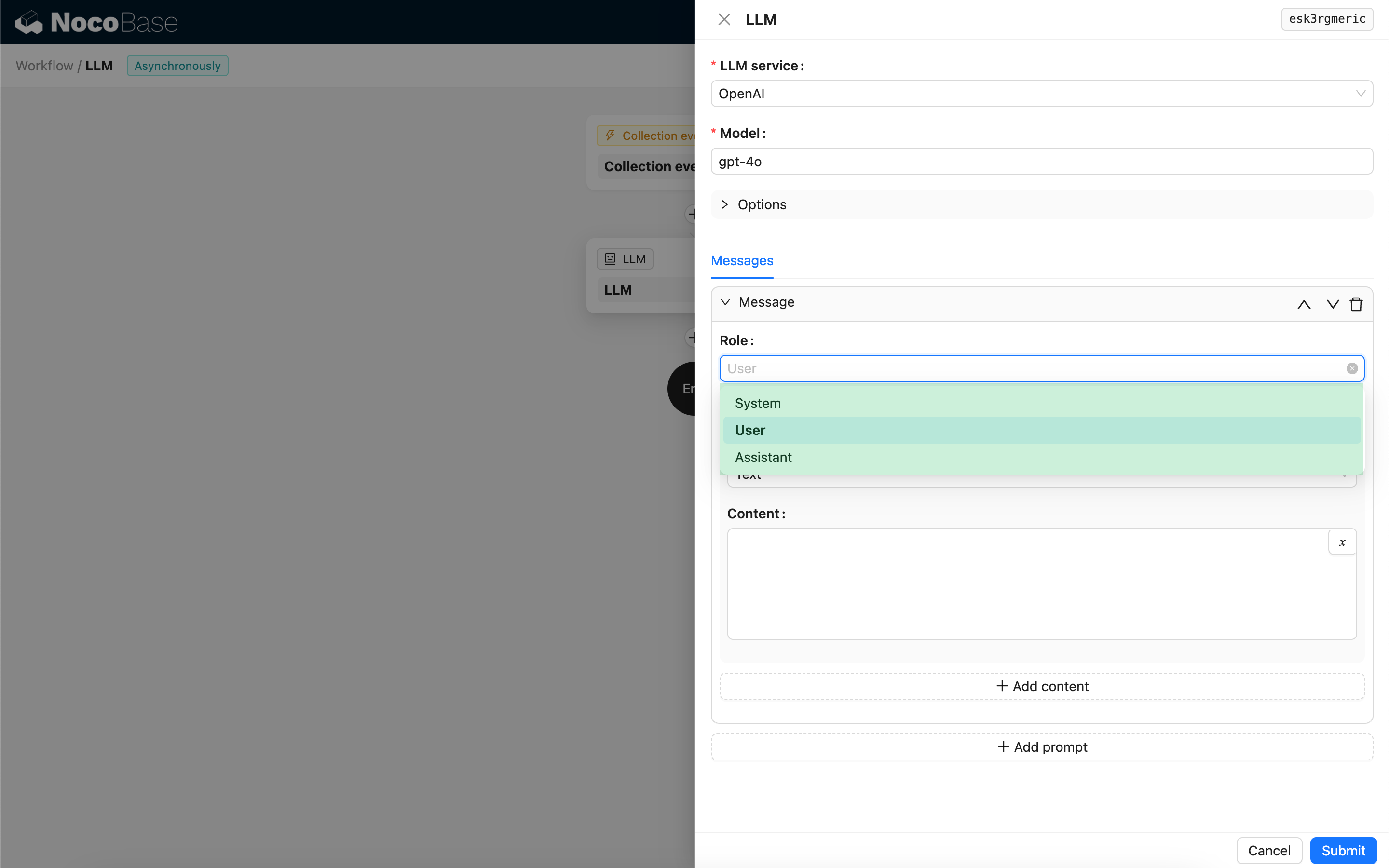 For user messages, provided the model supports it, you can add multiple pieces of content in a single prompt, corresponding to the content parameter. If the model you are using only supports the content parameter as a string (which is the case for most models that do not support multi-modal conversations), please split the message into multiple prompts, with each prompt containing only one piece of content. This way, the node will send the content as a string.