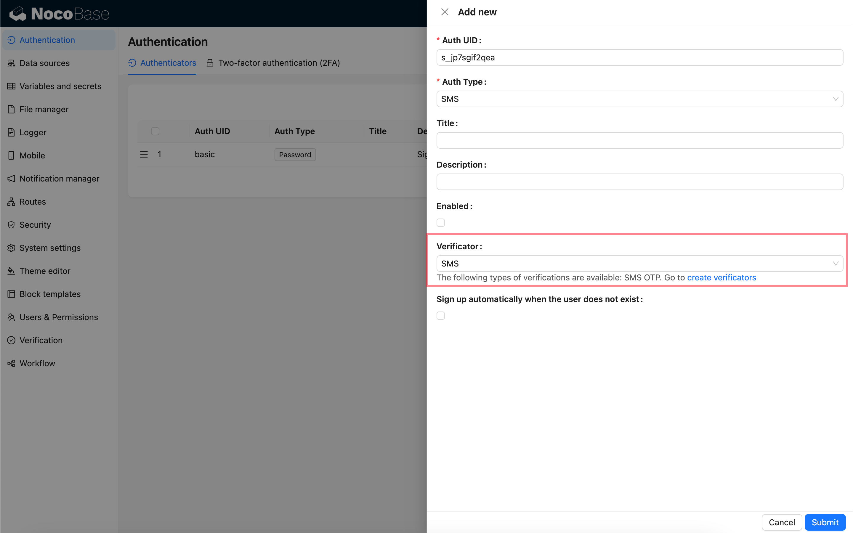 Verificator: Bind an SMS verificator to send SMS verification codes. If no verificator is available, you need to go to the Verification management page to create an SMS verificator first. See also: