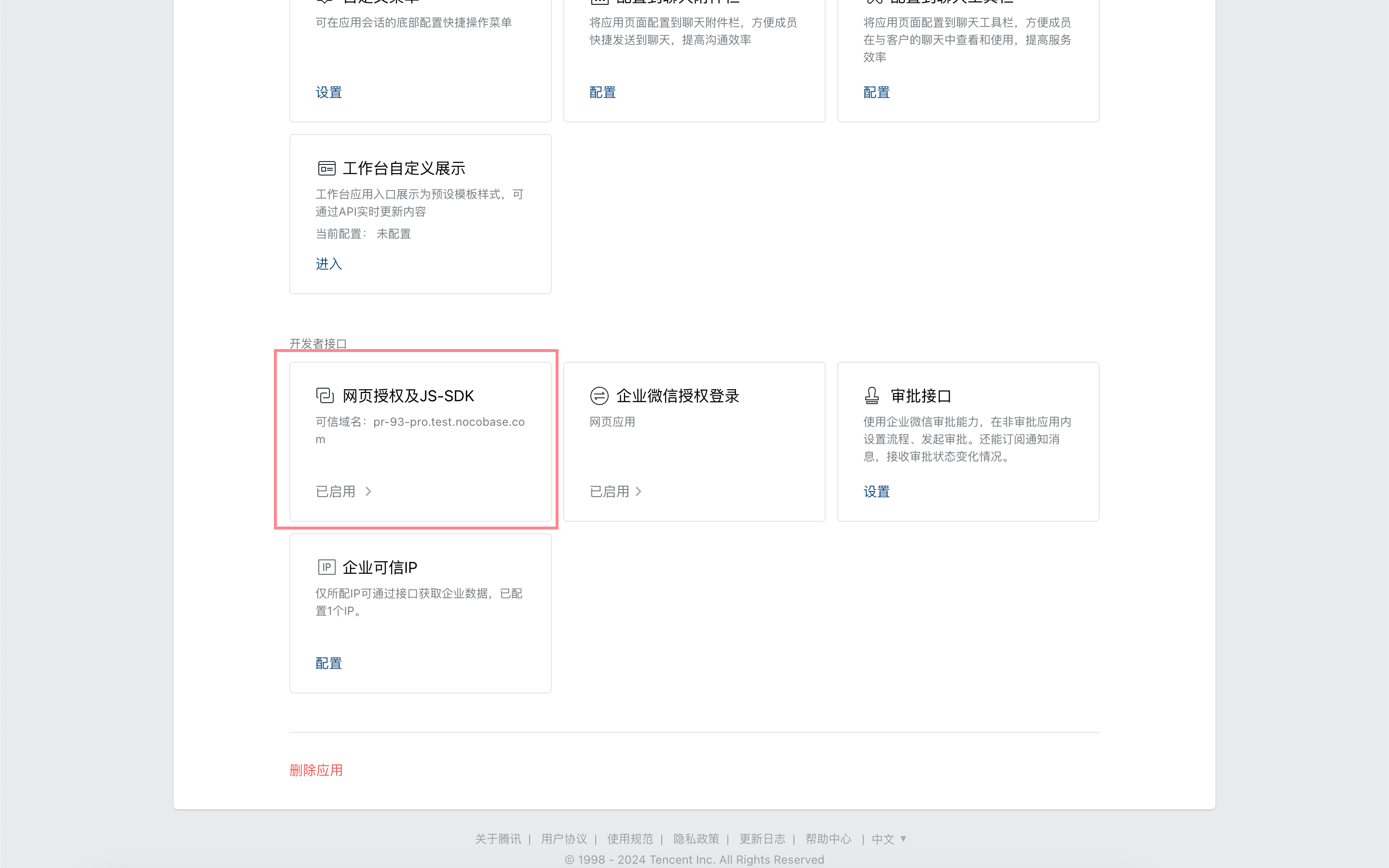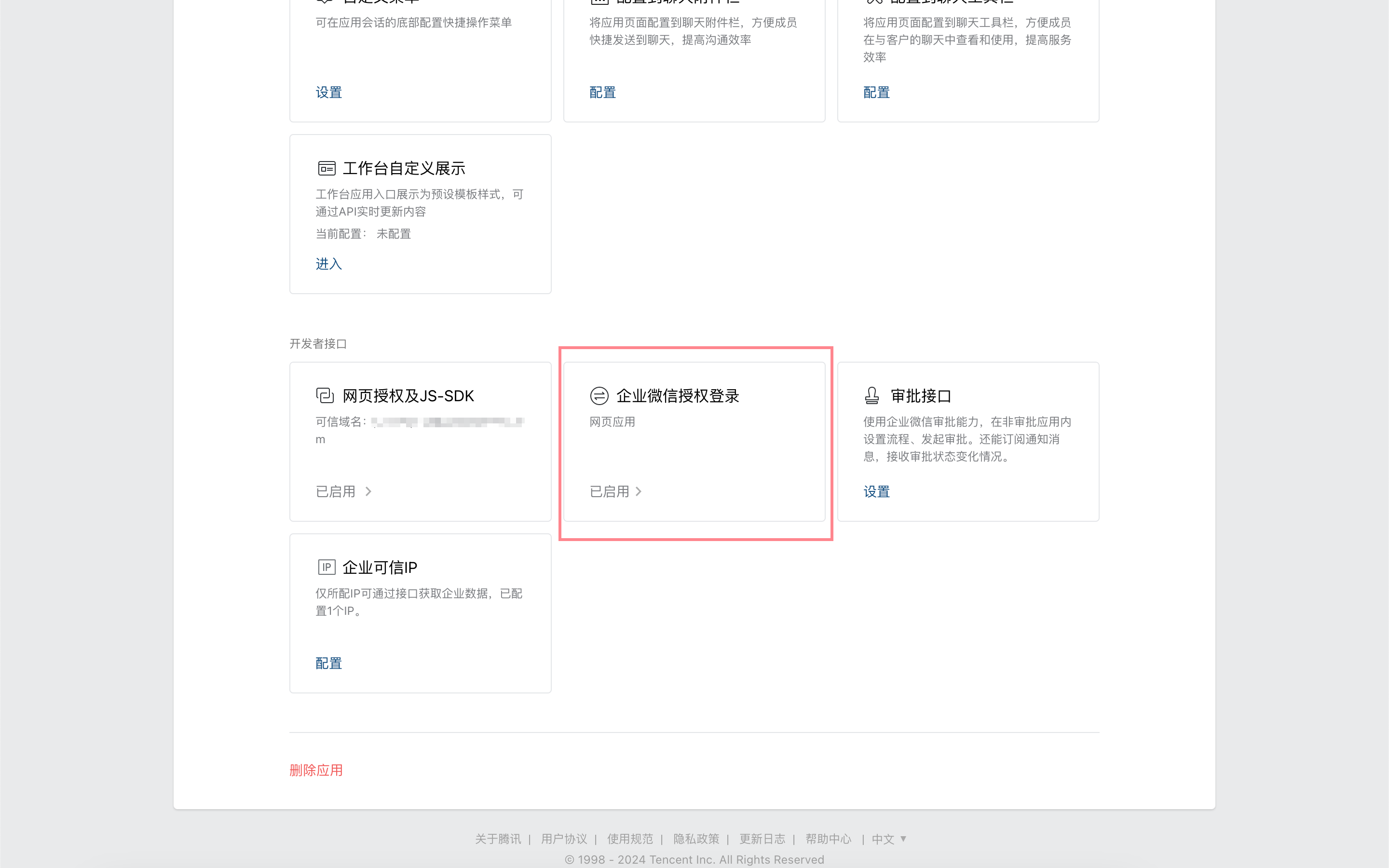 Click the application to enter its details page, scroll down, and click "WeCom Authorized Login".