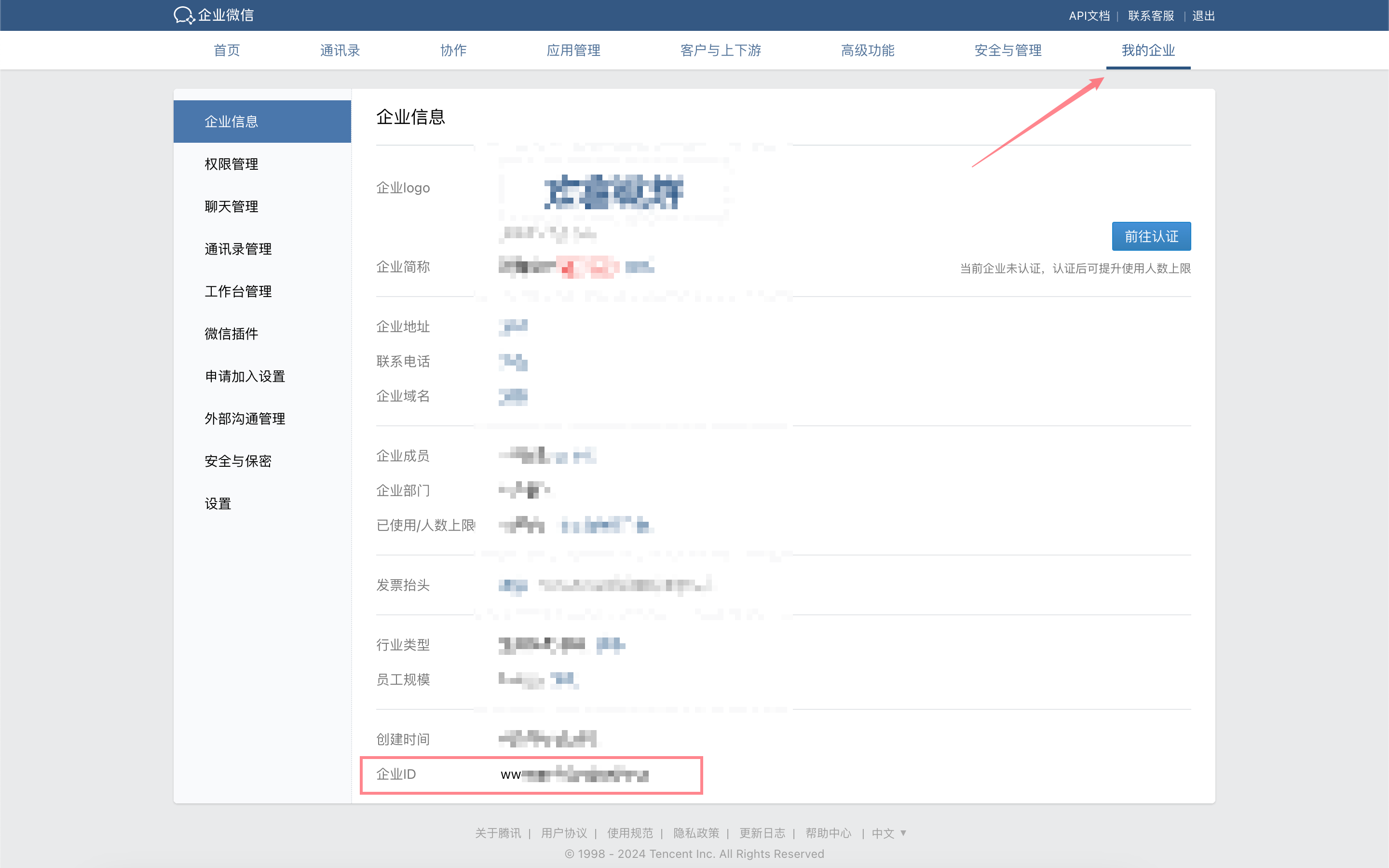 In the WeCom admin console, under "My Company", copy the "Company ID".
