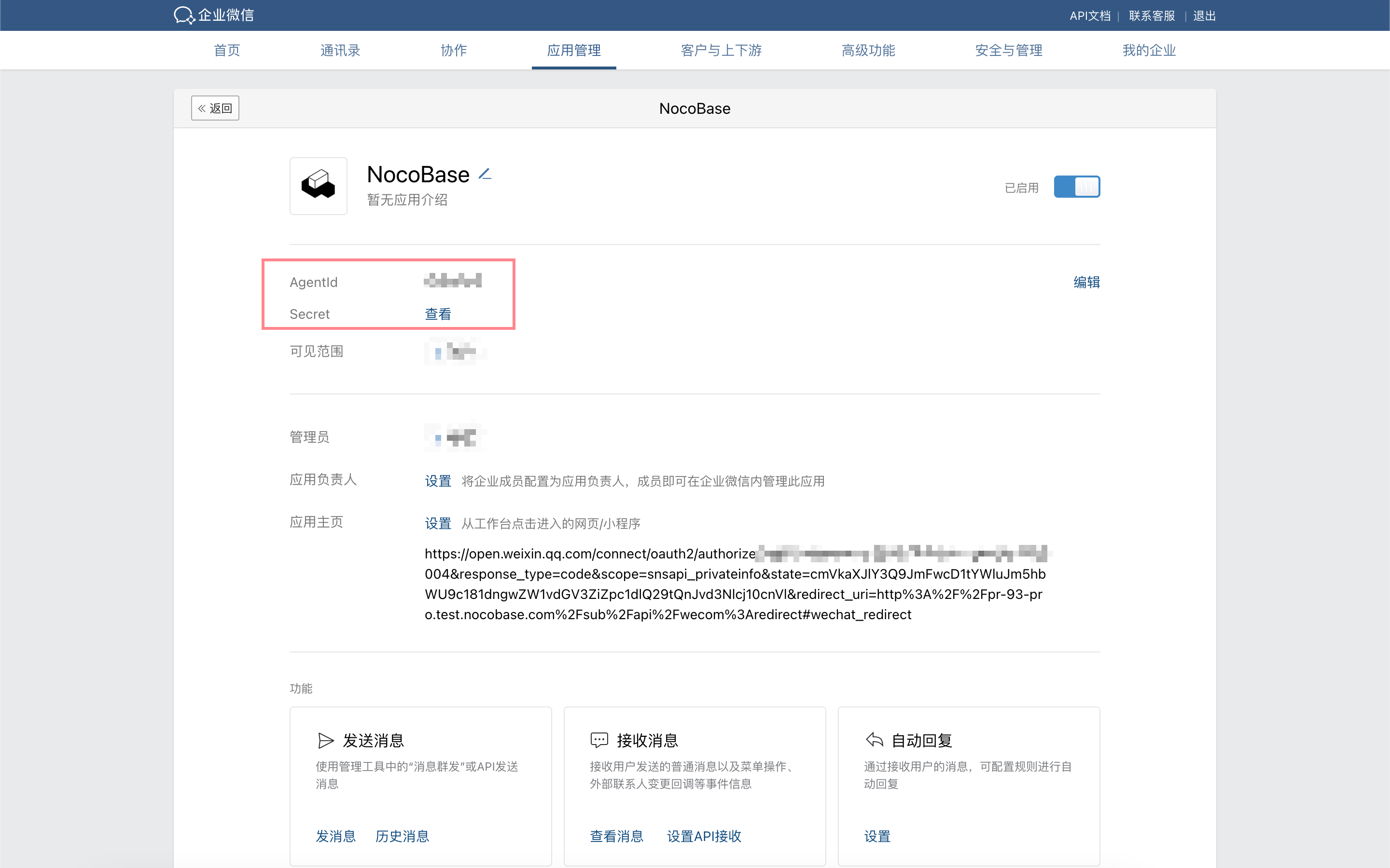 In the WeCom admin console, under "App Management", go to the details page of the application created in the previous step and copy the AgentId and Secret.