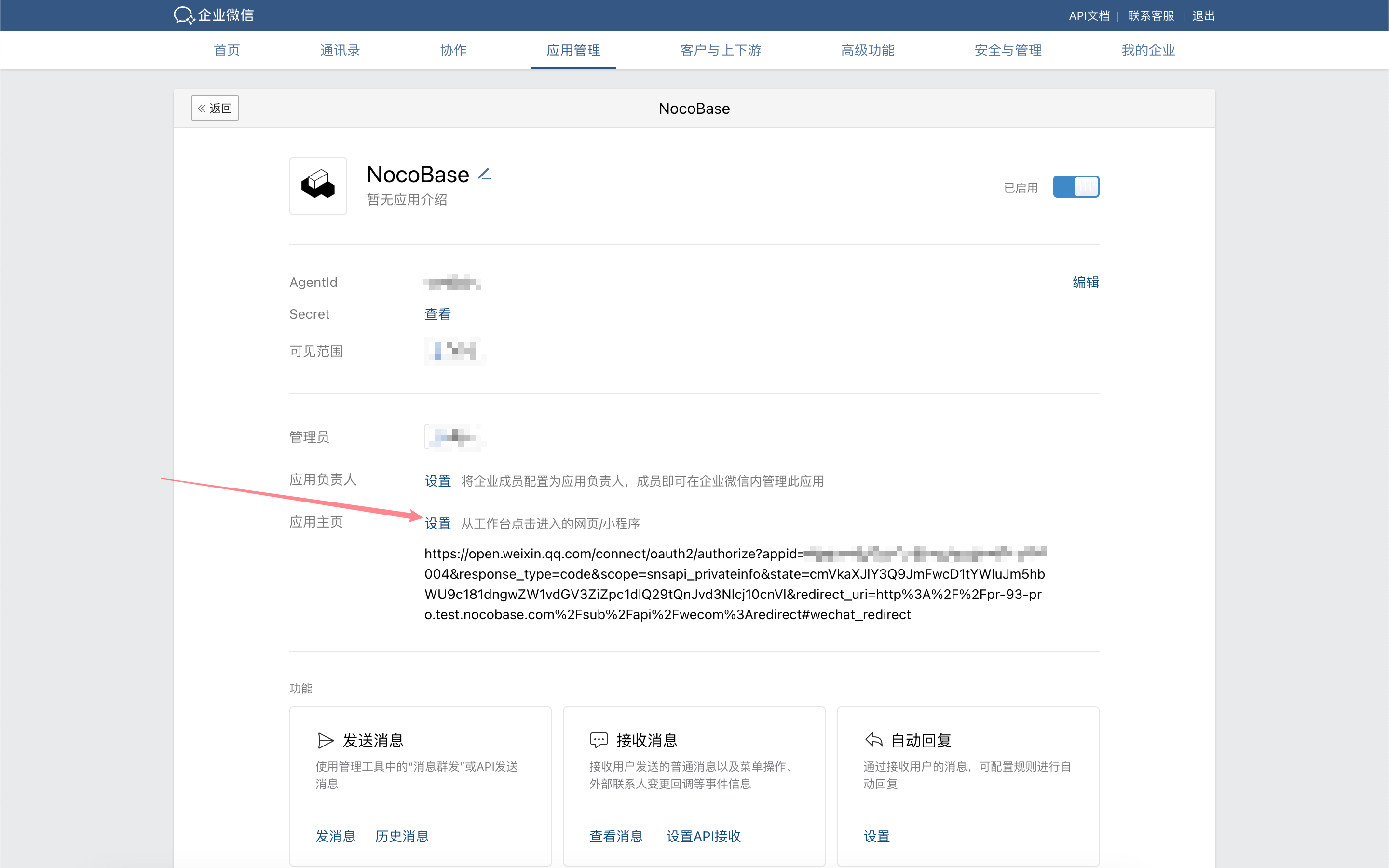 Go to the WeCom admin console and paste the copied workbench application homepage link into the application homepage address field of the corresponding application.