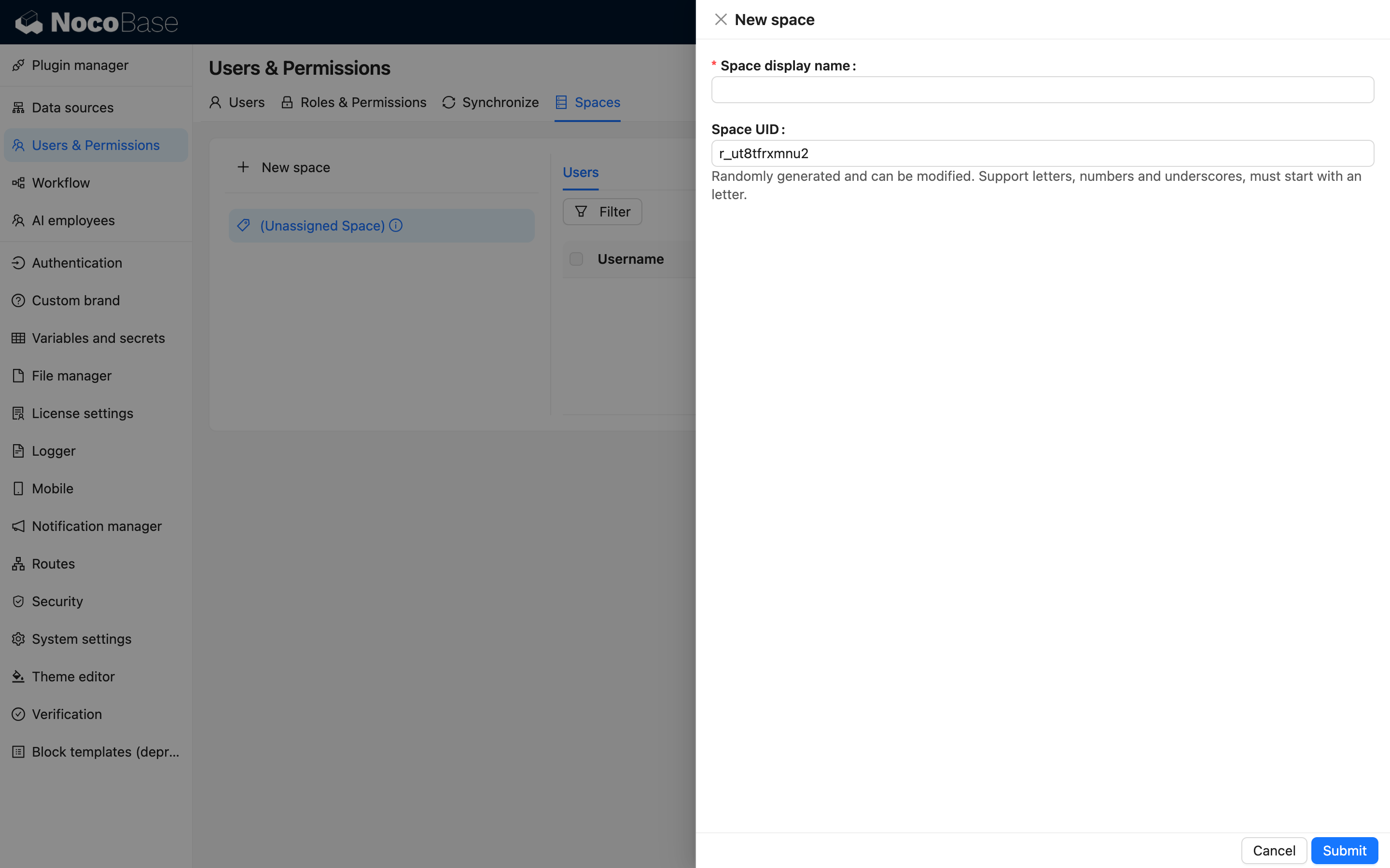 启用插件后,进入 「用户与权限」 设置页面,切换到 空间 面板即可管理空间。