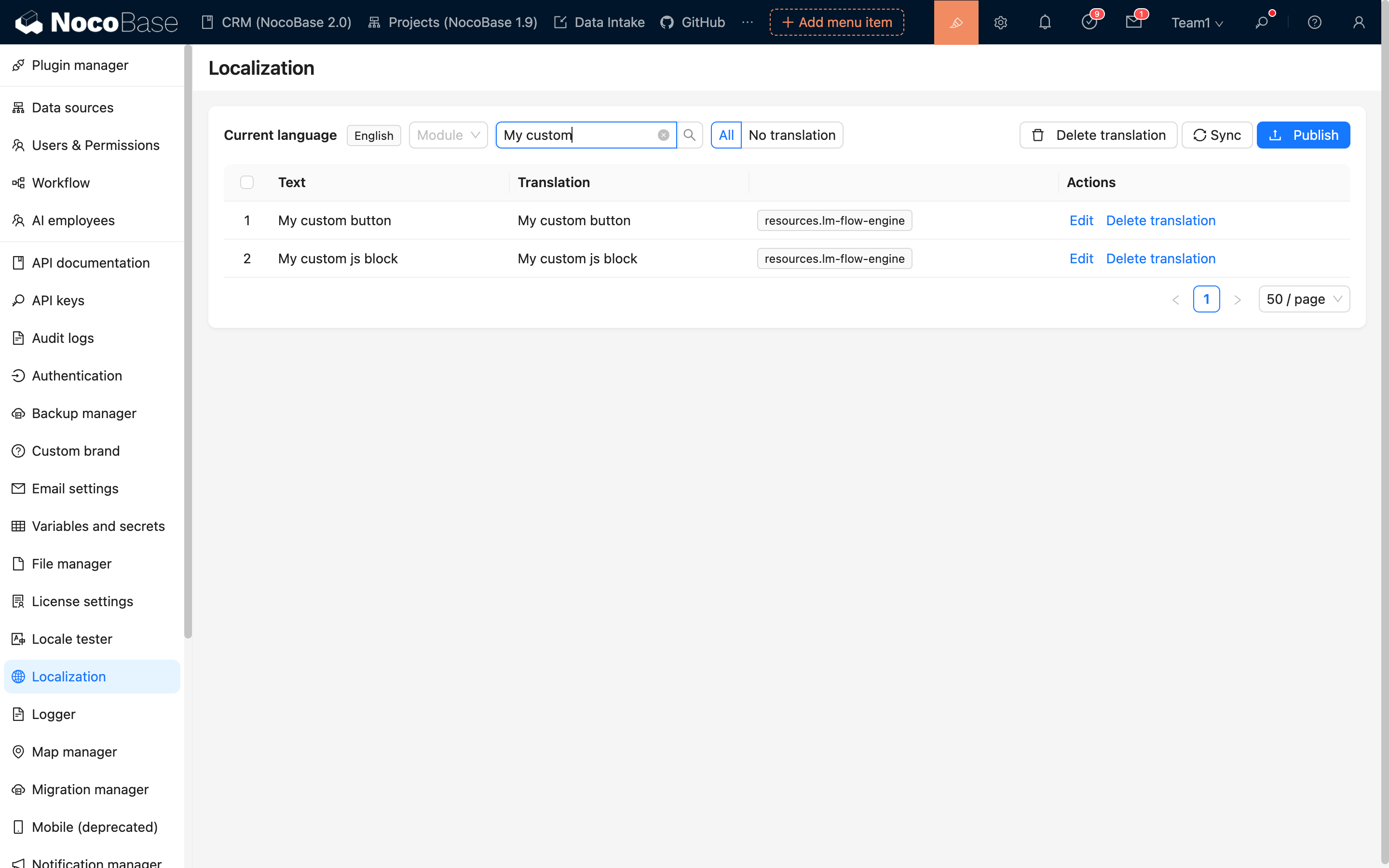 本地化管理插件用于管理和实现 NocoBase 的本地化资源,可对系统的菜单、数据表、字段以及所有插件进行翻译,以适应特定地区的语言和文化。