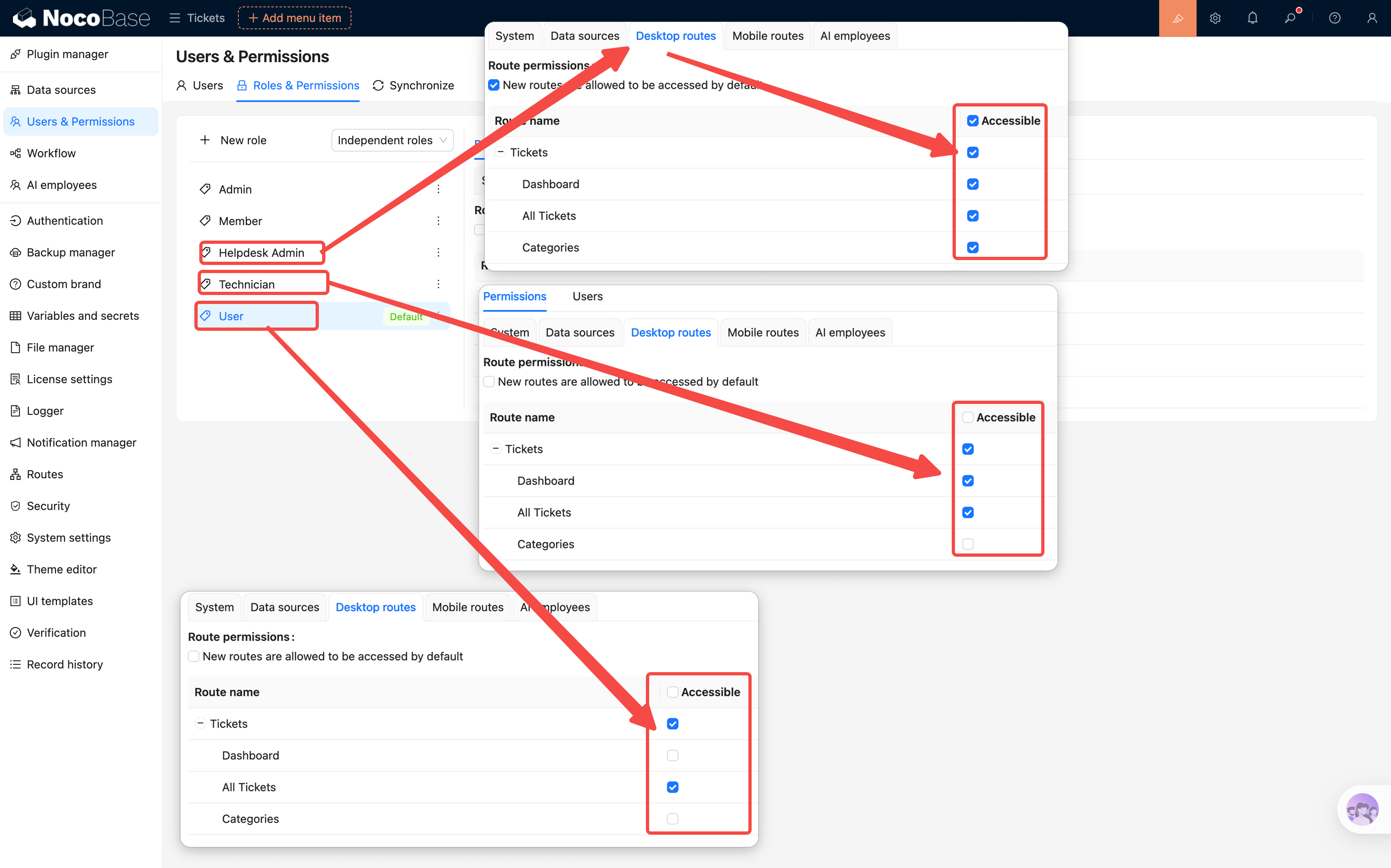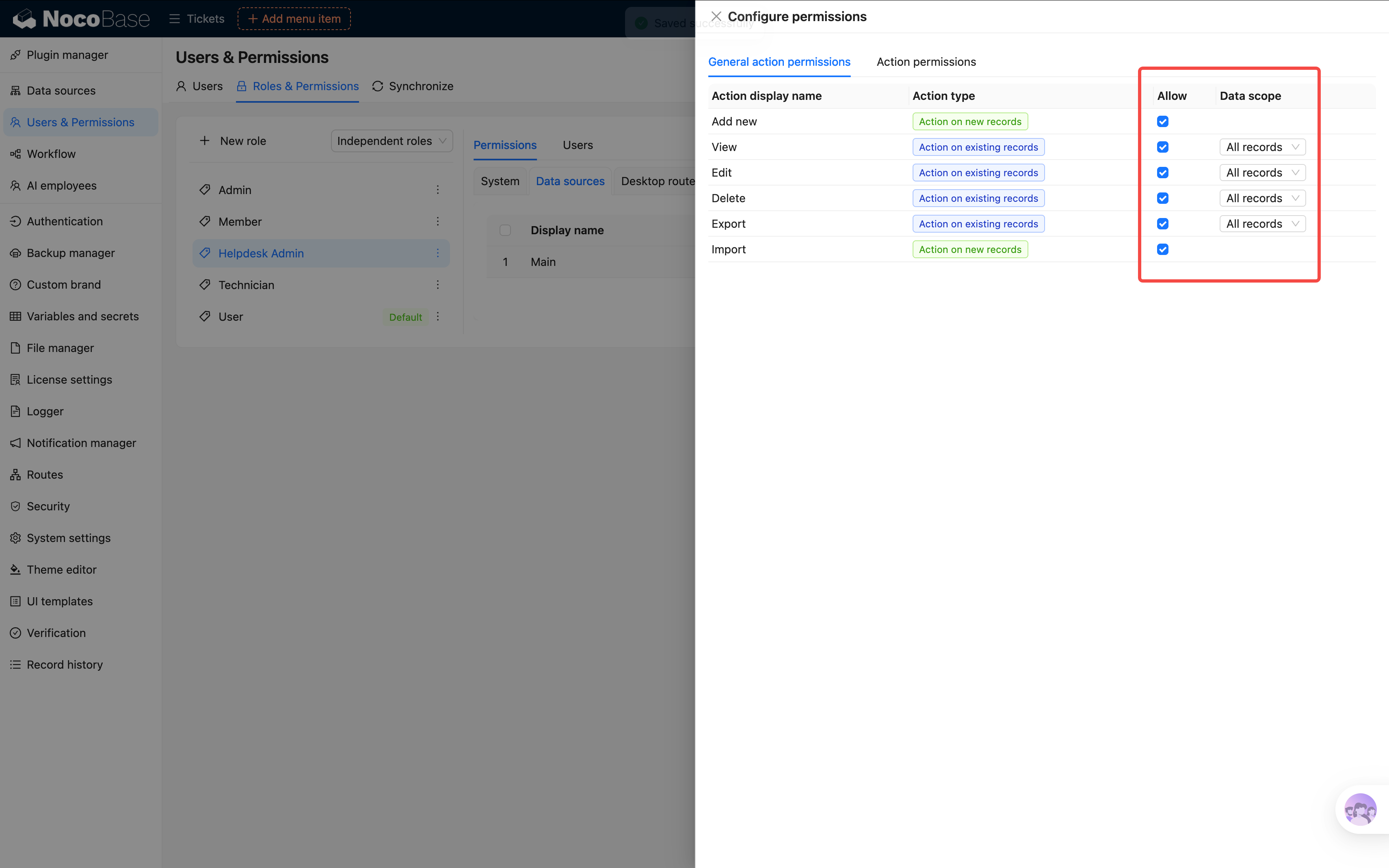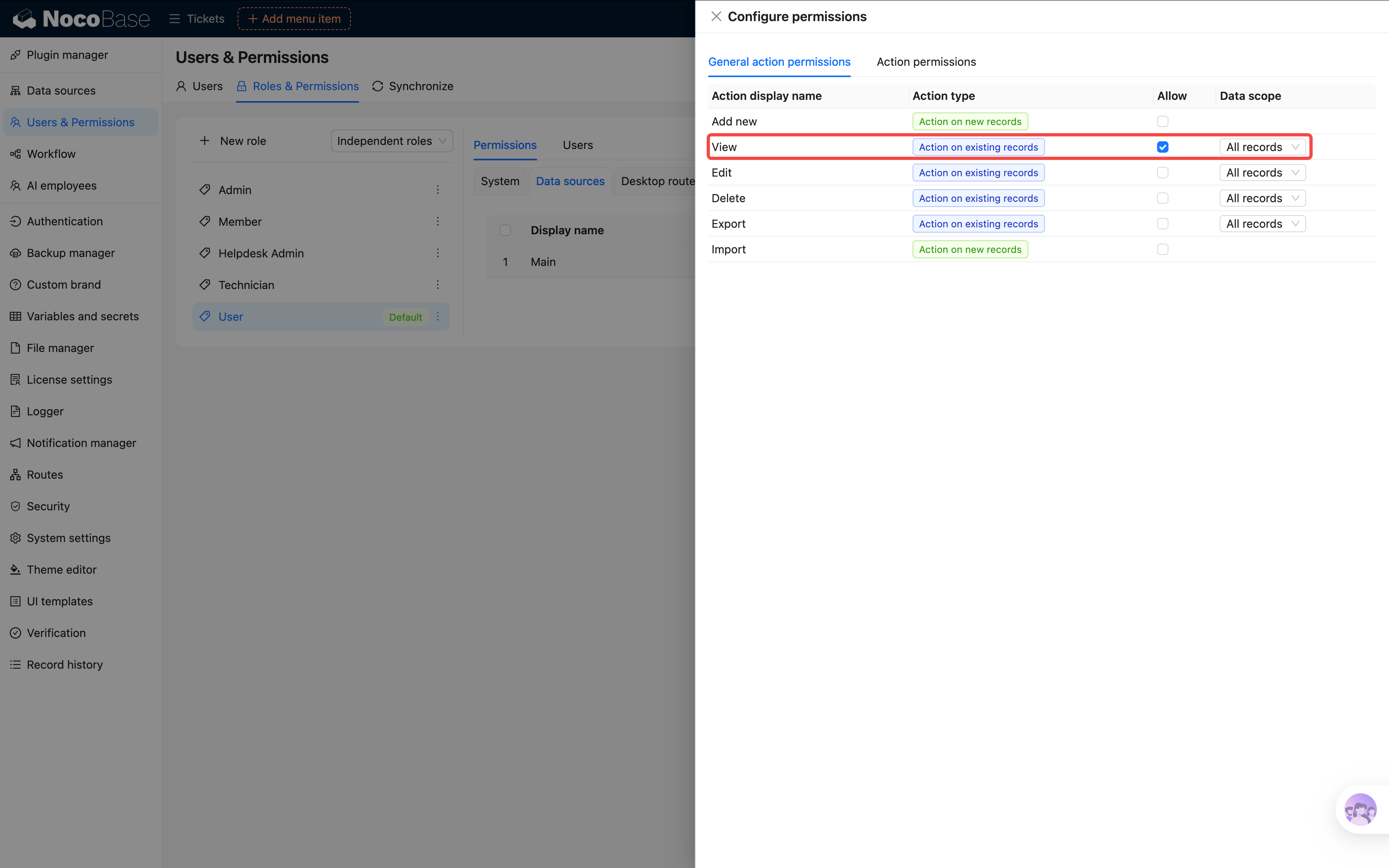 小提示:NocoBase 有个方便的设置——"新增菜单项默认允许访问"。如果你不想每次加新页面都手动勾选,可以给管理员角色开启这个选项。对于普通用户角色,建议关闭它。
