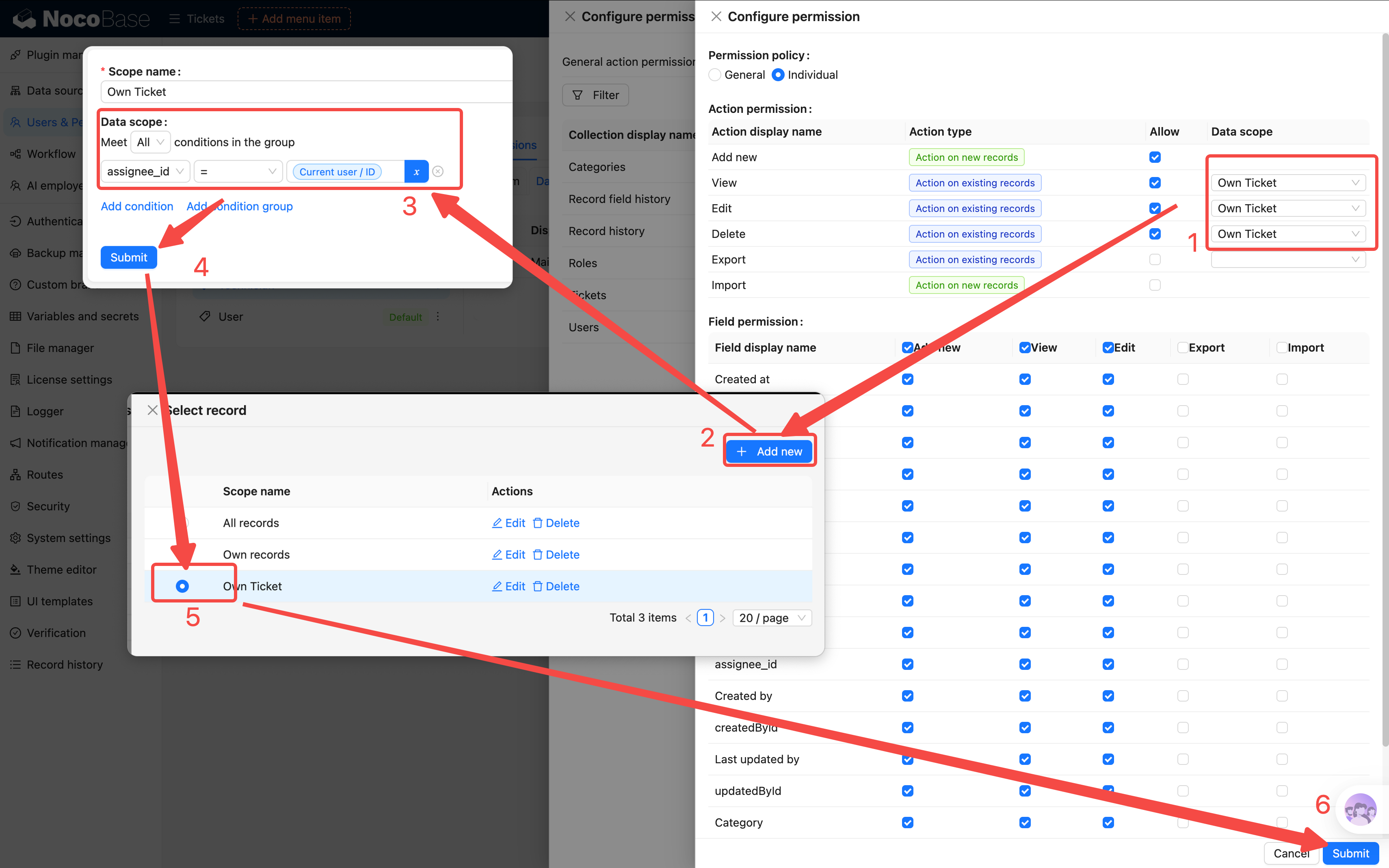 关于全局配置:如果只配置工单表,可能导致其他数据、配置项(比如分类表、处理人)看不到。我们目前的系统比较简单,本次在全局中直接勾选 “查看所有数据”,针对数据范围敏感的表,再单独配置权限