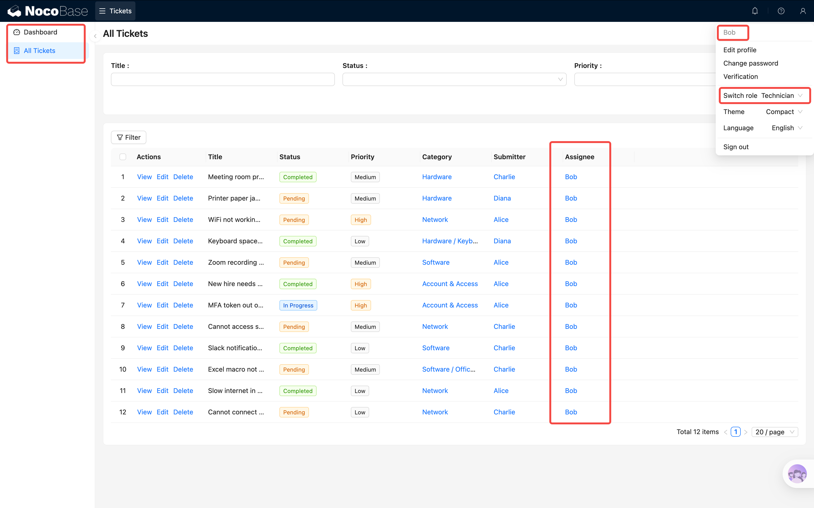 | 技术员 | technician | 只看分配给自己的工单,能处理和关闭 |
