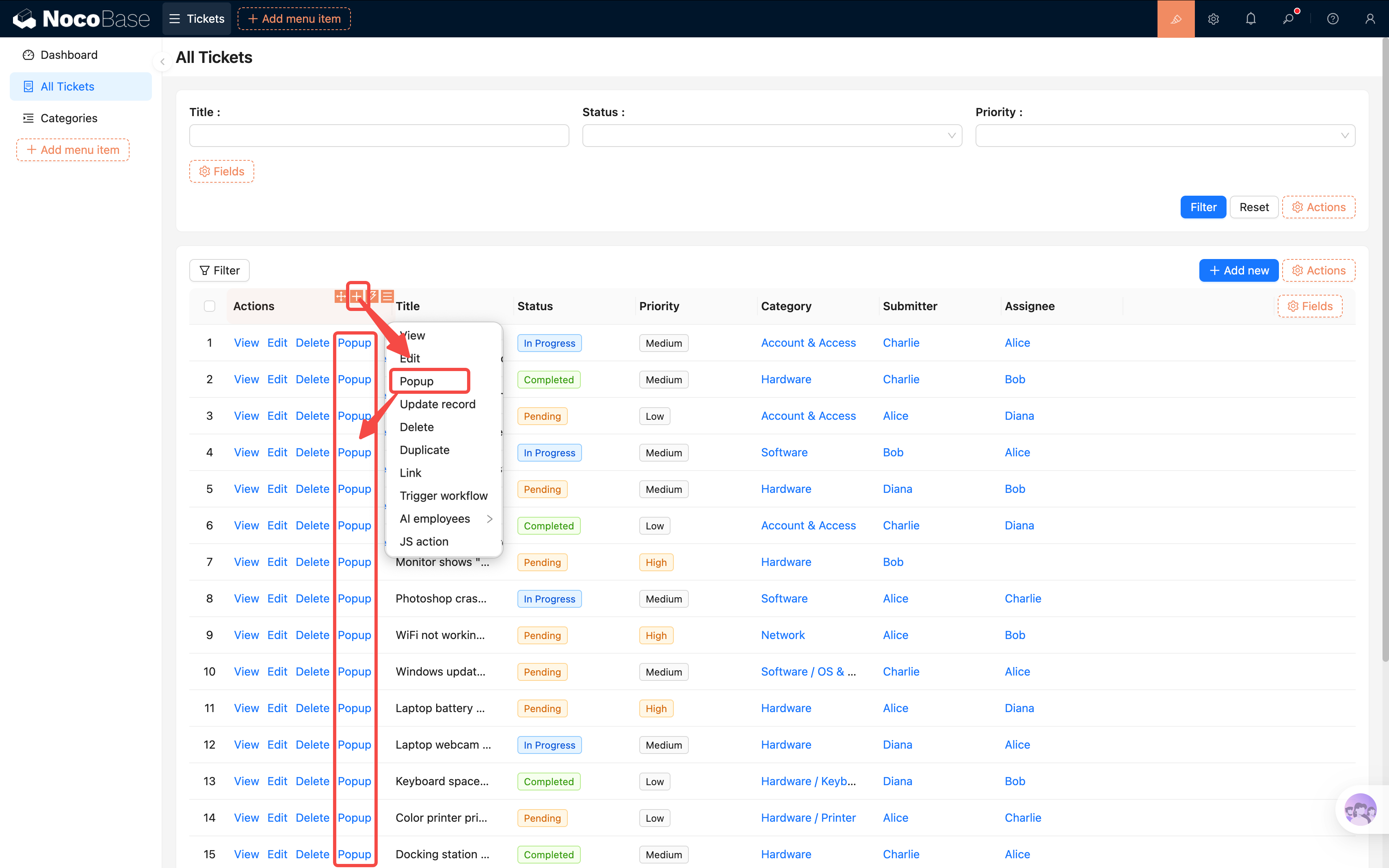 权限配好之前,我们先给工单列表加一个实用功能:分配处理人。管理员可以直接在列表中把工单分配给某个技术员,不用进入编辑页面改一堆字段。
