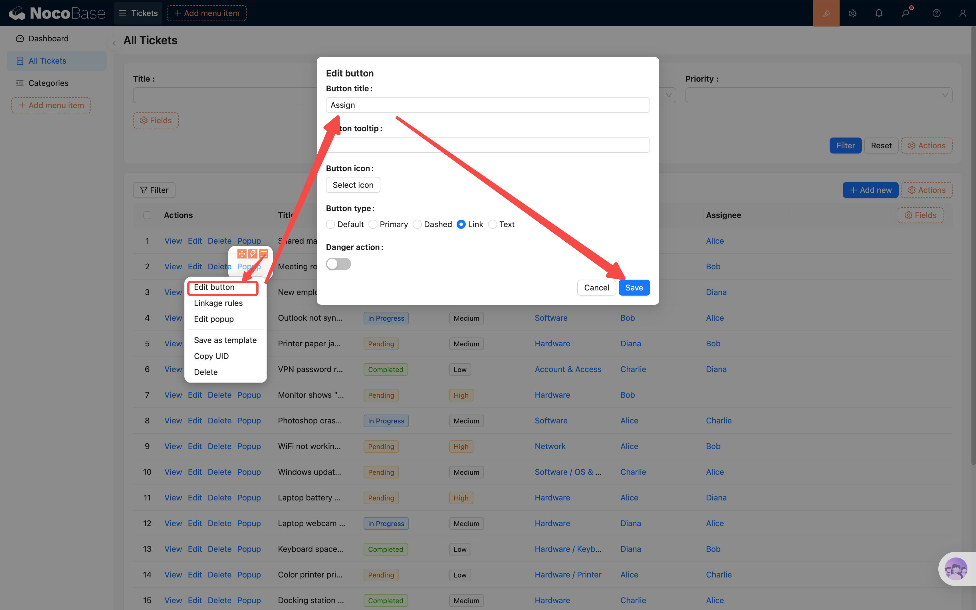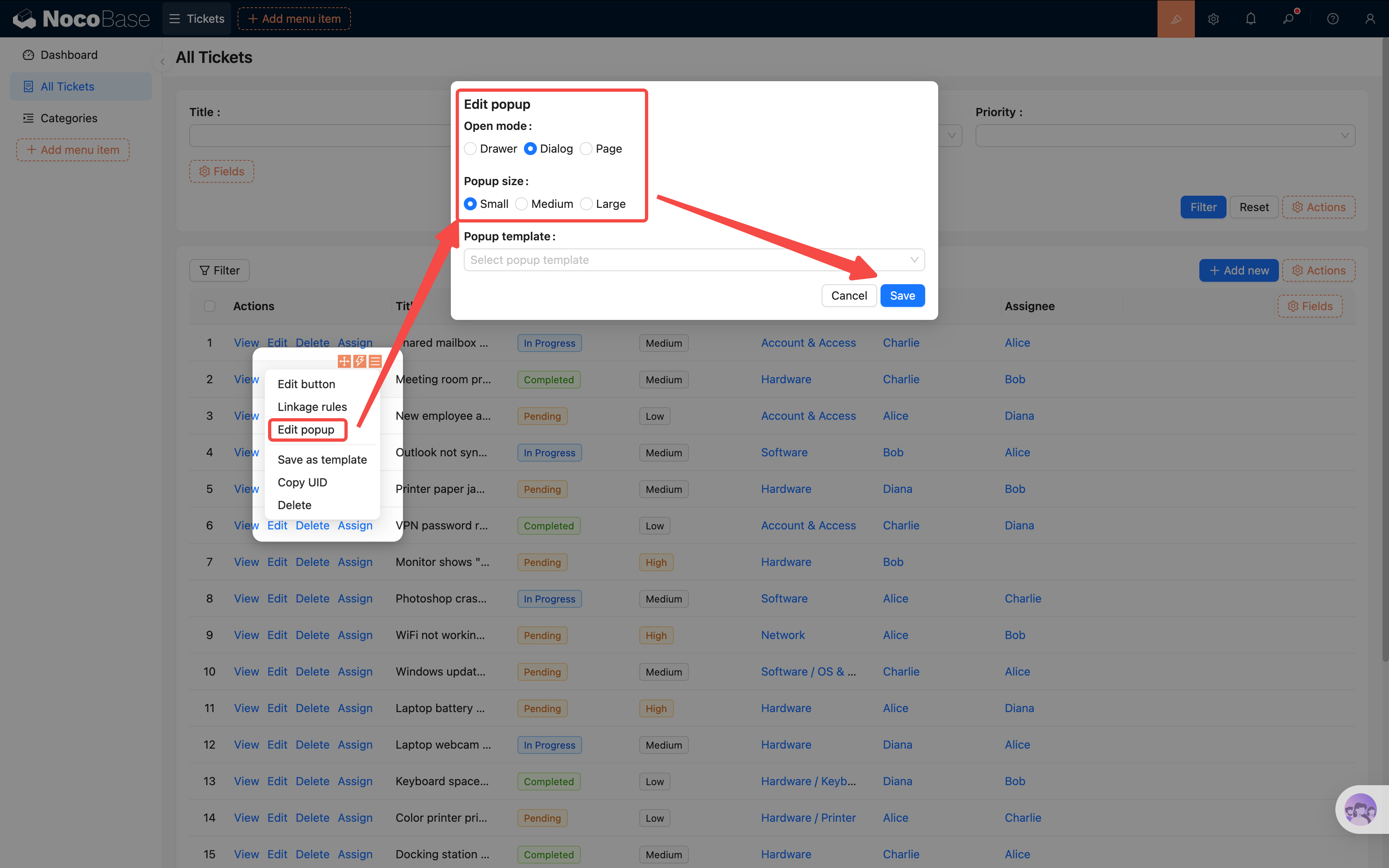 这样,管理员在工单列表中点击「分配」,弹出一个极简表单,选择处理人后提交即可。快速、精准,不会误改其他字段。