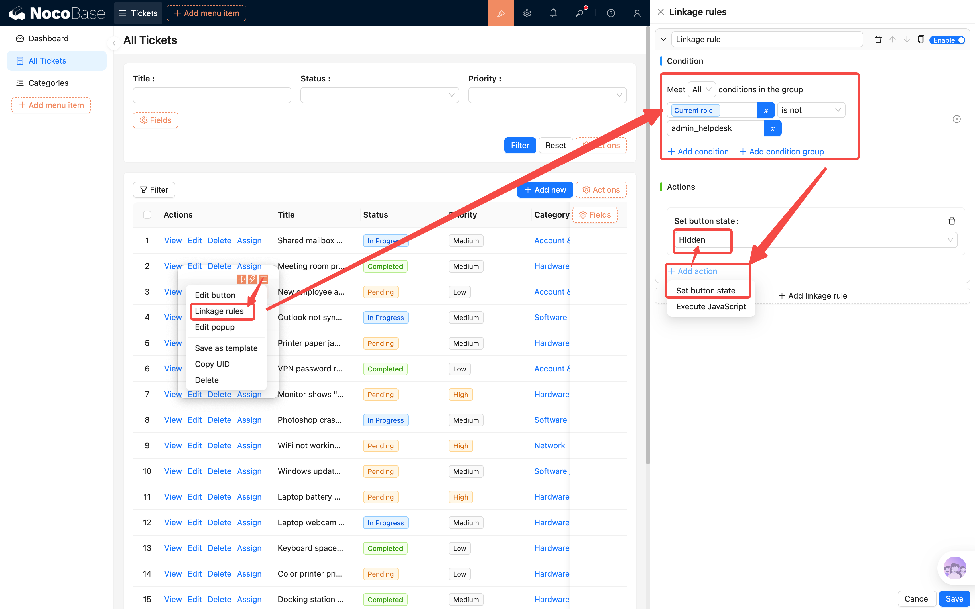 「分配」按钮只有管理员才需要用,普通用户和技术员看到它反而造成困惑。我们可以用联动规则根据当前用户的角色来控制按钮的显示/隐藏: