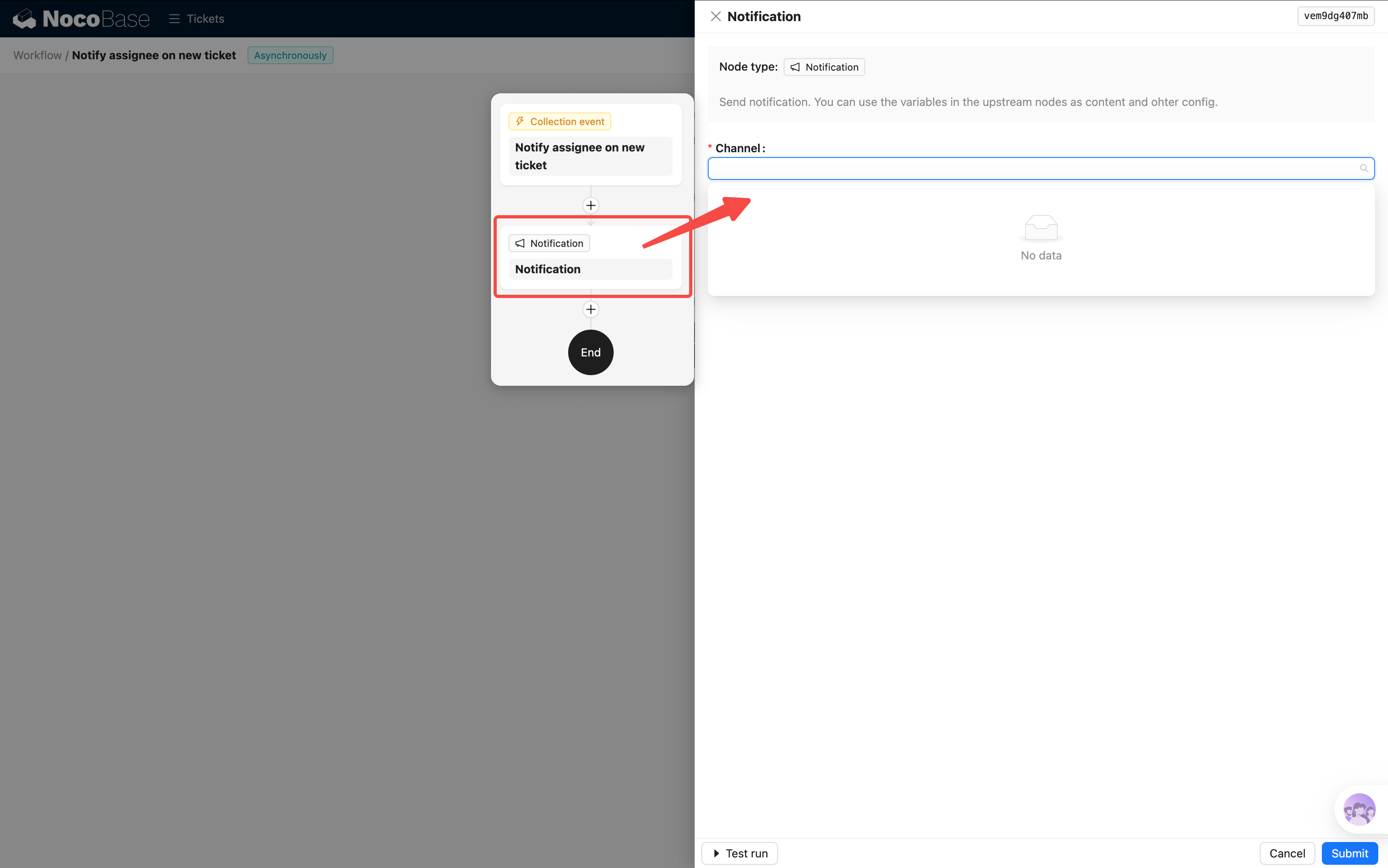 打开通知节点的配置,第一项就是选择 通知渠道——但我们还没有创建过渠道,下拉列表是空的。先去创建一个。