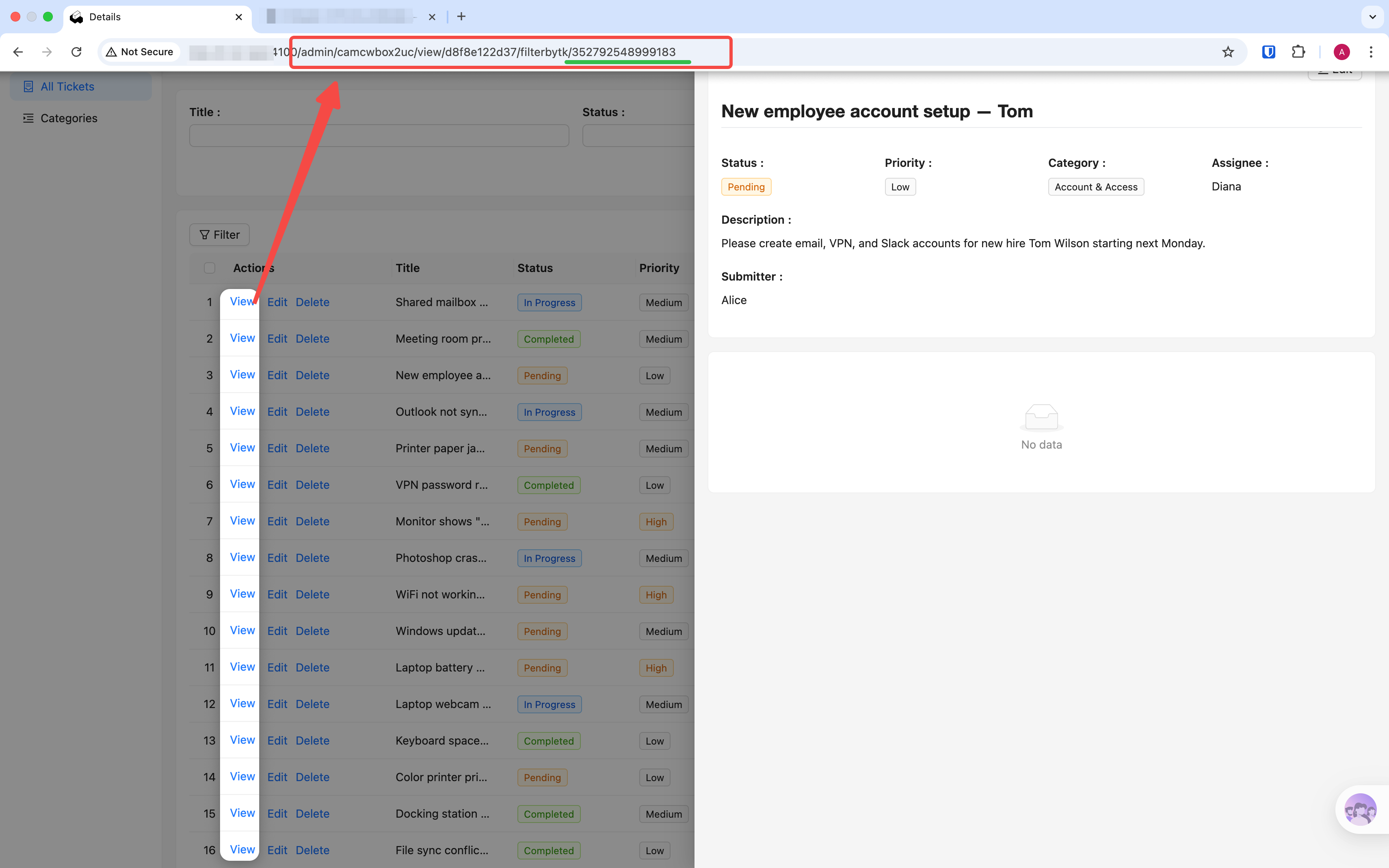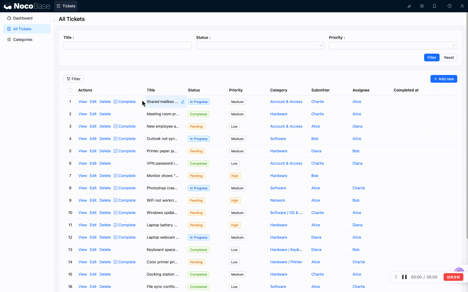 然后打开一条状态为"处理中"的工单,在操作列中点击 「完成」 按钮。刷新页面后,可以看到:
