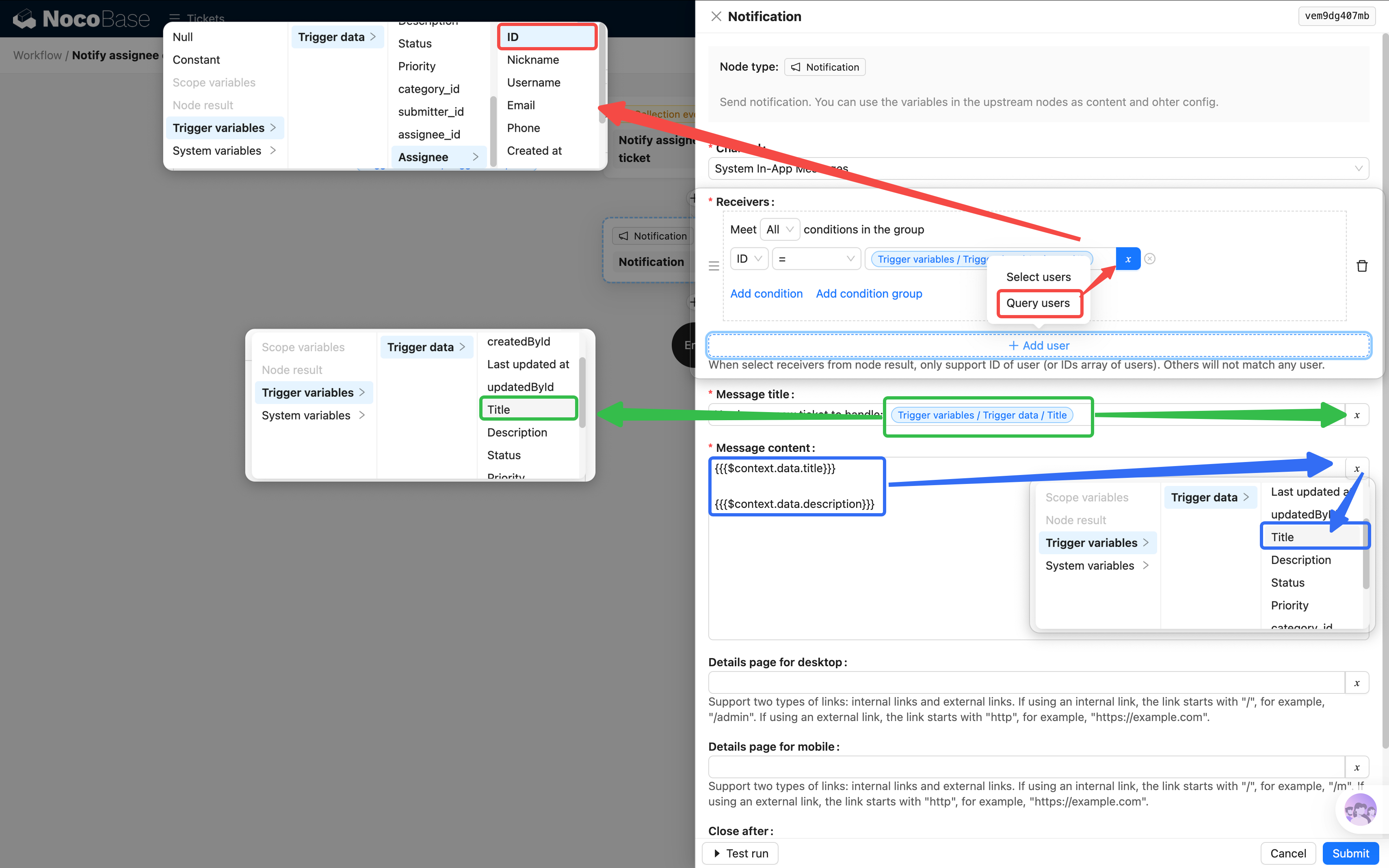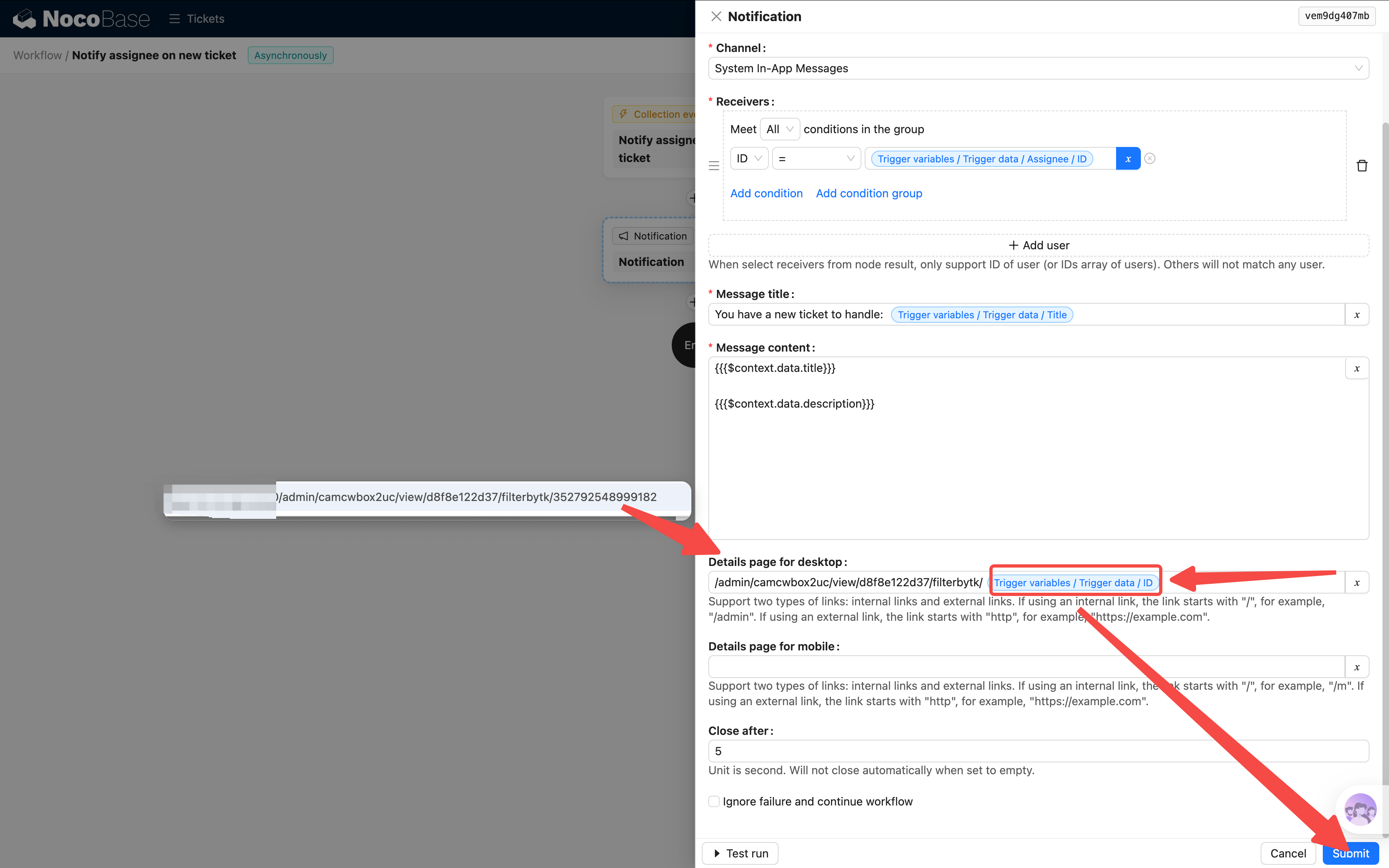 /admin/camcwbox2uc/view/d8f8e122d37/filterbytk/353072988225540。将路径粘贴到配置框中,其中 filterbytk/ 后面的数字就是工单 ID——把这部分替换为触发数据的 ID 变量即可(点击变量选择器 → 触发数据 → ID)。配置后,用户在通知列表中点击该通知就能直接跳转到对应工单的详情页,同时自动标记为已读