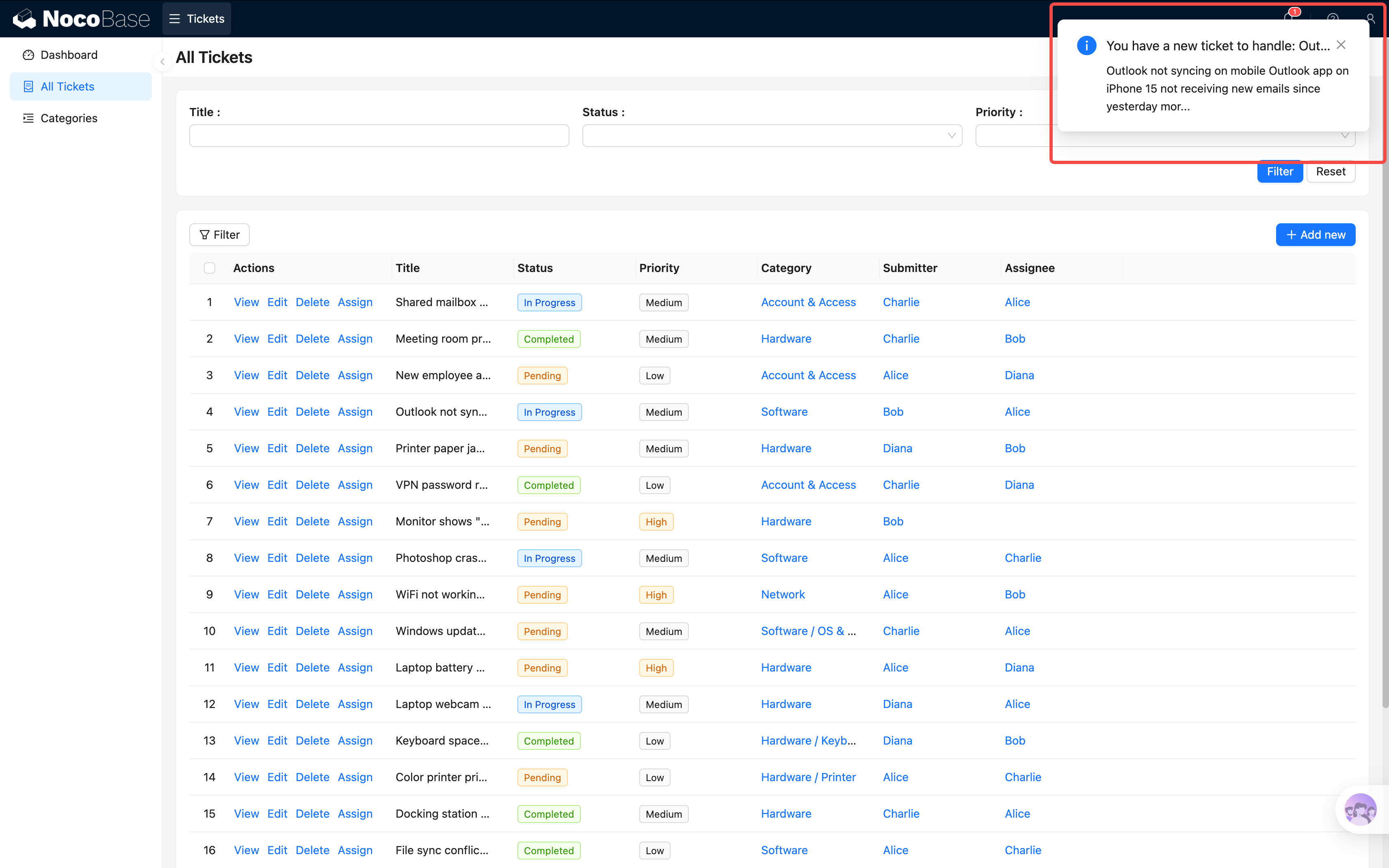 回到工单页面,创建一条新工单,记得选一个处理人。然后切换到处理人的账号登录,检查通知中心——应该能看到一条新通知。