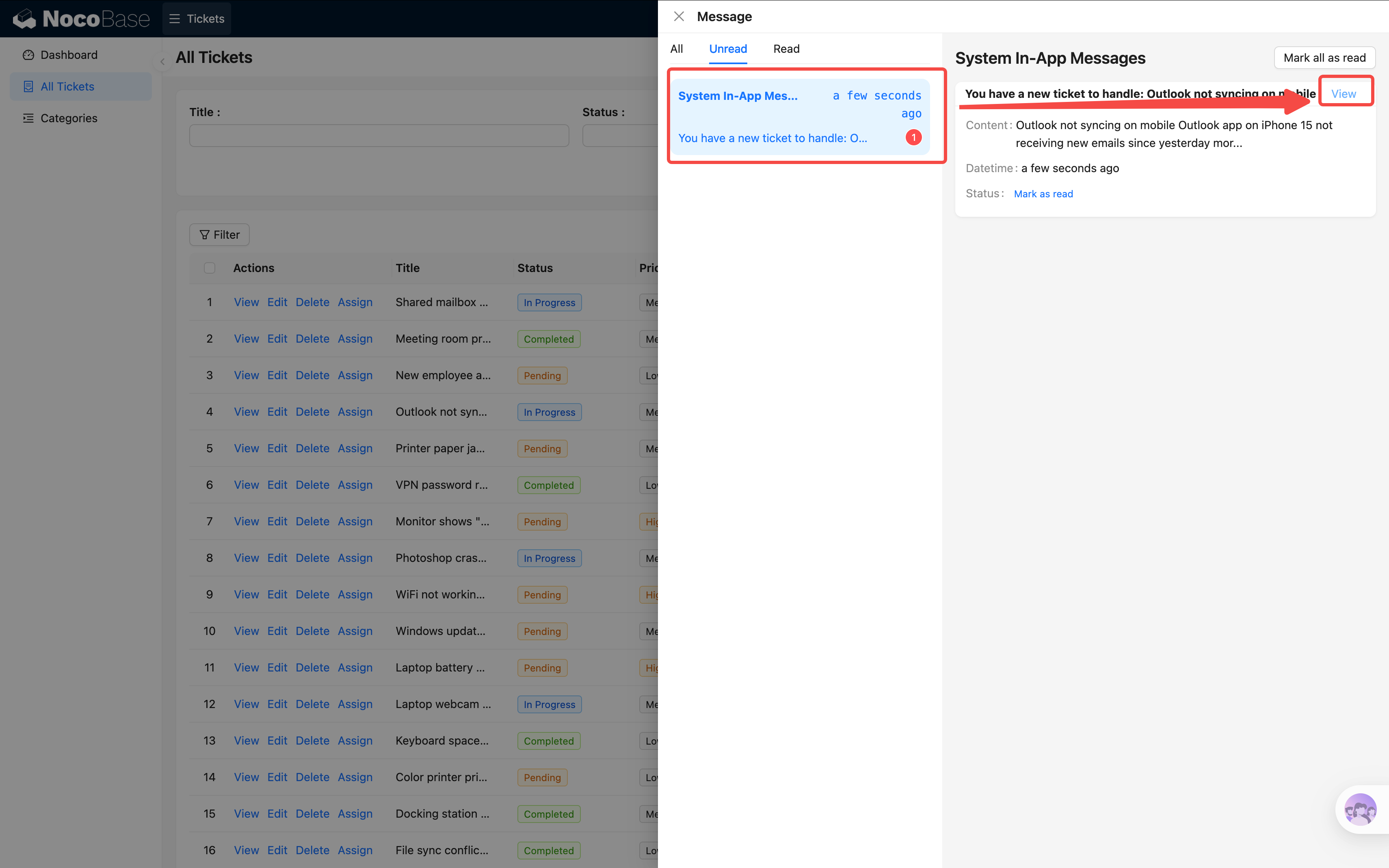 通知发出后,处理人可以在页面右上角的 通知中心 里看到这条消息,未读的还会有红点提示。点击通知即可跳转到工单详情页查看完整信息。