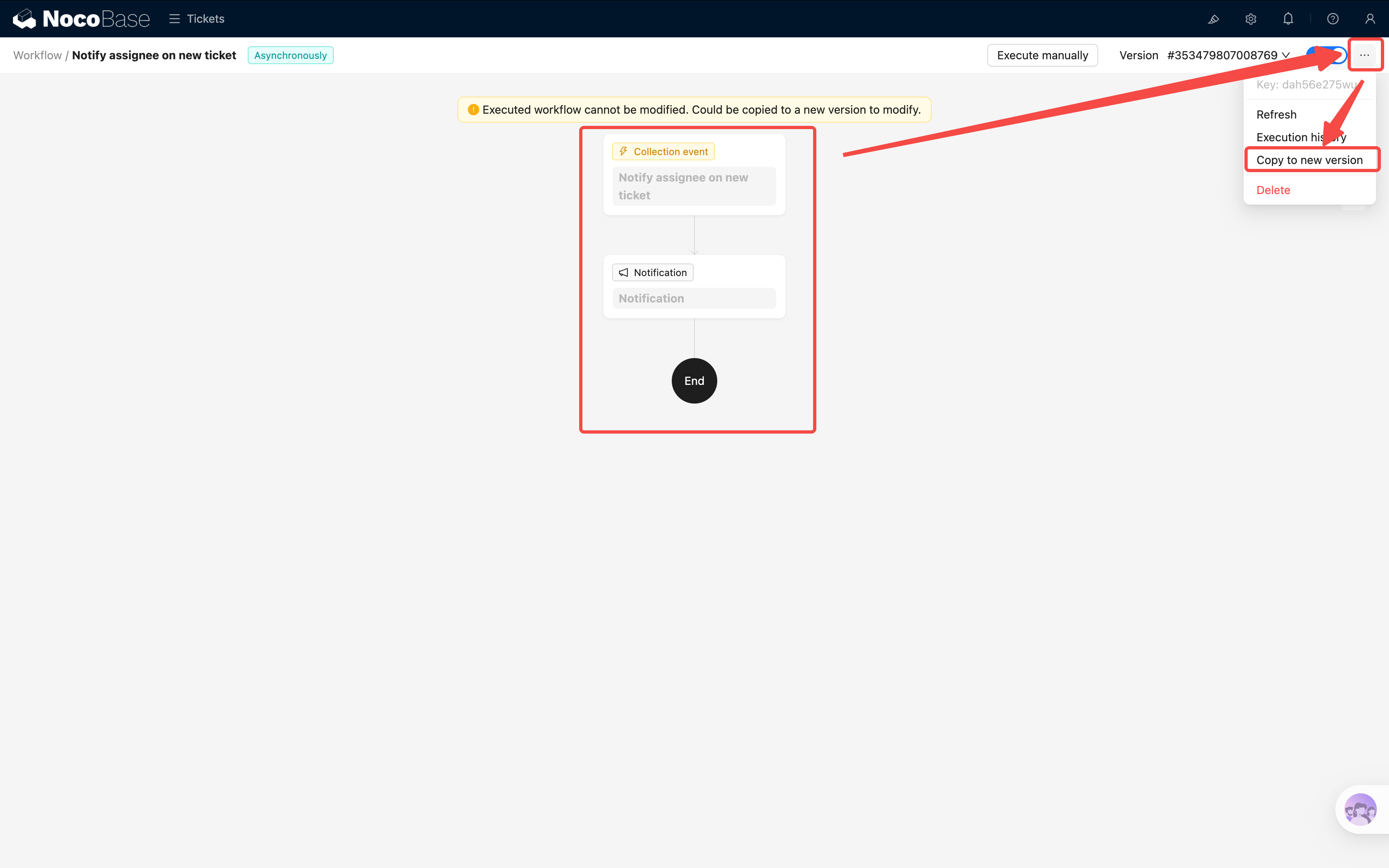 注意:工作流一旦被执行过(包括手动执行),就会变成只读状态(灰色),不能再编辑。如果需要修改,点击右上角的 「复制到新版本」,在新版本上继续编辑。旧版本会自动停用。