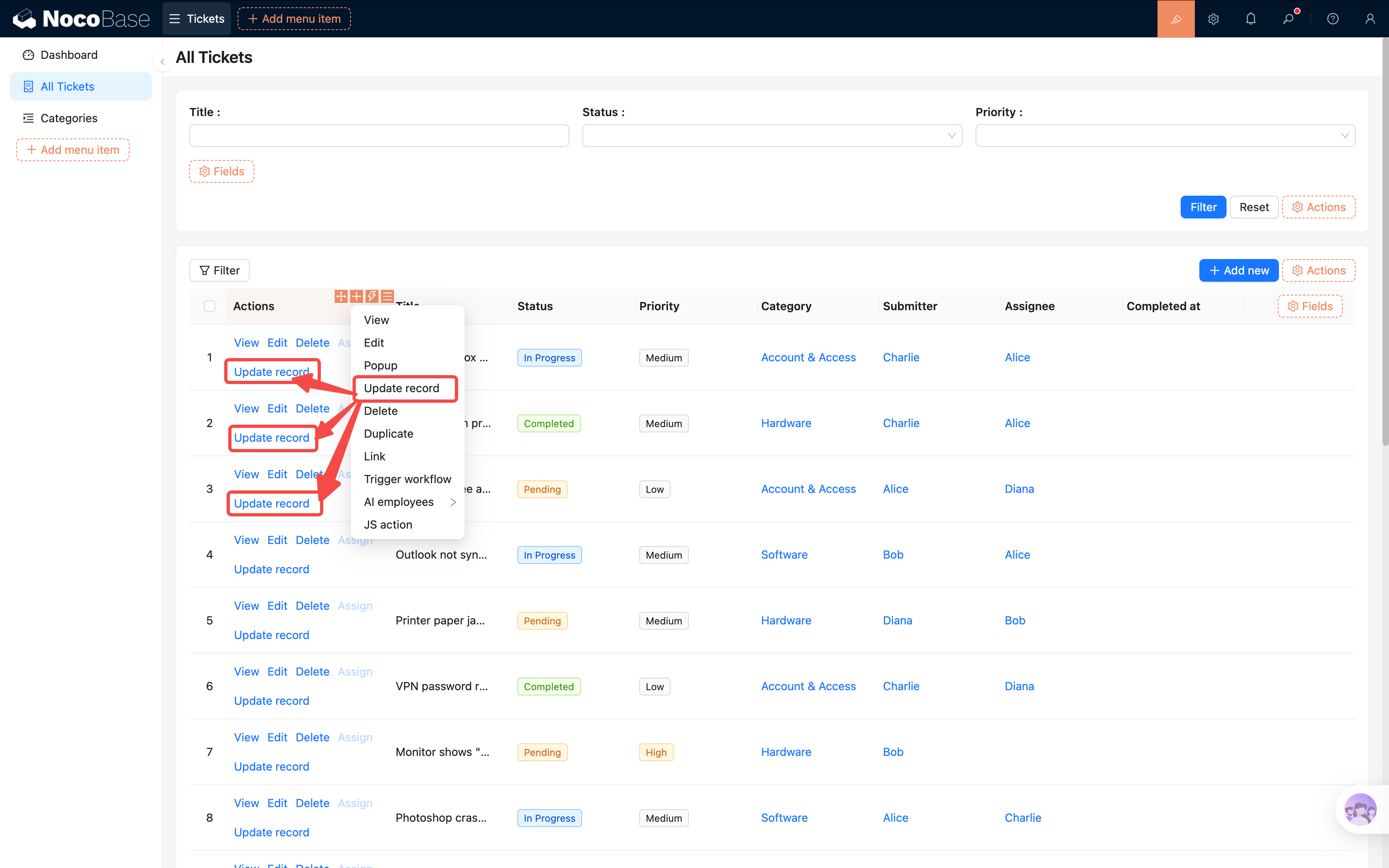 | 数据表事件 | 数据新增、更新或删除时触发 | 新工单通知、状态变更记录 |