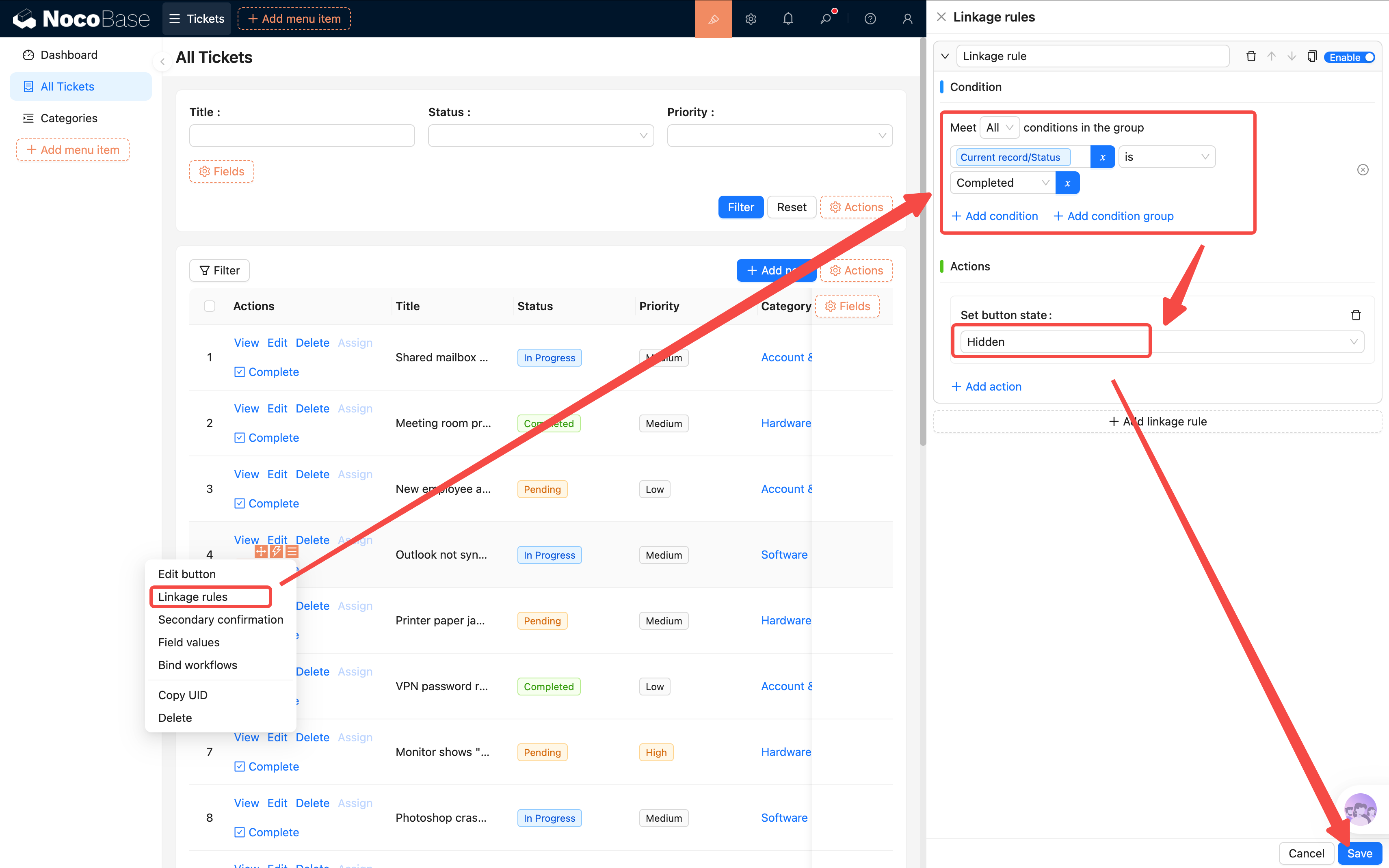 给按钮配置 联动规则:当工单状态已经是"已完成"时,隐藏这个按钮(已完成的工单不需要再点"完成")