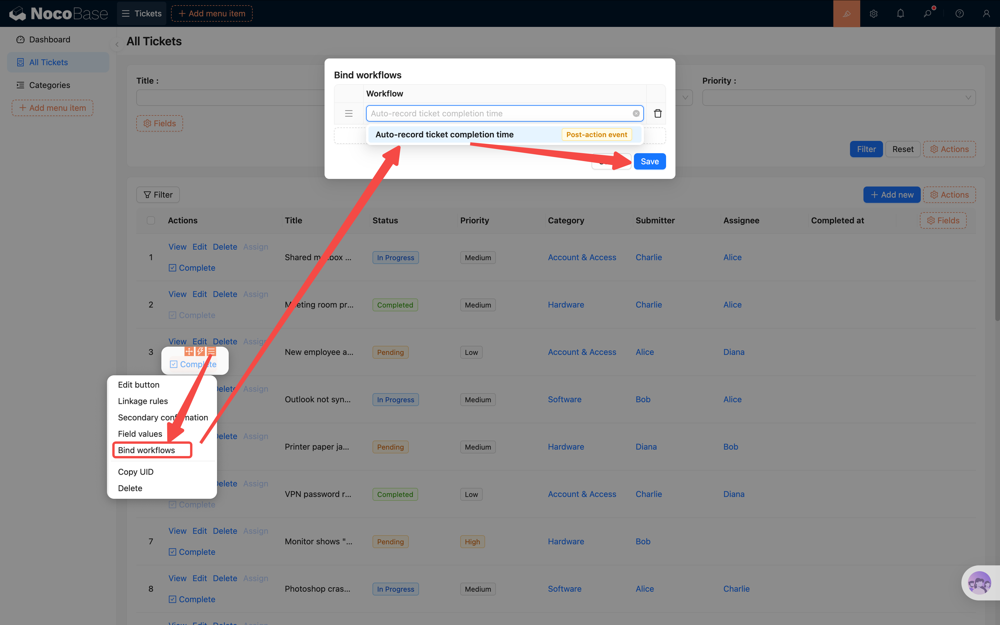 工作流配好了,但"操作后事件"需要绑定到一个具体的操作按钮上才会触发。我们在工单列表的操作列中创建一个专用的"完成"按钮:
