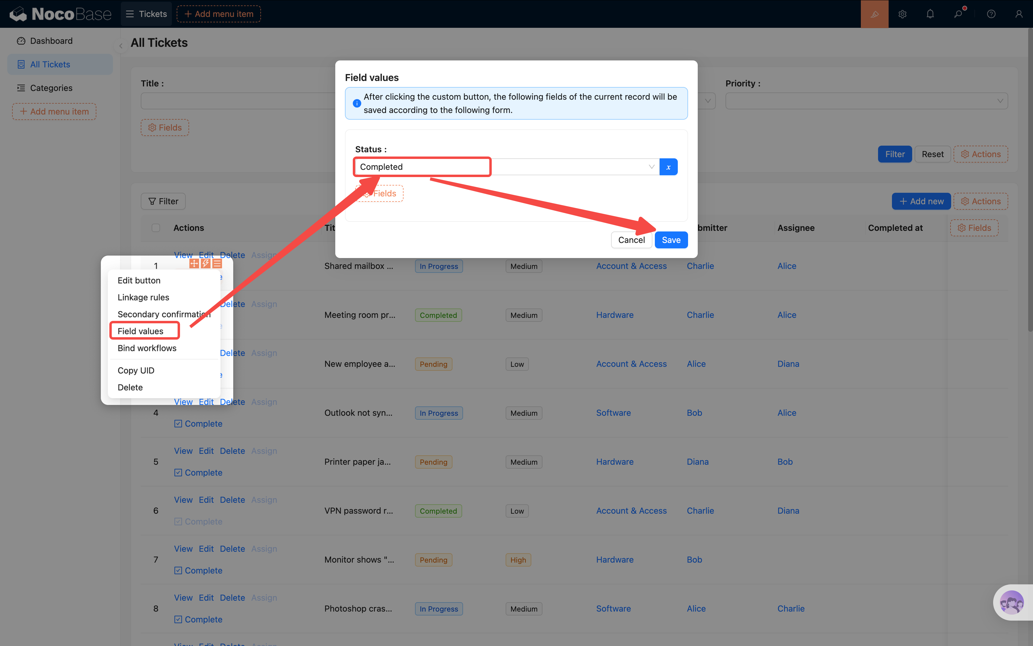 配置“字段值”,设置 “状态 = 已完成”。这样用户点击按钮时,就会触发这个赋值操作。