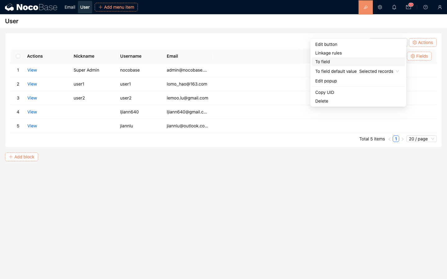 Add a send email button to the table