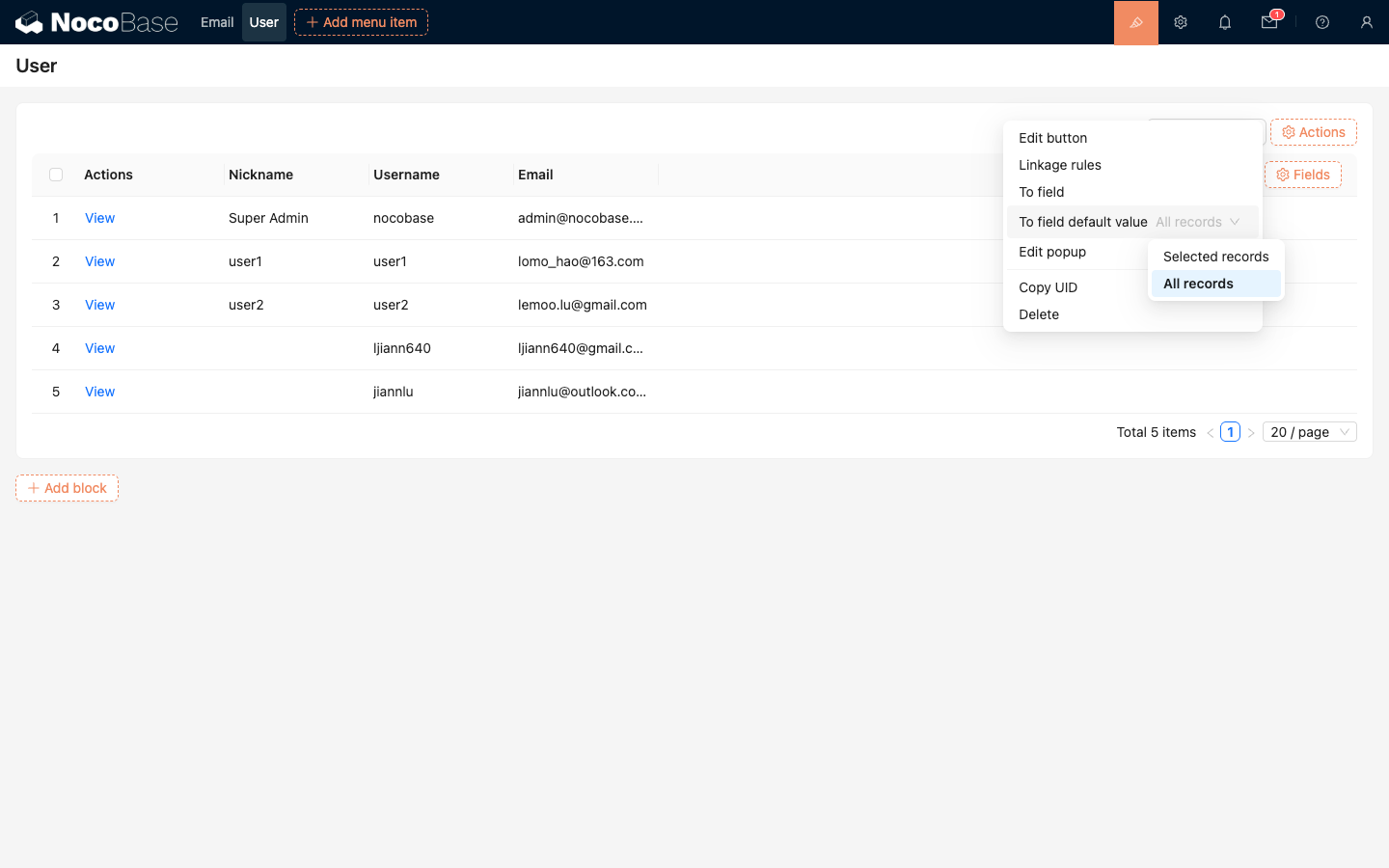 You can configure bulk selection and email sending functionality in a table.