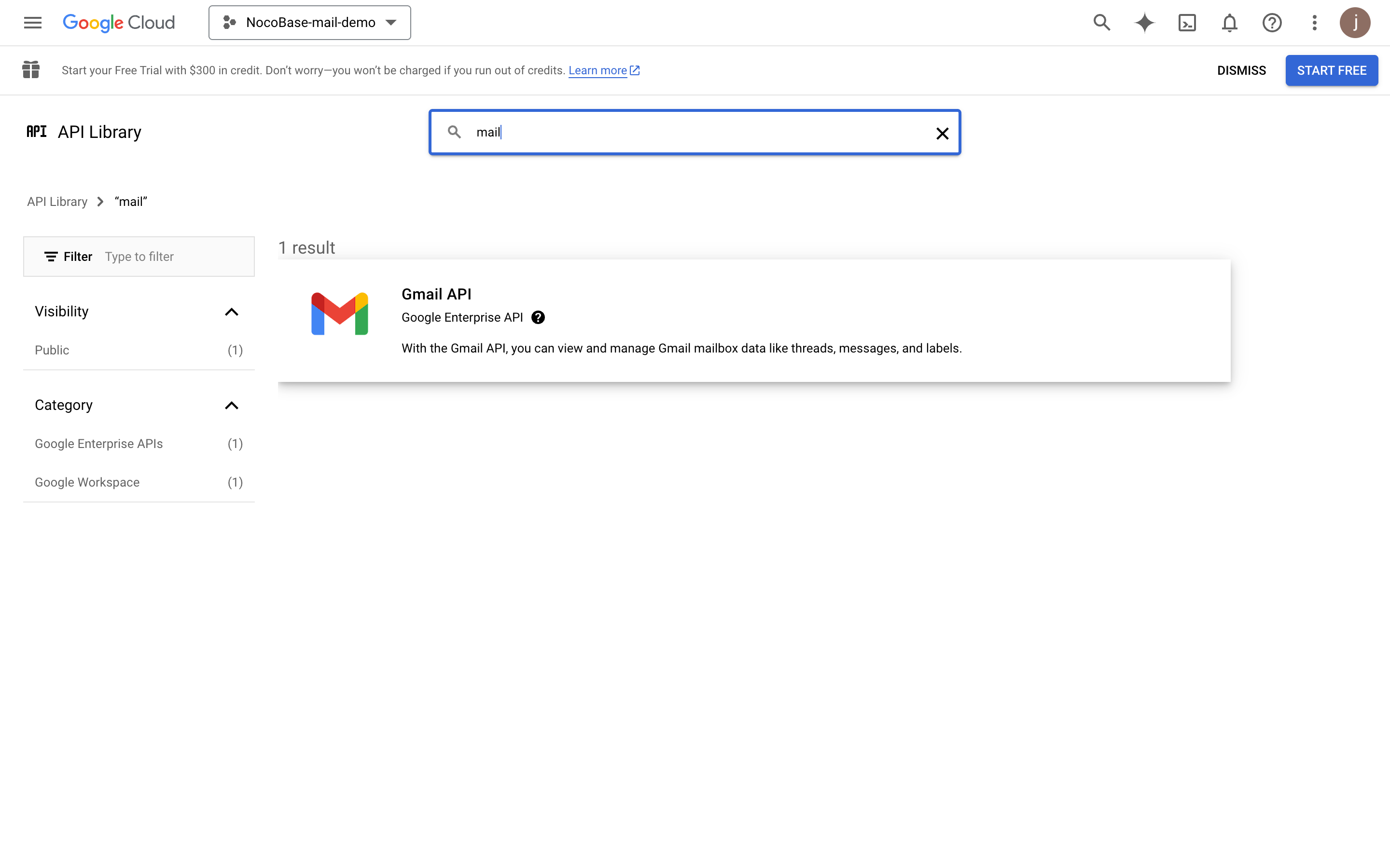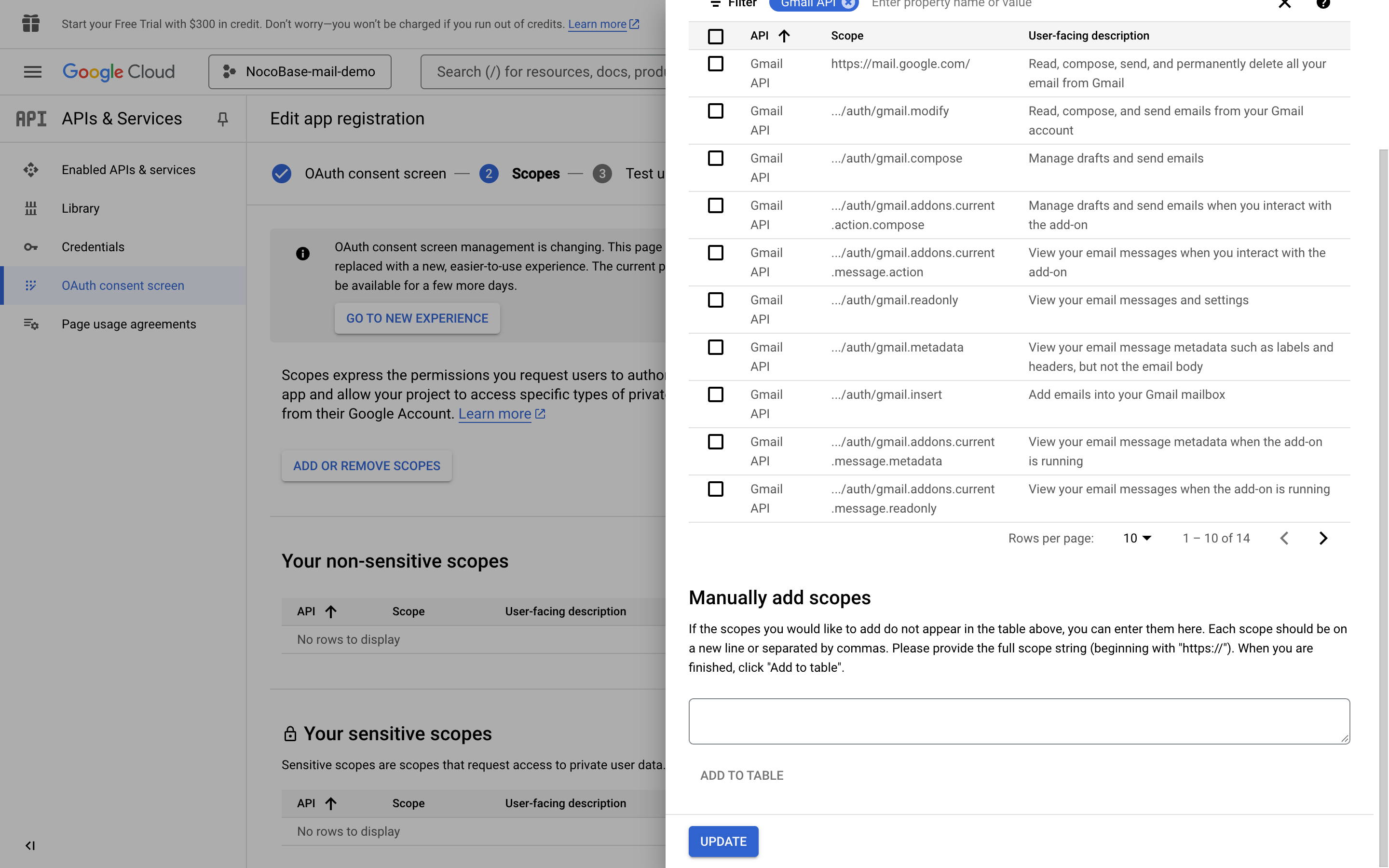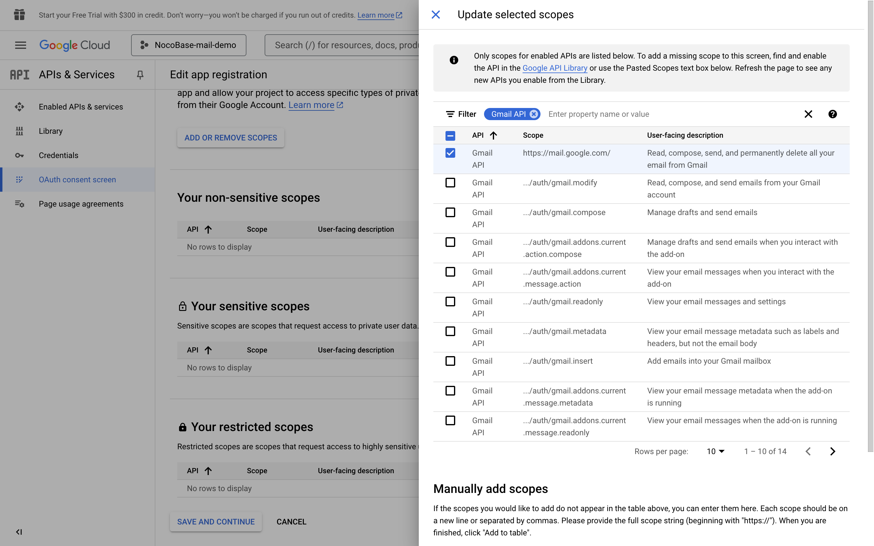 - Search for "Gmail API", then check "Gmail API" (confirm the Scope value is the Gmail API with "https://mail.google.com/").