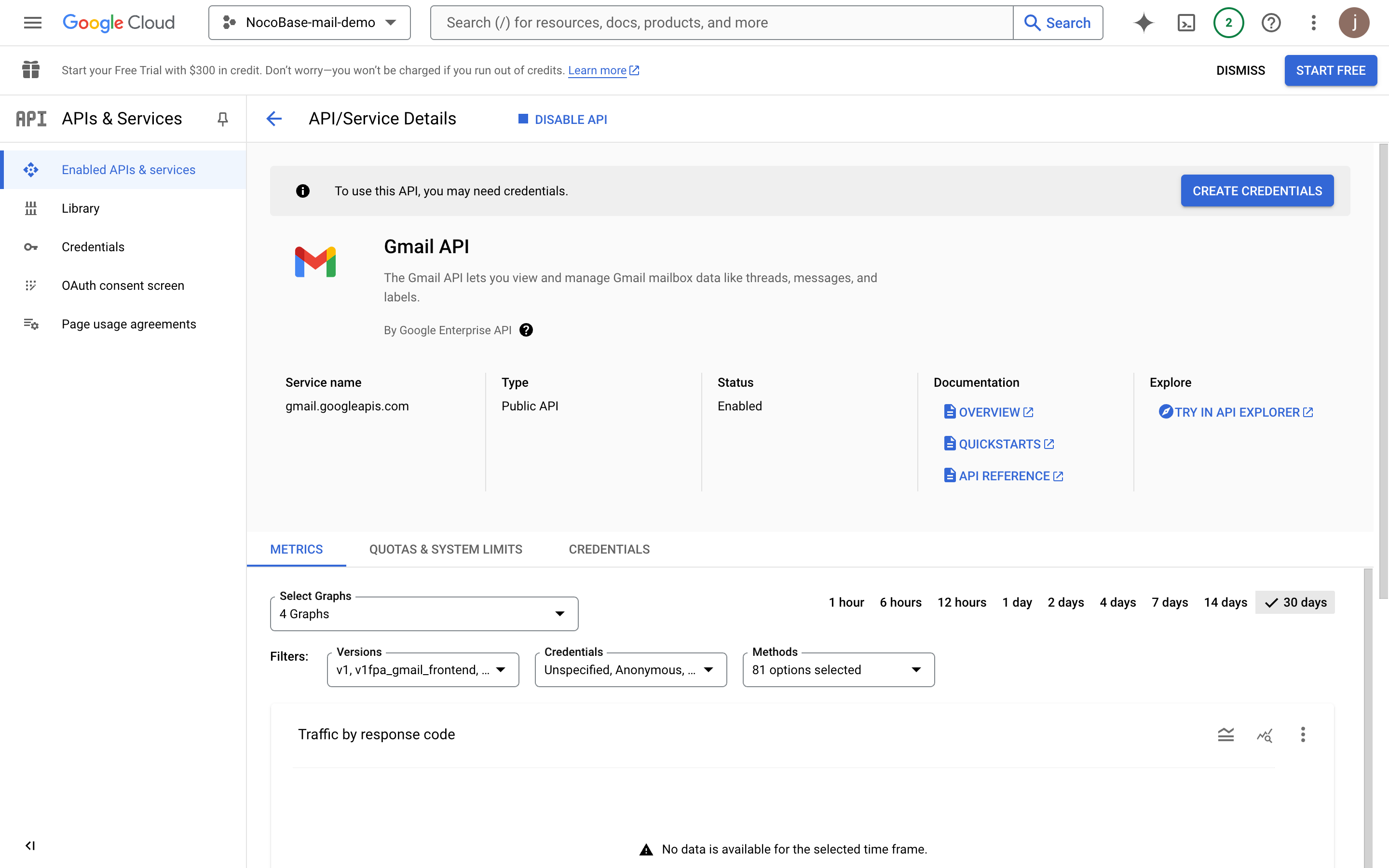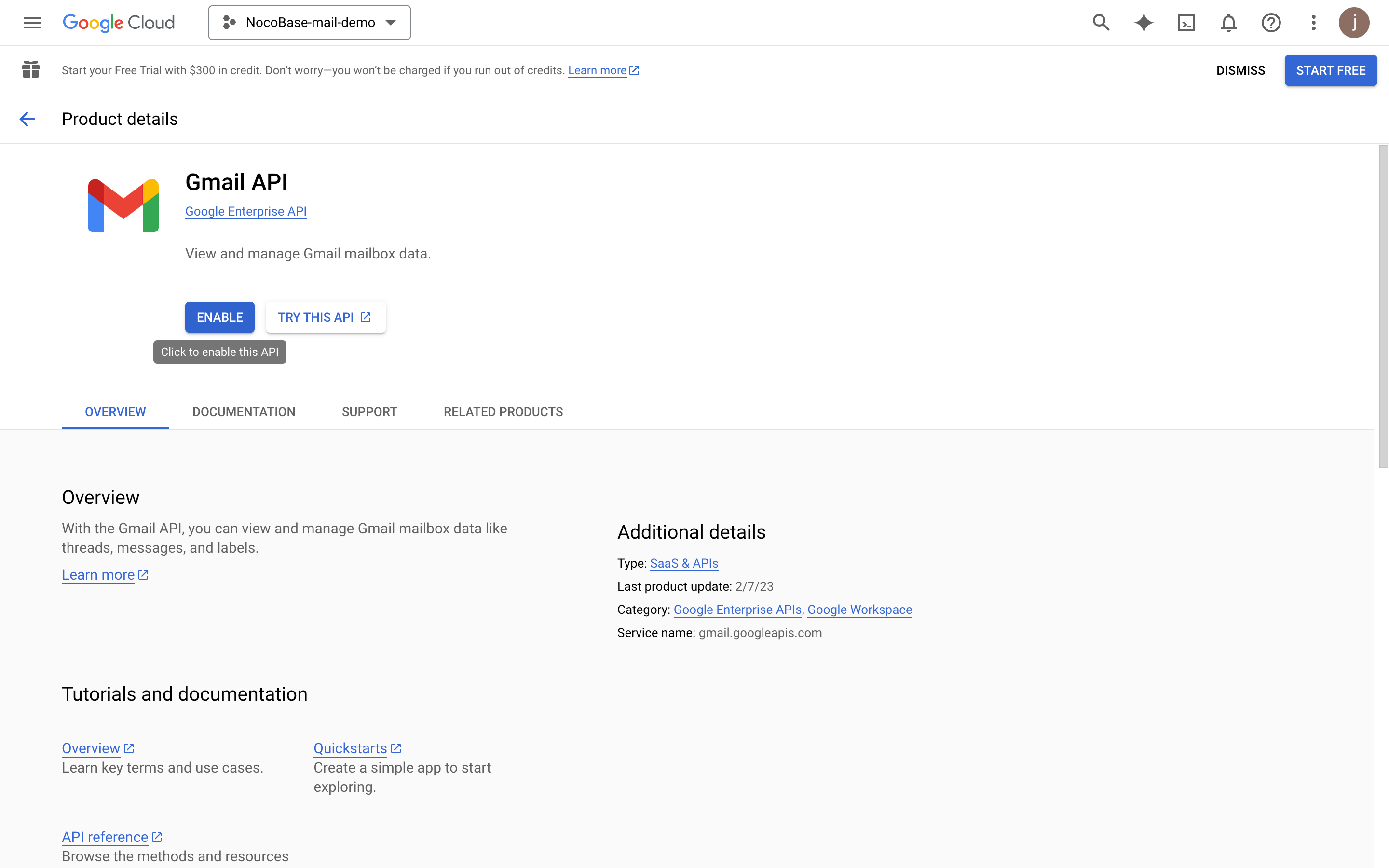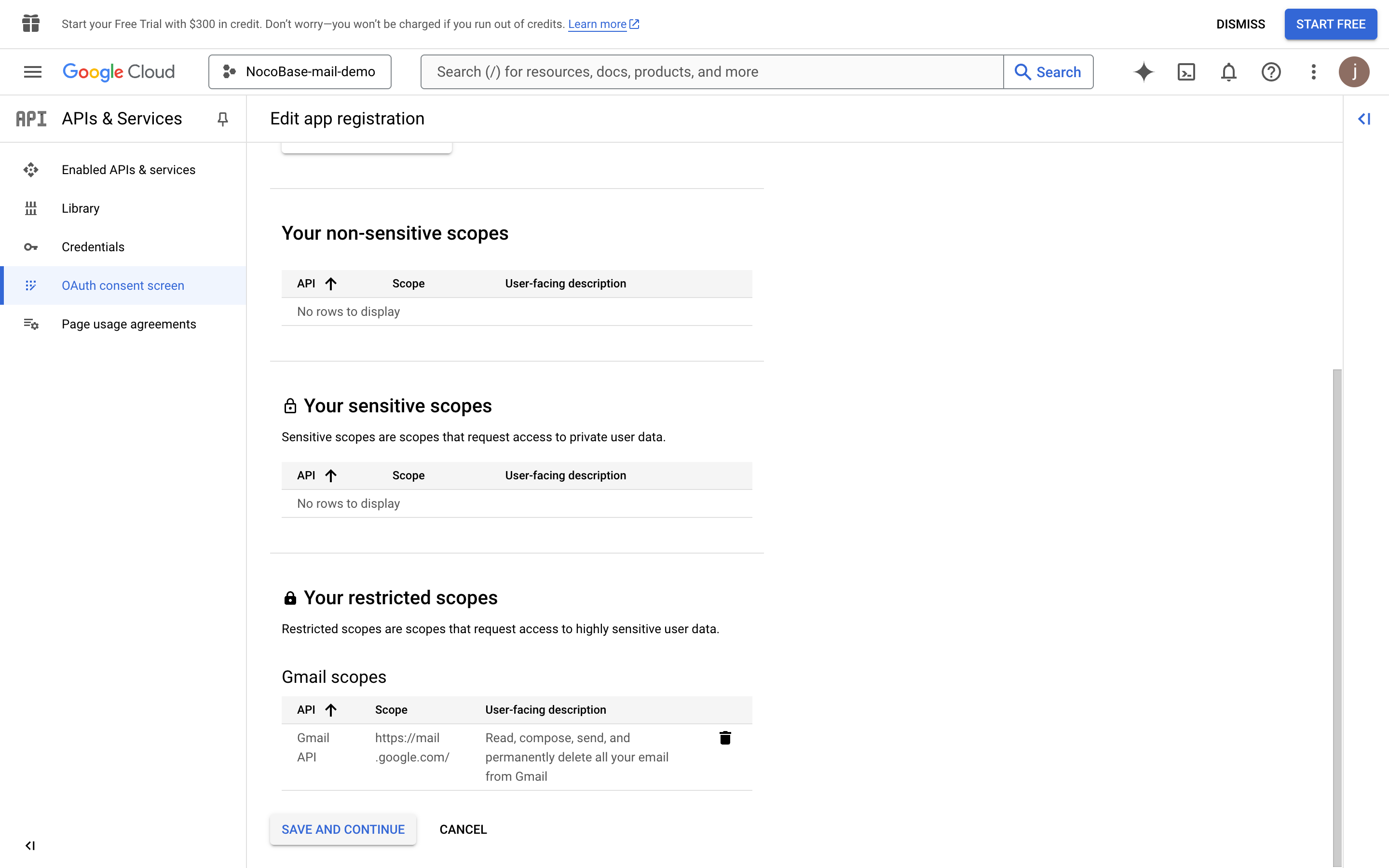 - Search for "Gmail API", then check "Gmail API" (confirm the Scope value is the Gmail API with "https://mail.google.com/").