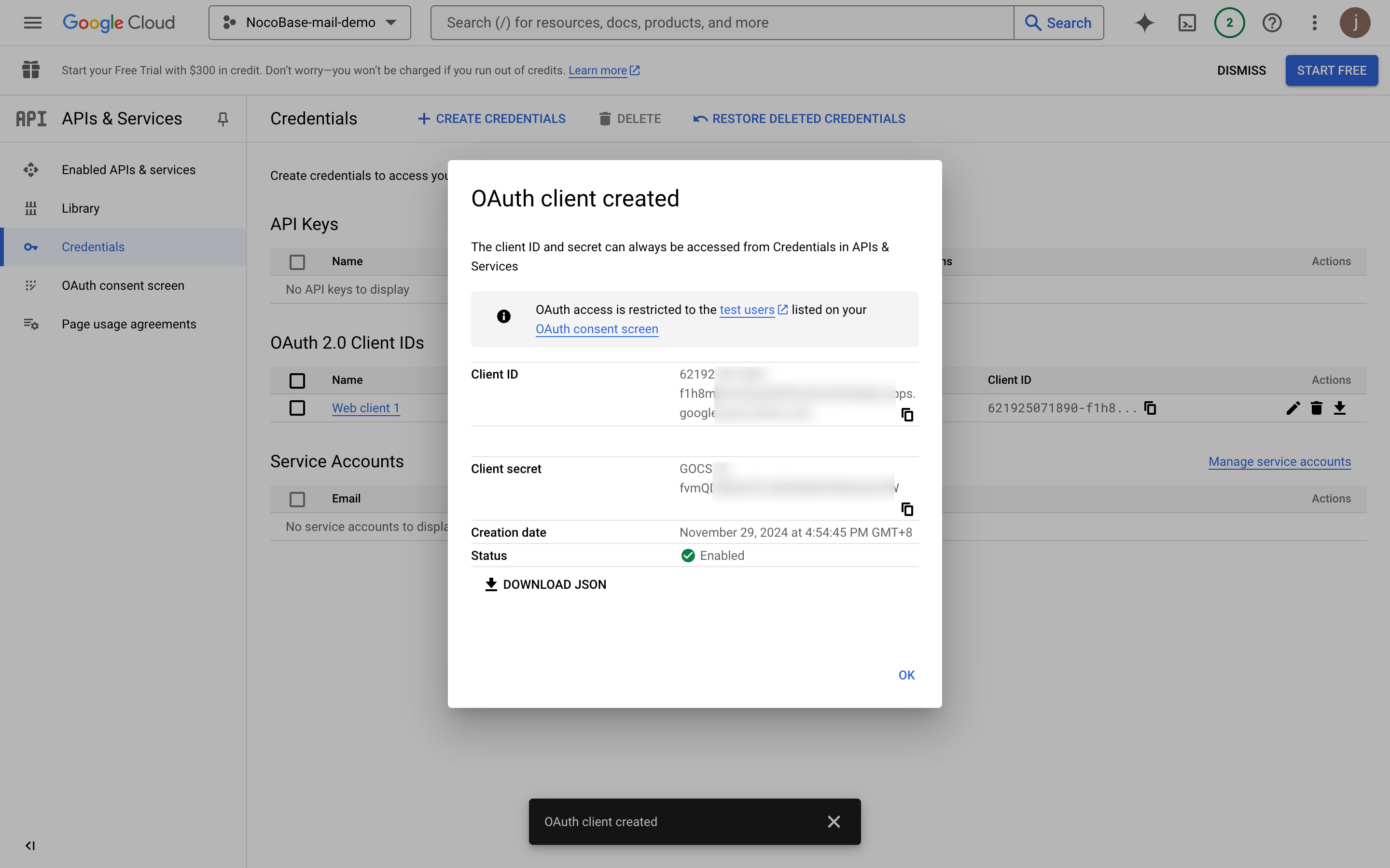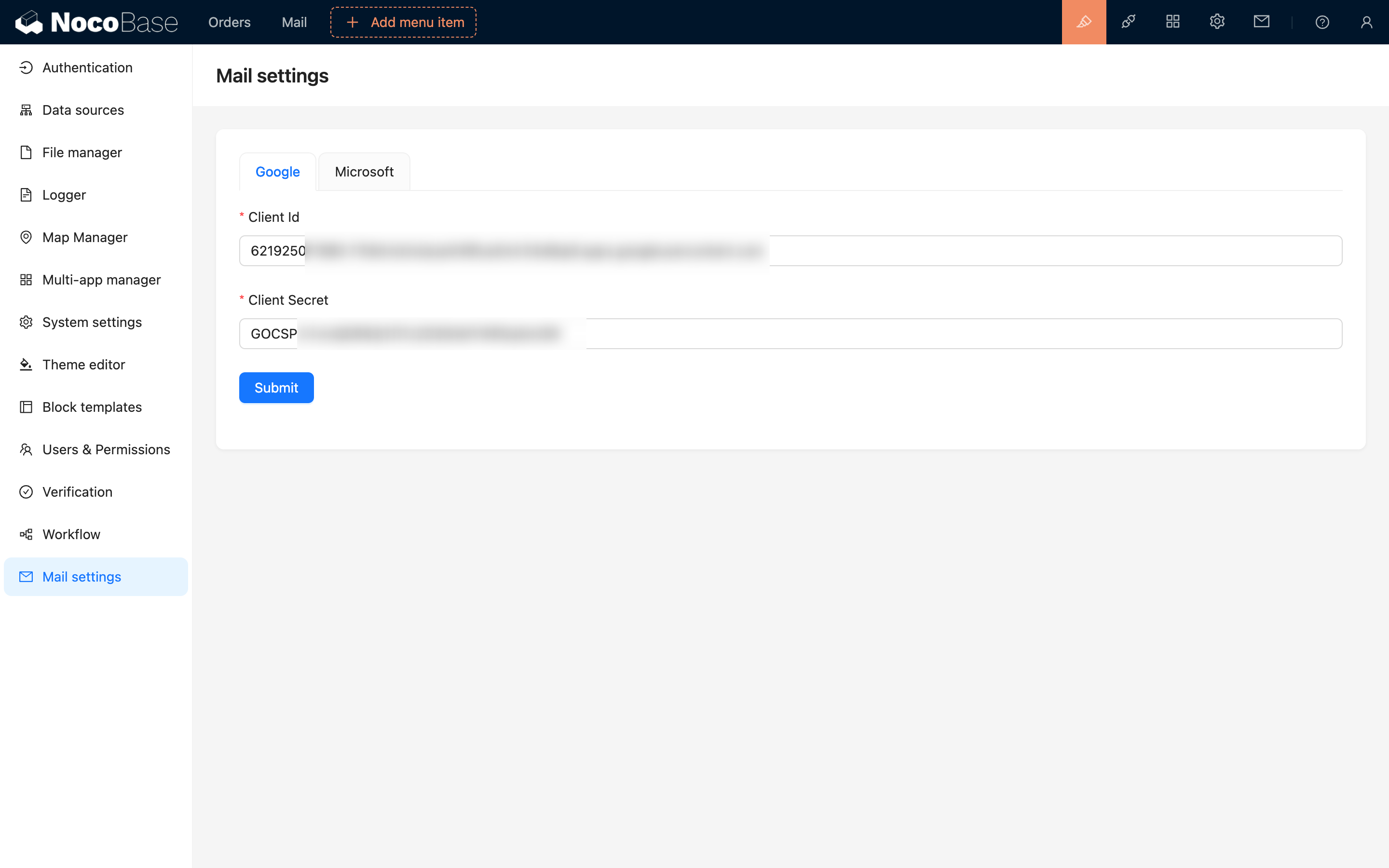 - Copy the Client ID and Client secret and paste them into the email configuration page.