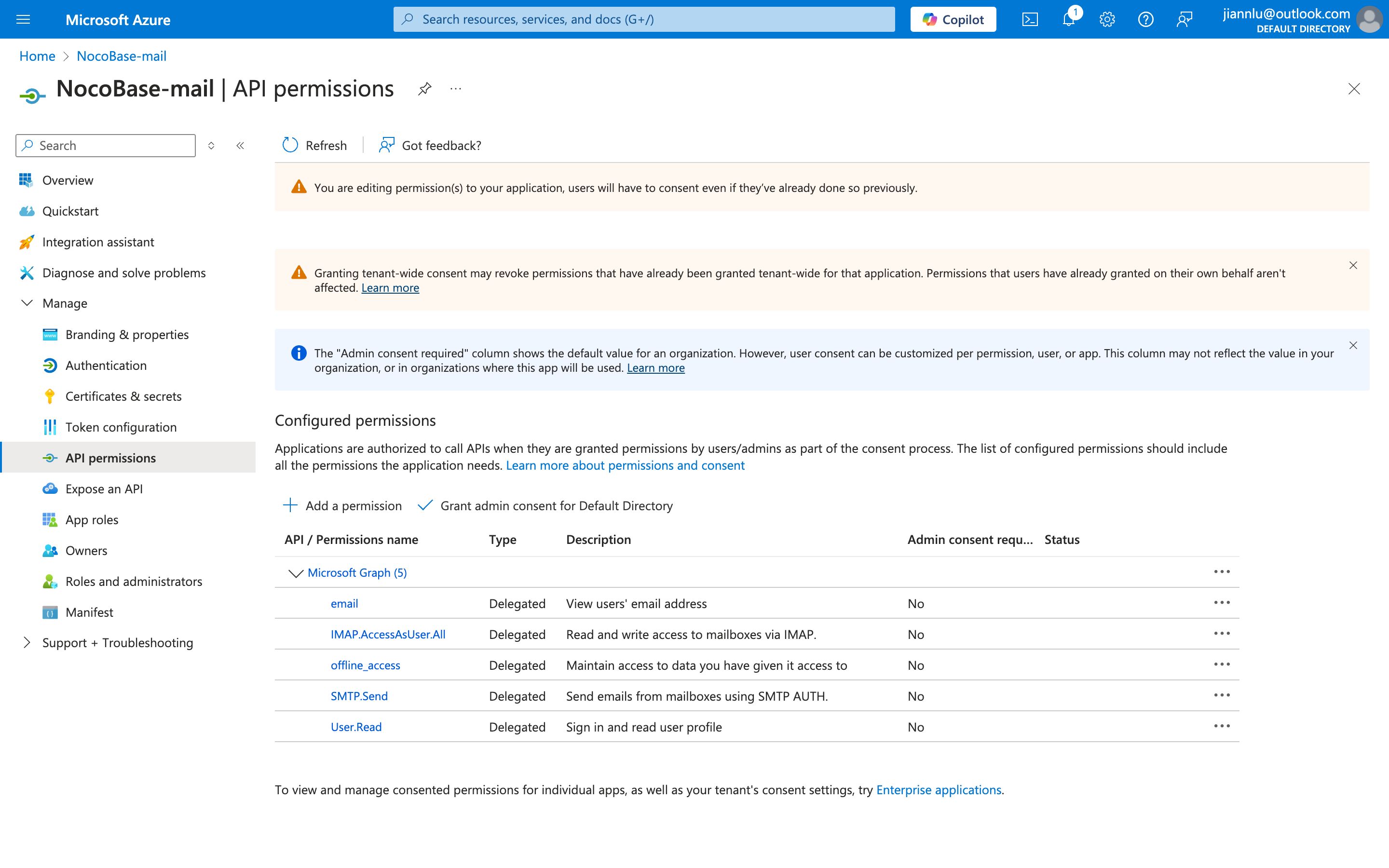 "email""offline_access""IMAP.AccessAsUser.All""SMTP.Send""offline_access""User.Read" (By default)