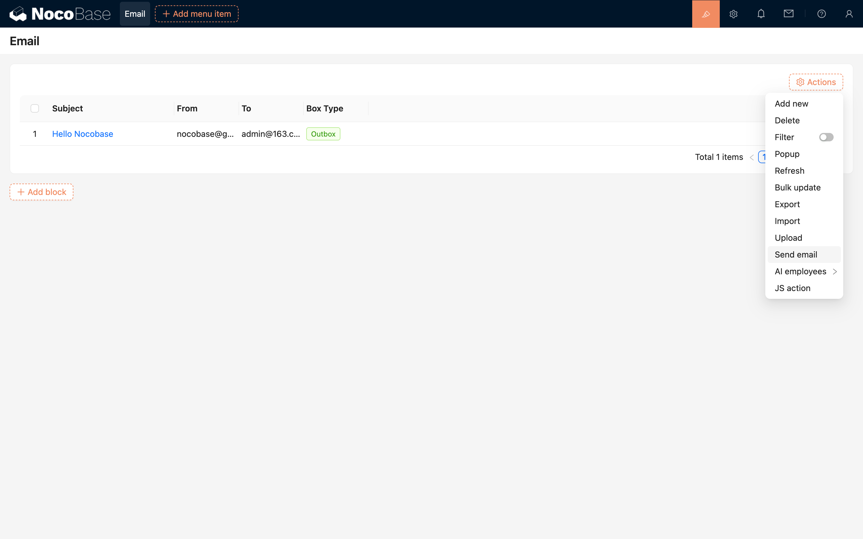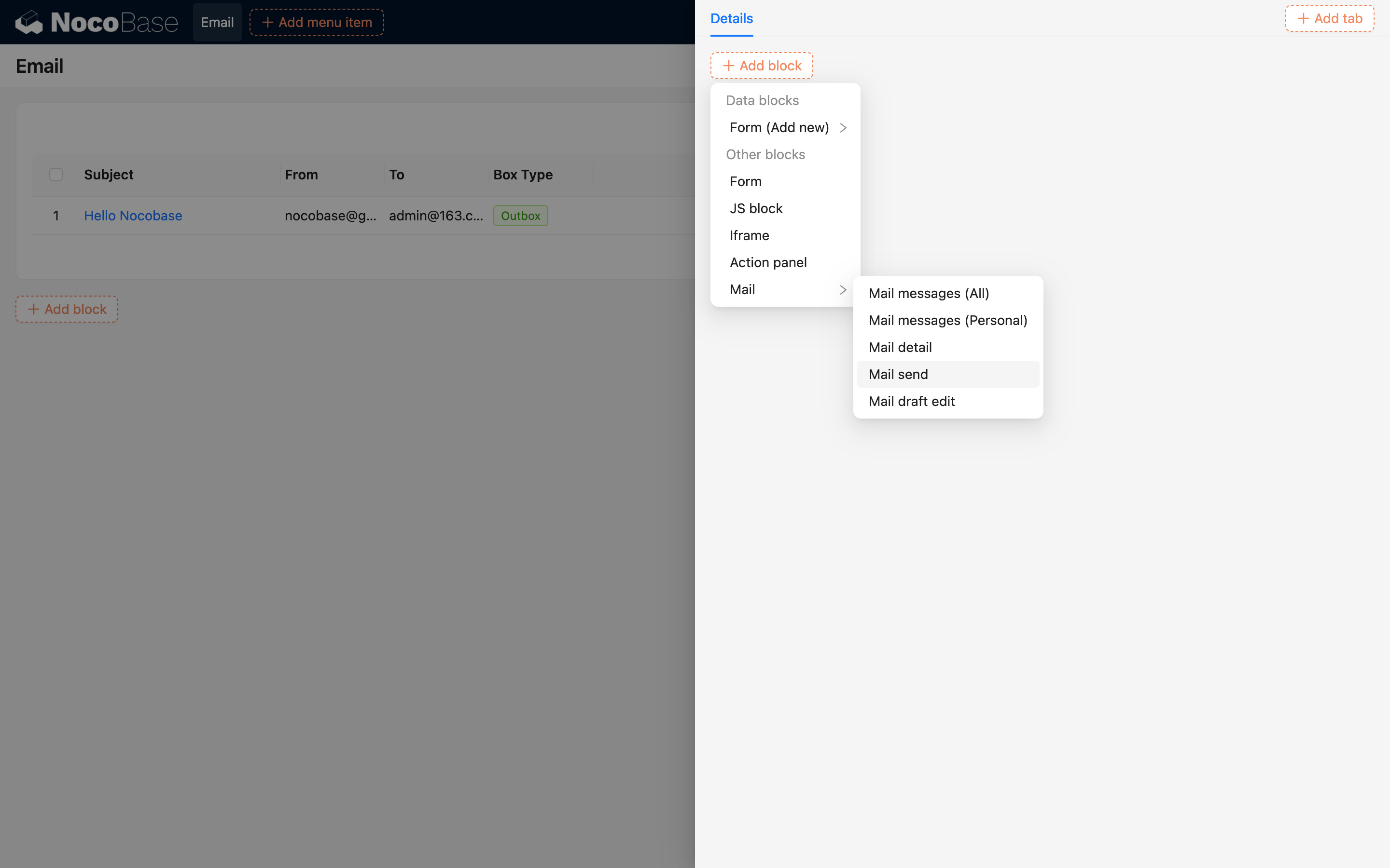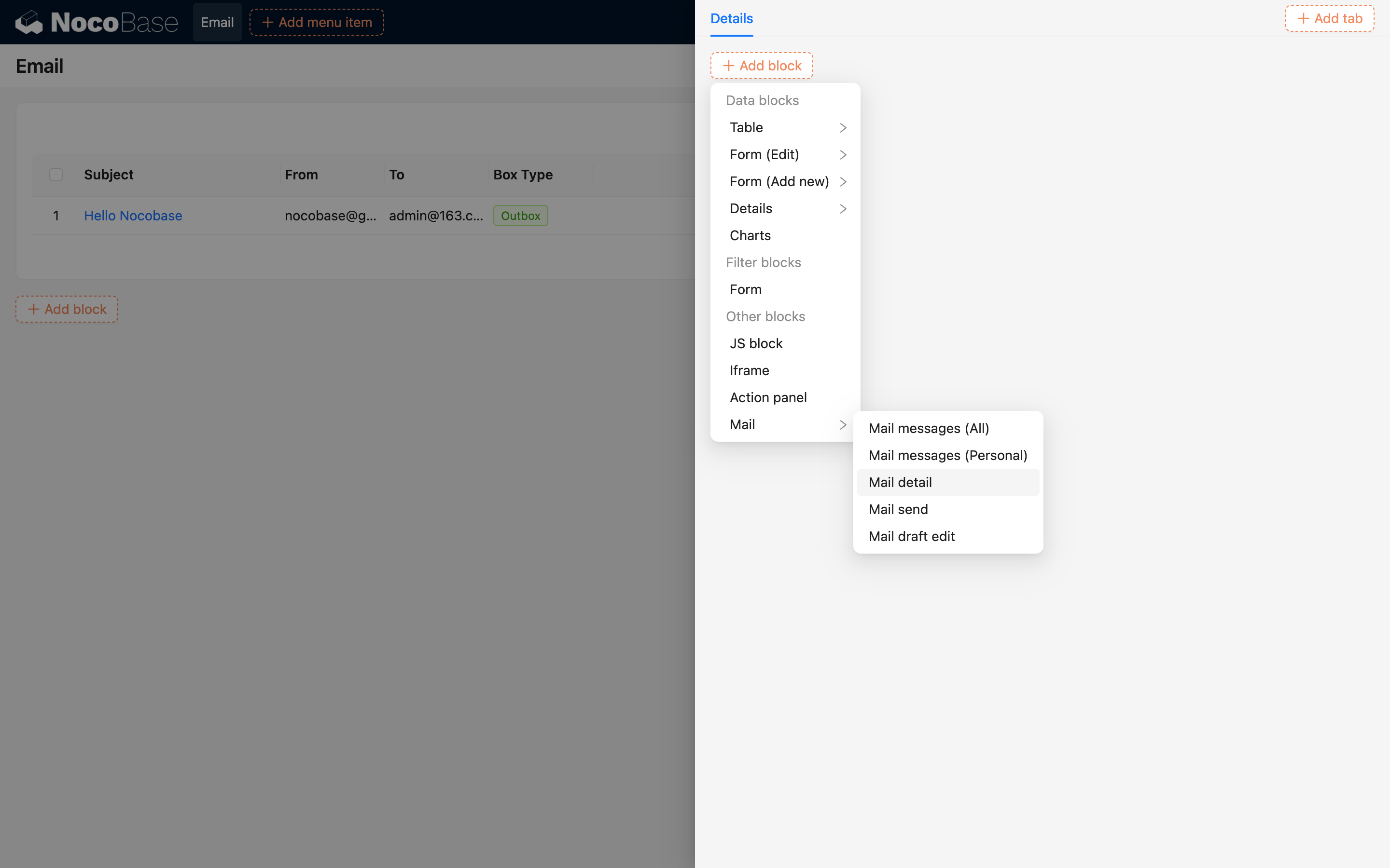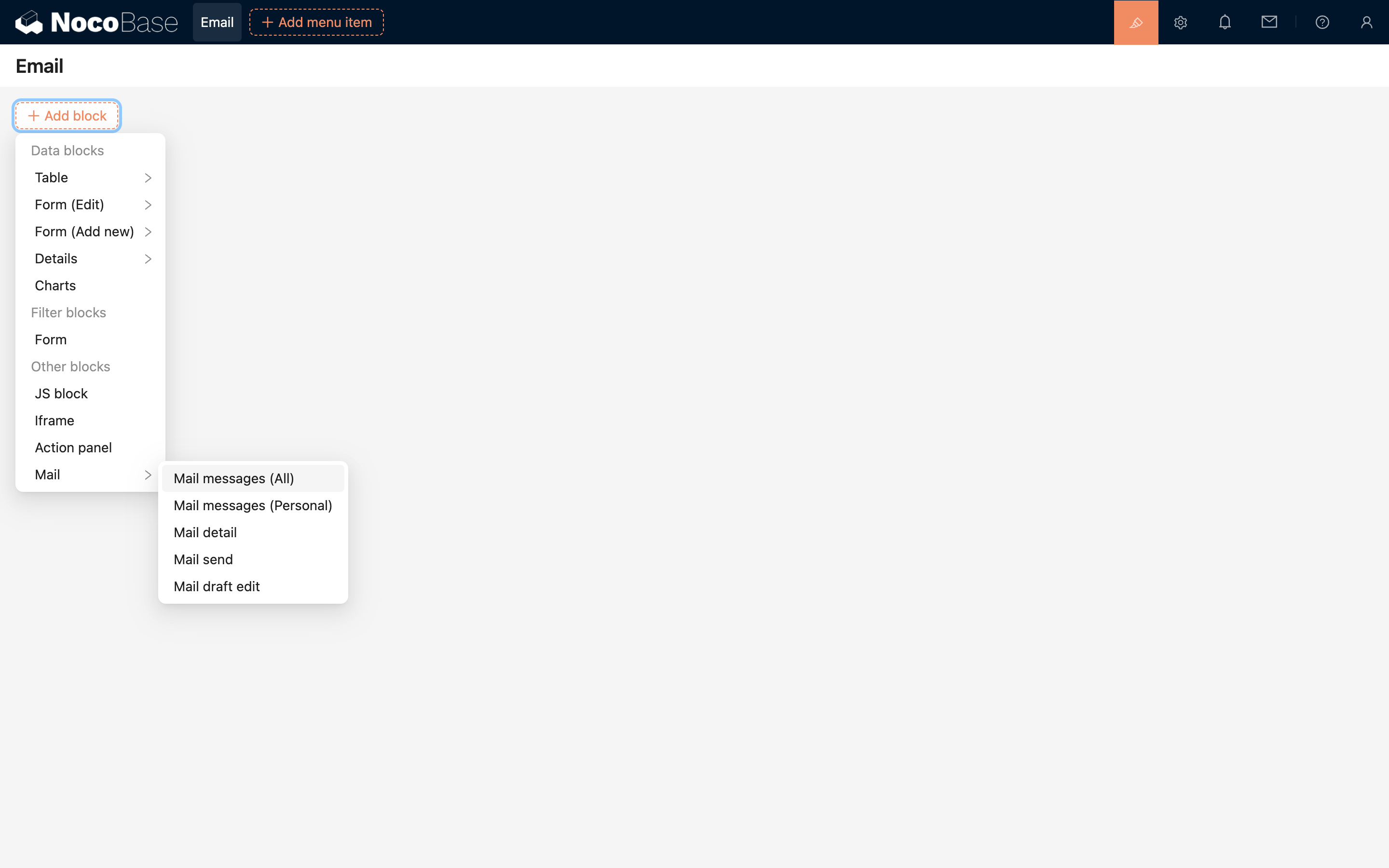 On the configuration page, click the Create block button, and select the Email messages (All) or Email messages (Personal) block to add an email messages block.