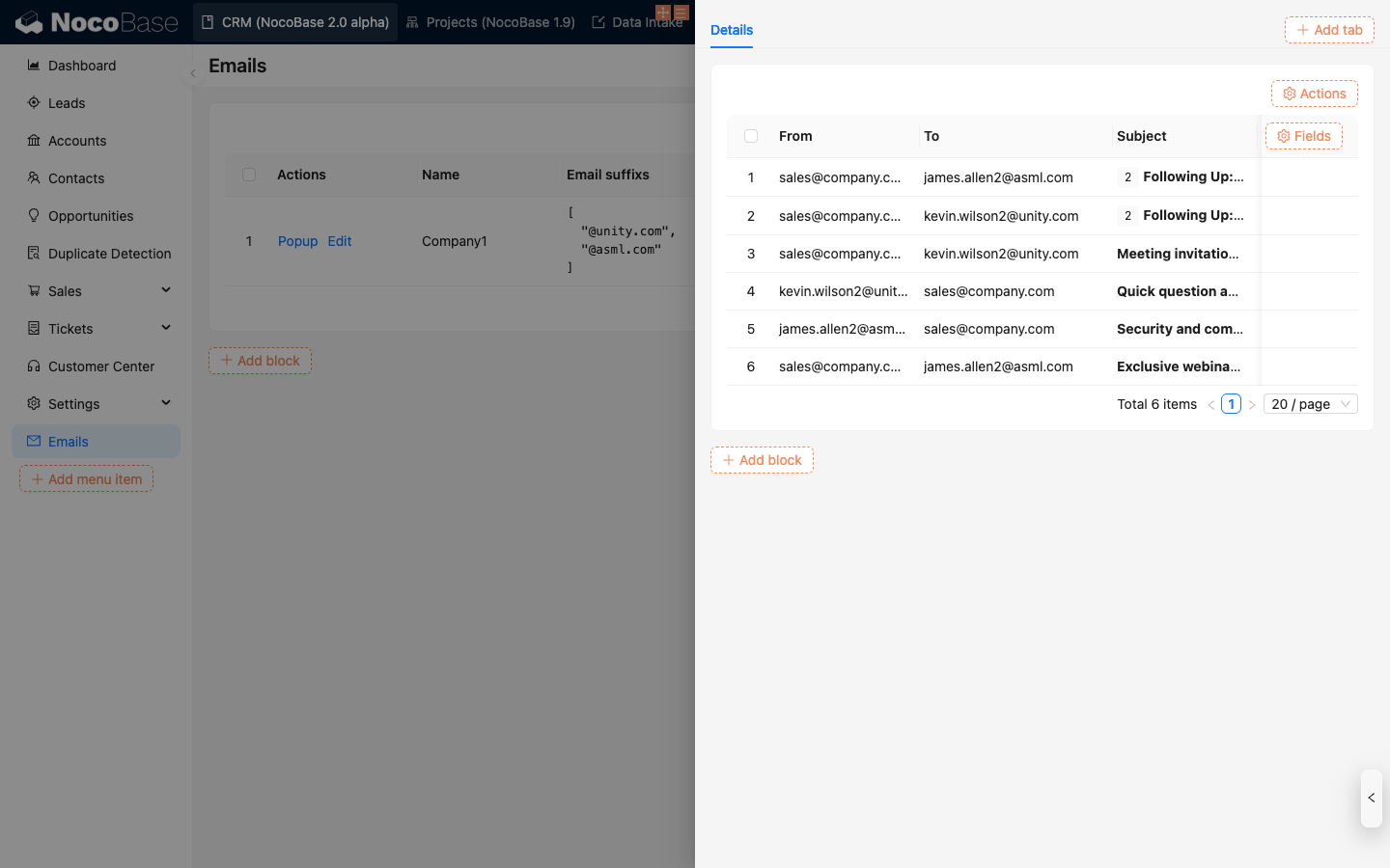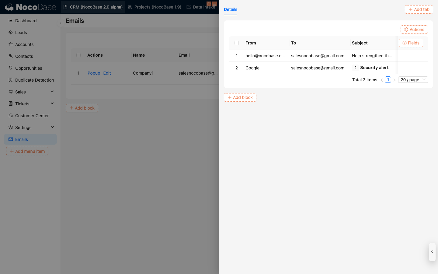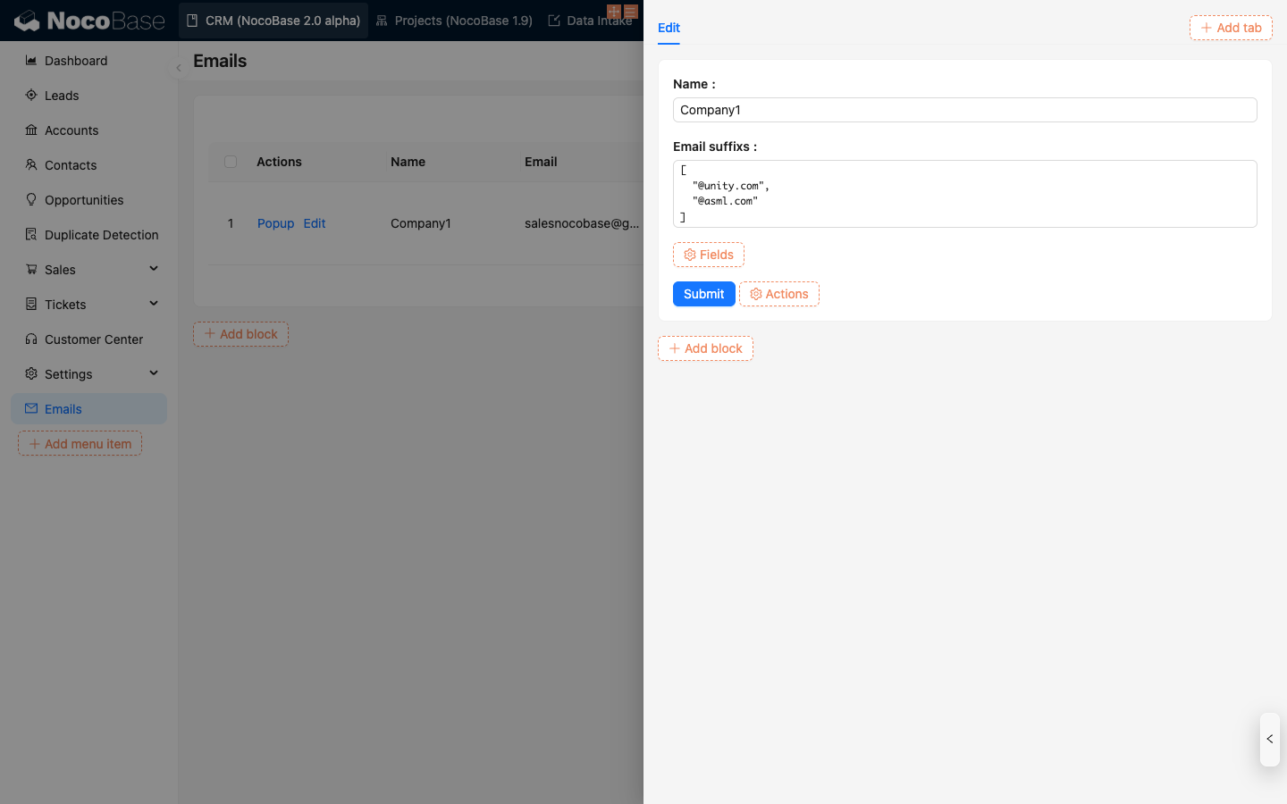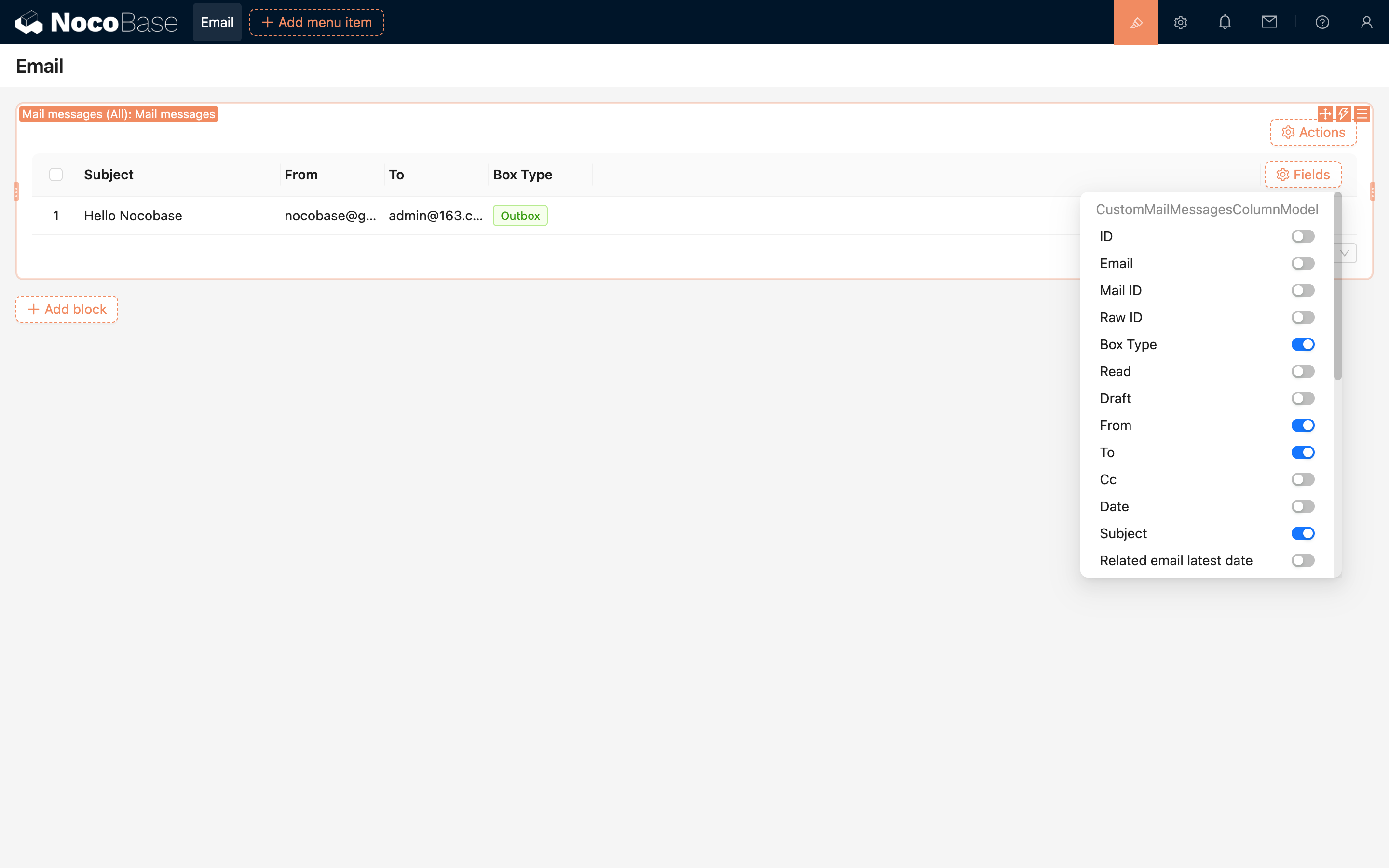 Click the Fields button of the block to select the fields to be displayed. For detailed operations, refer to the field configuration method for tables.