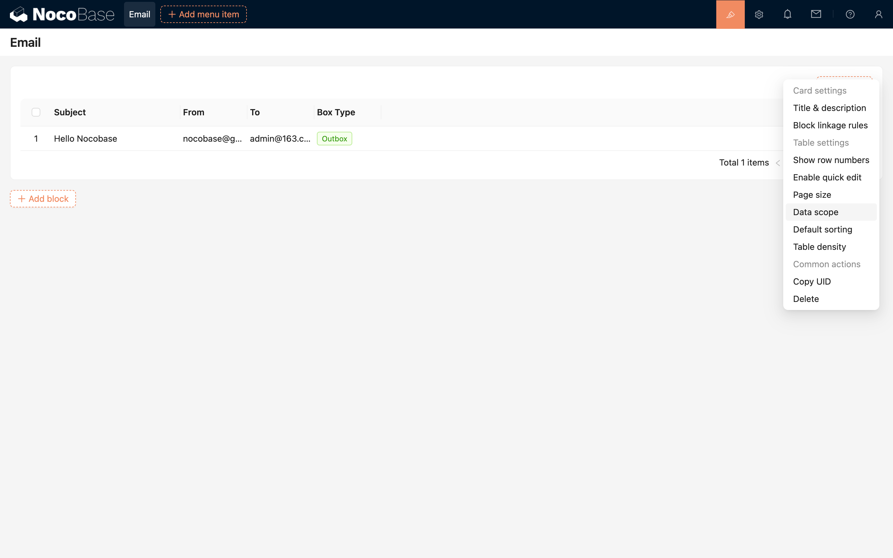 Click the configuration icon on the right side of the table and select Data scope to set the data range for filtering emails.