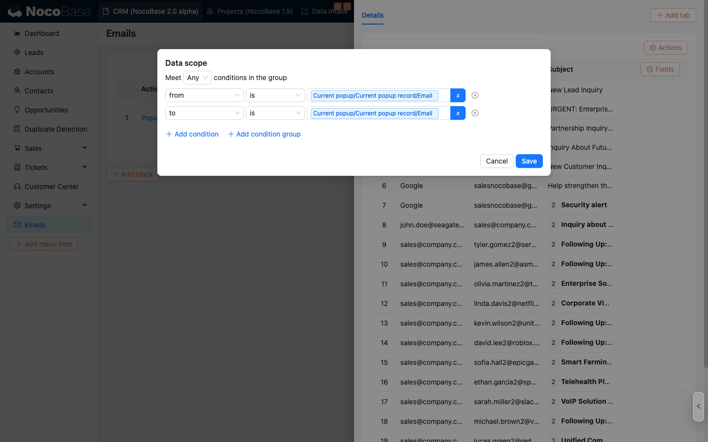 Configure the filter conditions by selecting the email address field you want to filter on, then click OK to save.