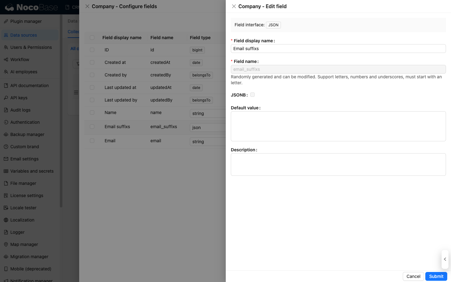 Create a field in the business table to store the email domain (Field type is JSON), which will be used later for filtering email messages.