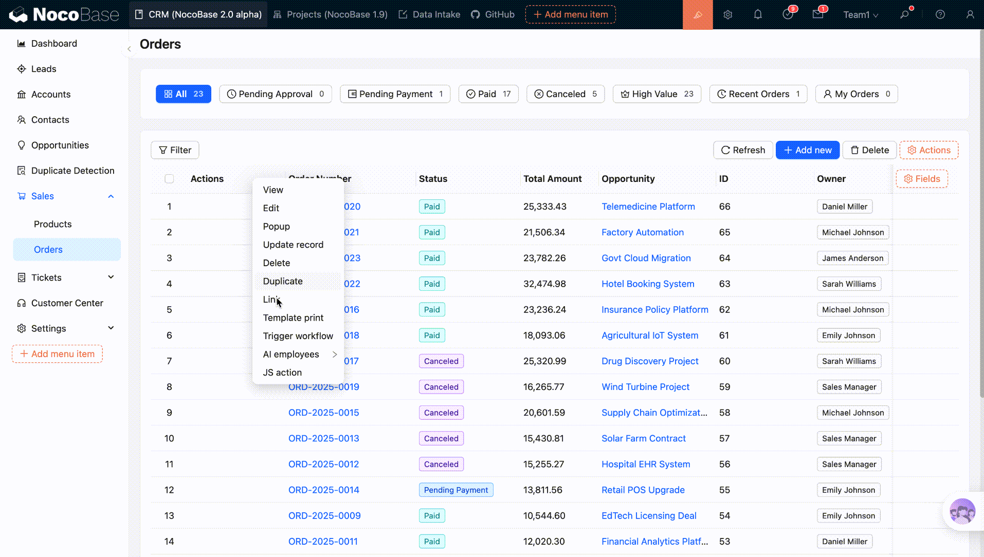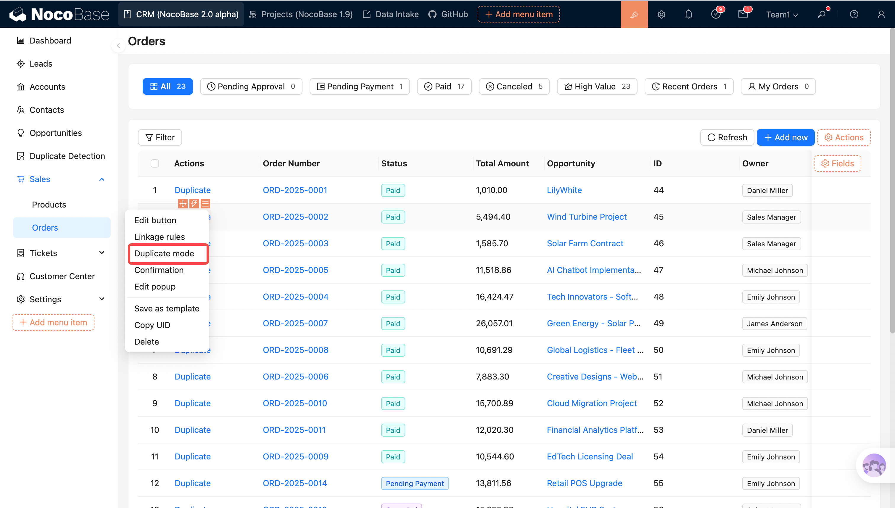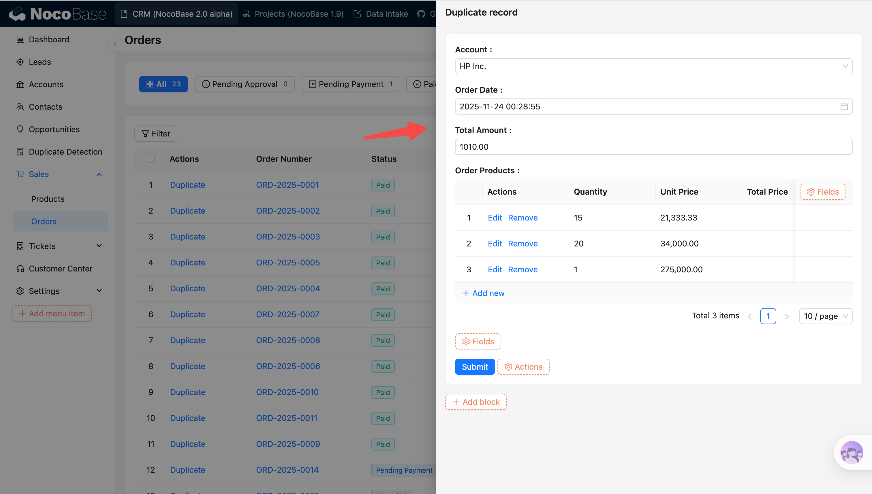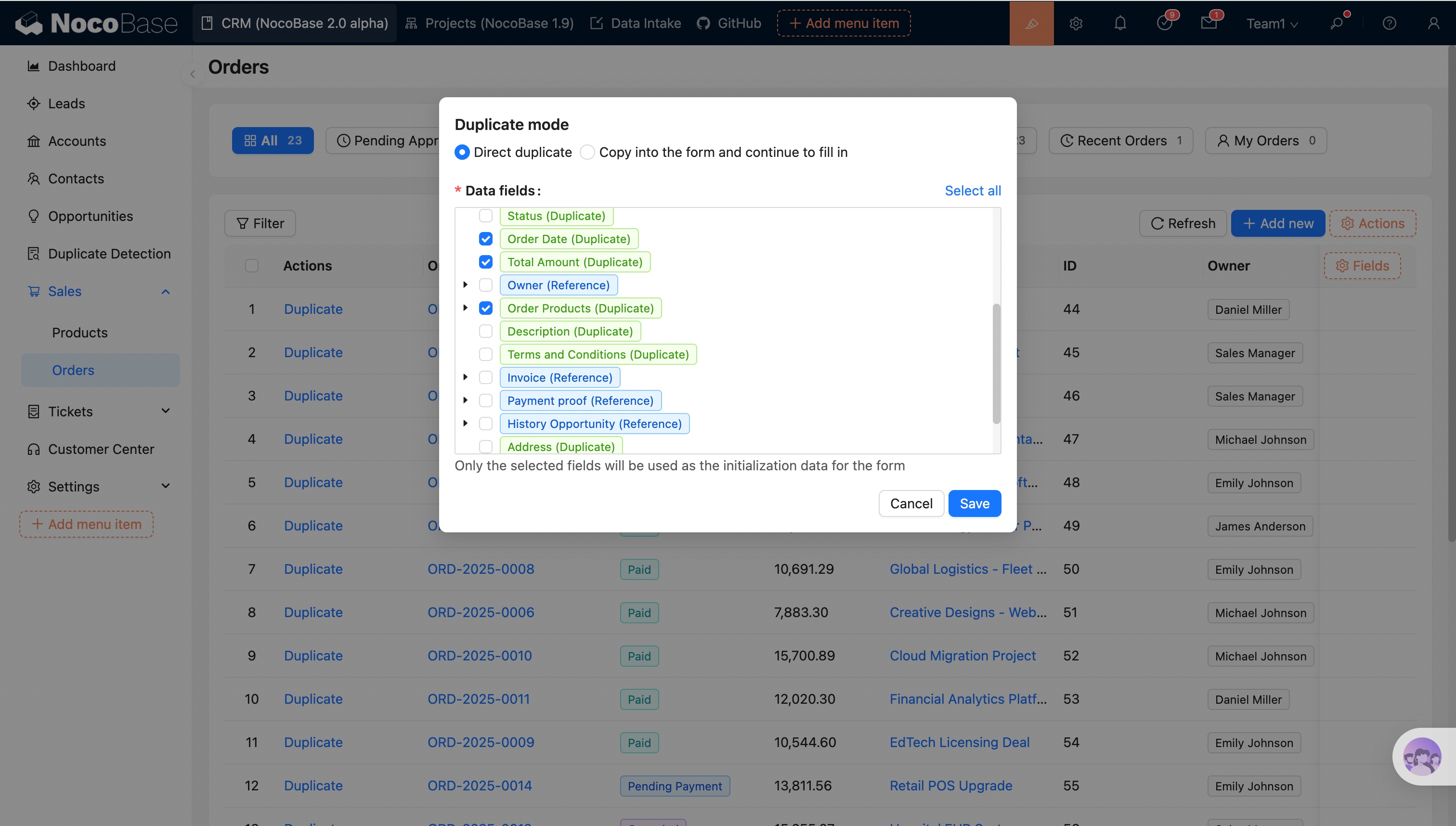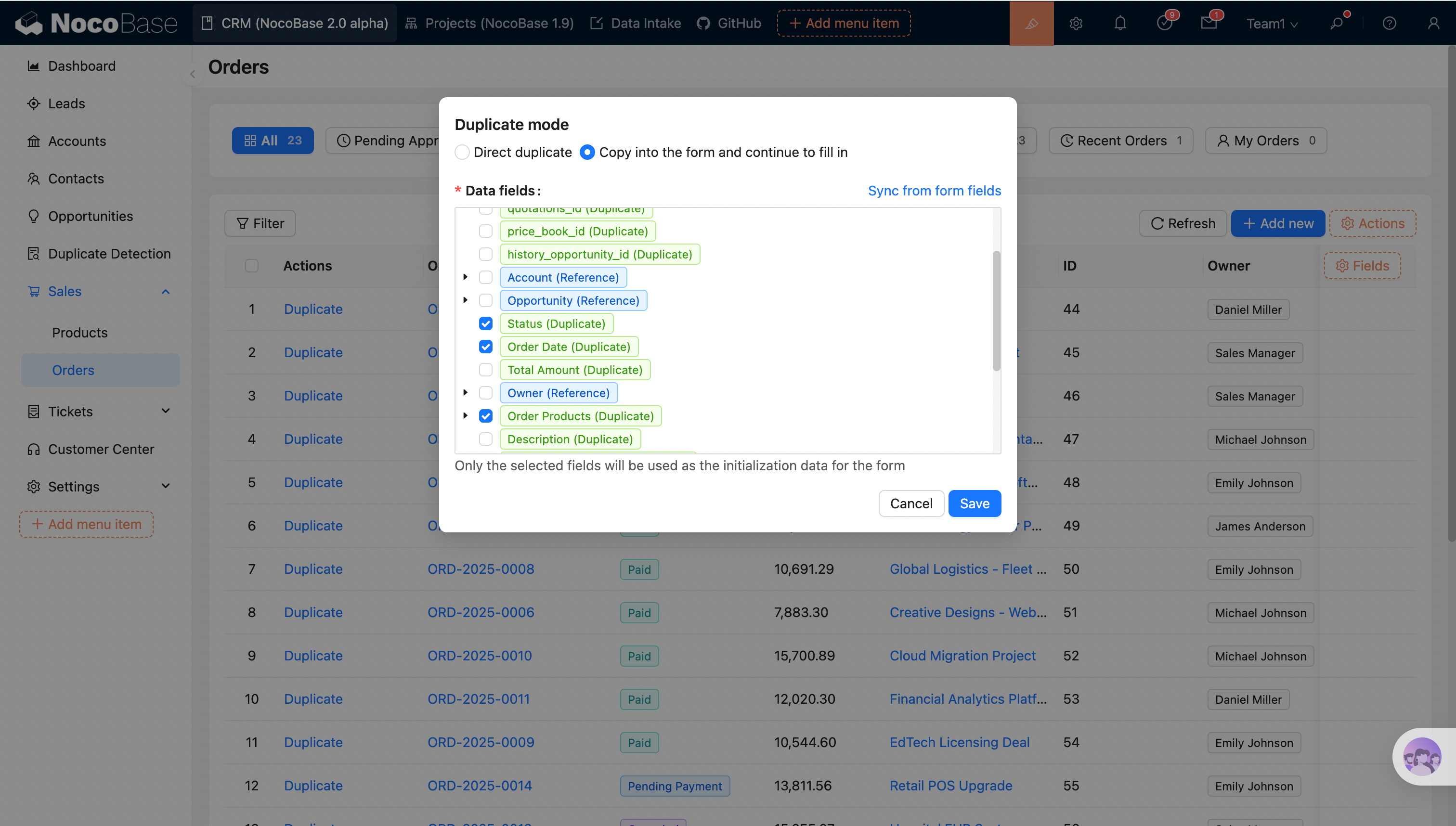 The Duplicate action allows users to quickly create new records based on existing data. Two duplication modes are supported: Direct duplicate and Copy into the form and continue to fill in.