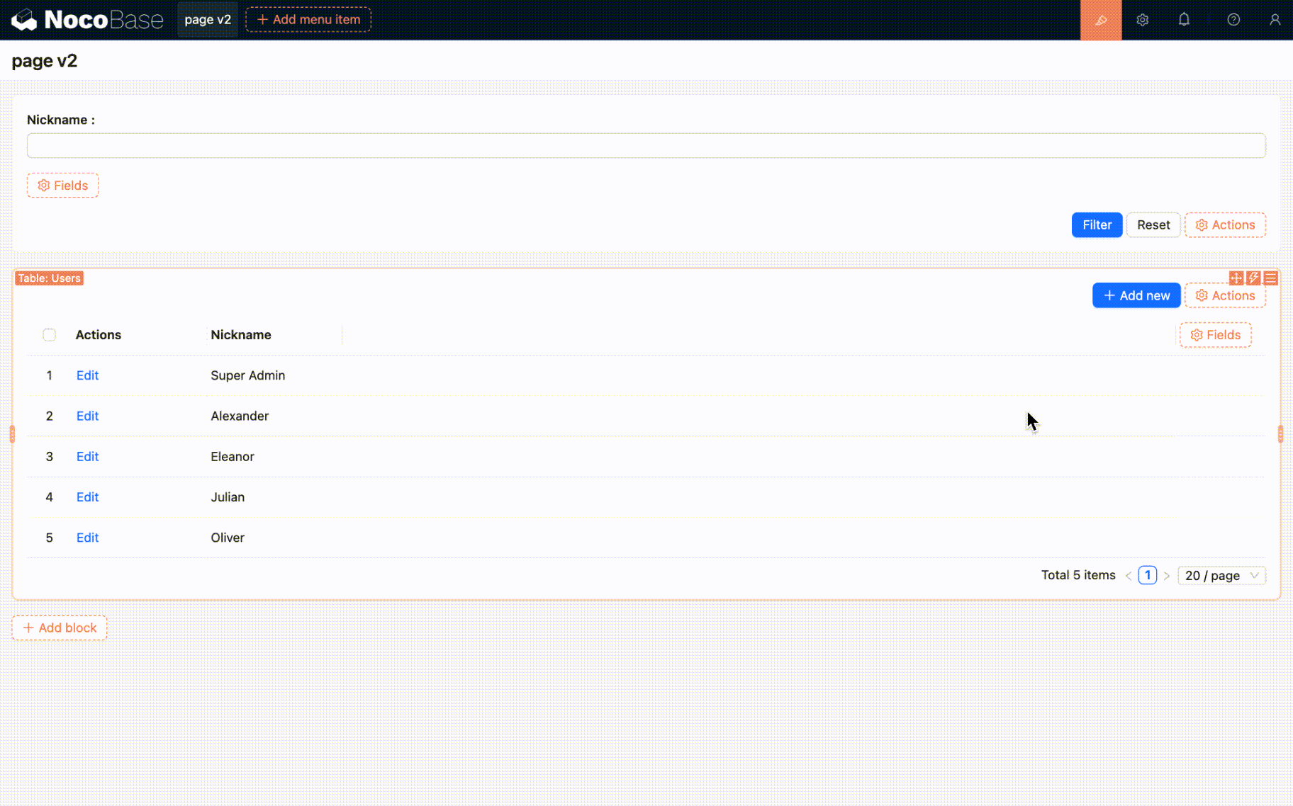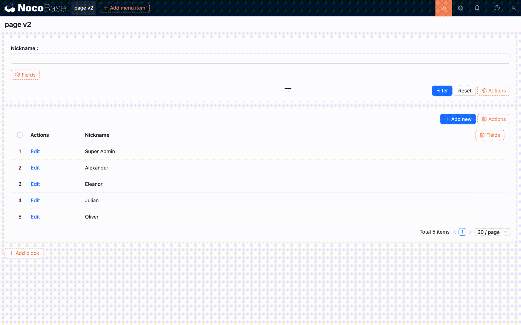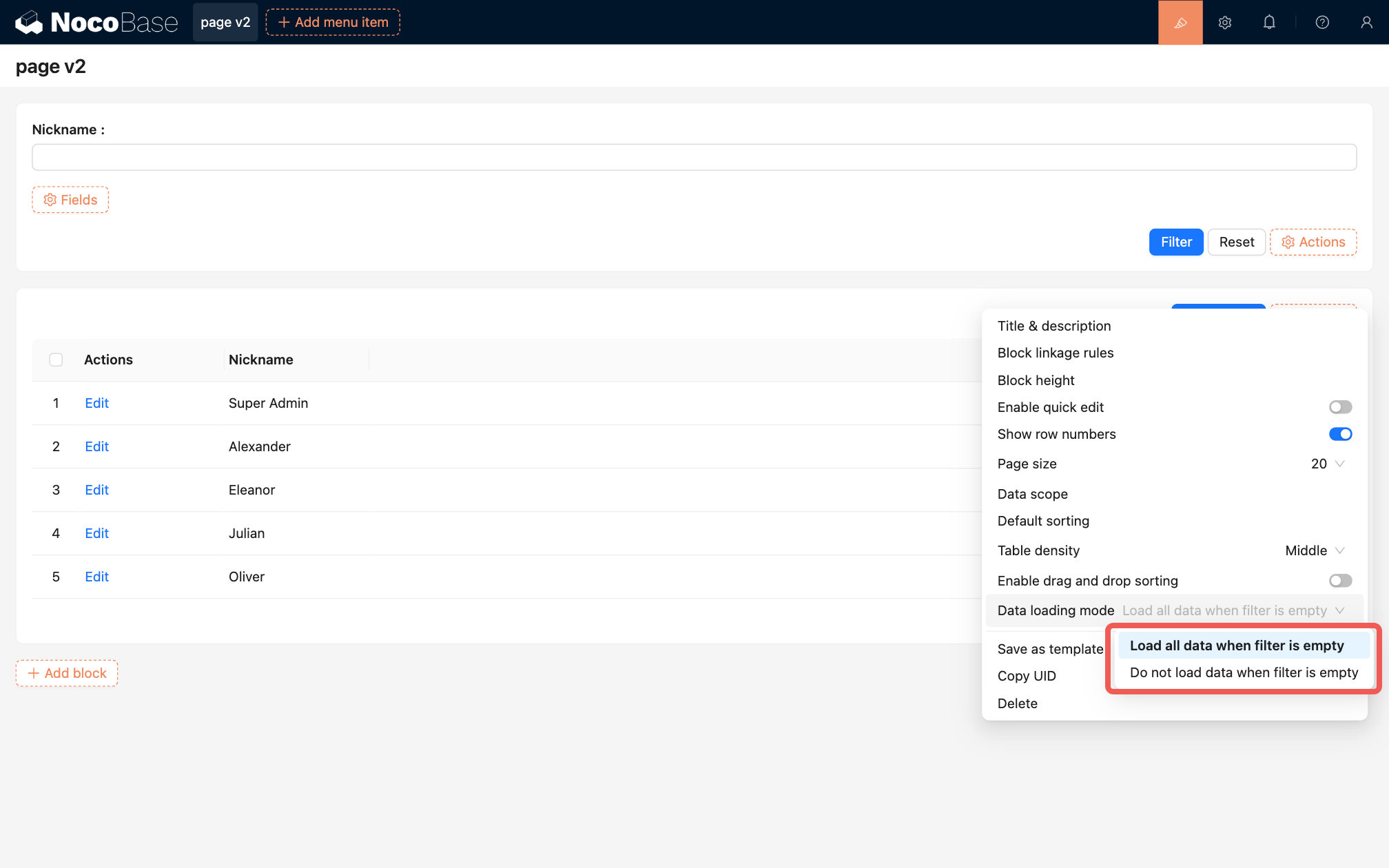 The default data loading method is "Load all data when filter is empty", where "filter" refers to the values in the filter block. The other option is "Do not load data when filter is empty".