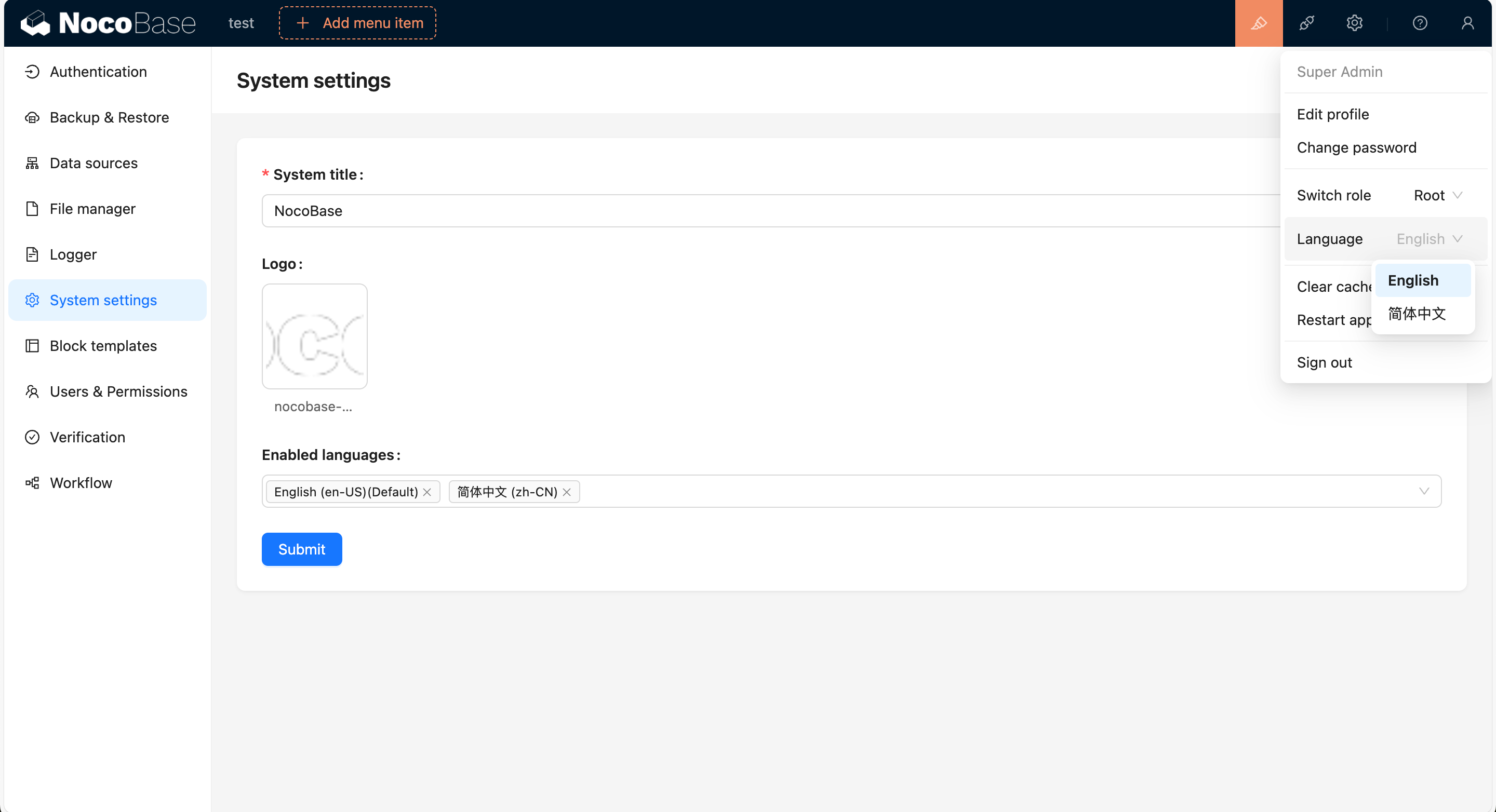 We can add multiple languages through http://localhost:13000/admin/settings/system-settings, and switch languages in the upper right corner.