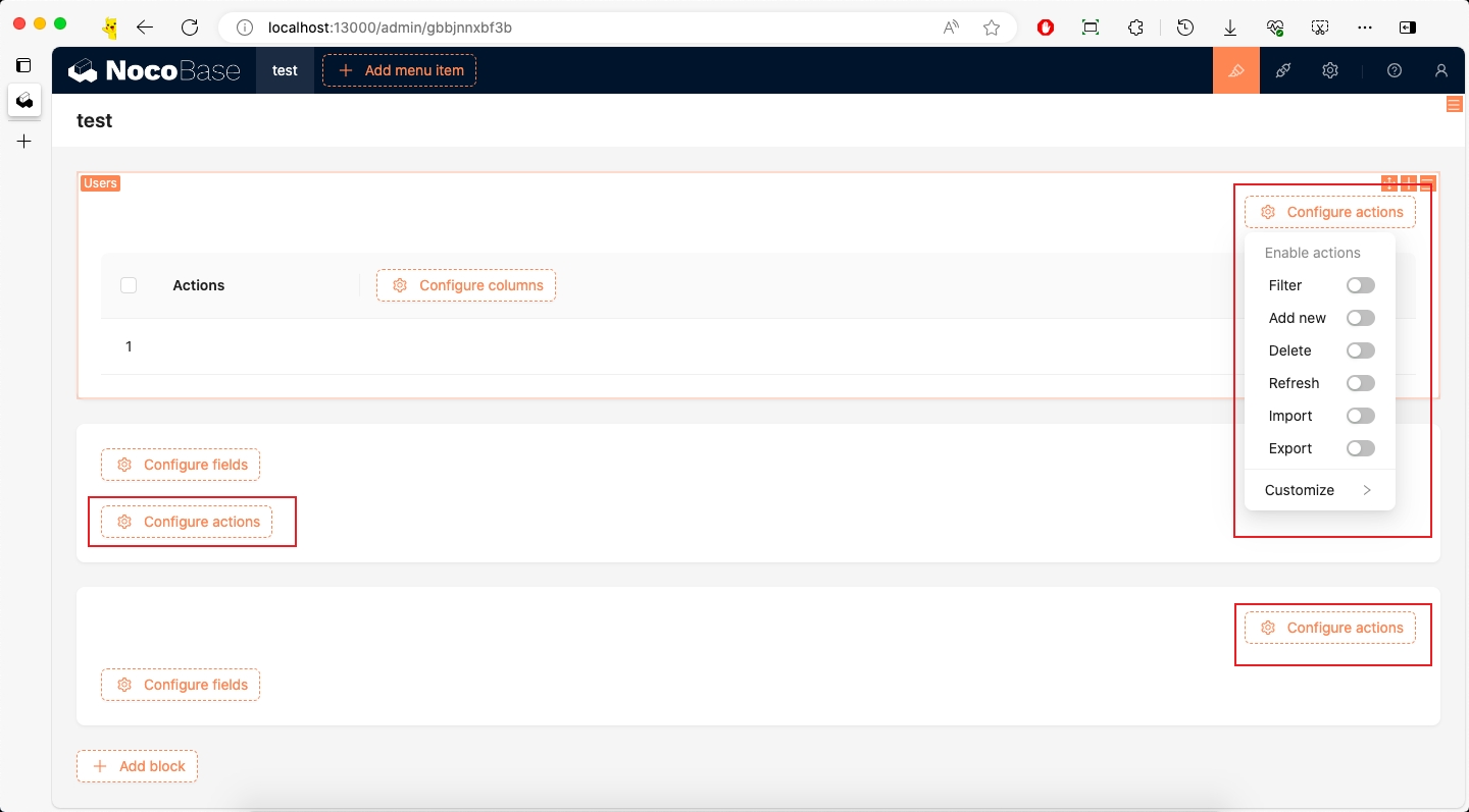 There are many Configure actions buttons in the system, but their names are different. We need to add it to the Configure actions in Table, Details, and Form blocks according to our needs.