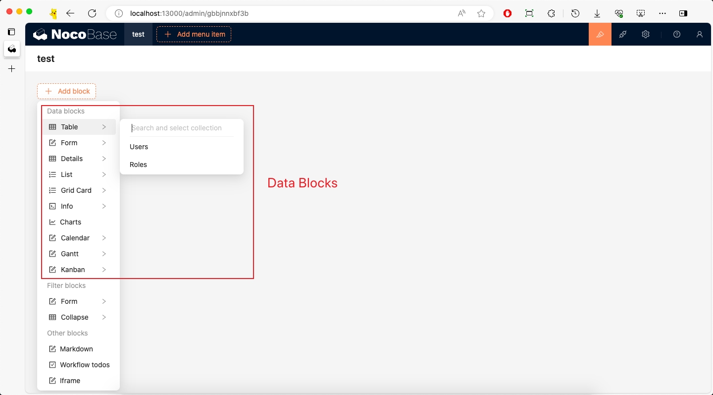NocoBase has many Add block buttons for adding blocks to the interface. Some are related to data tables and are called data blocks Data Block, while others that are not related to data tables are called simple blocks Simple Block.