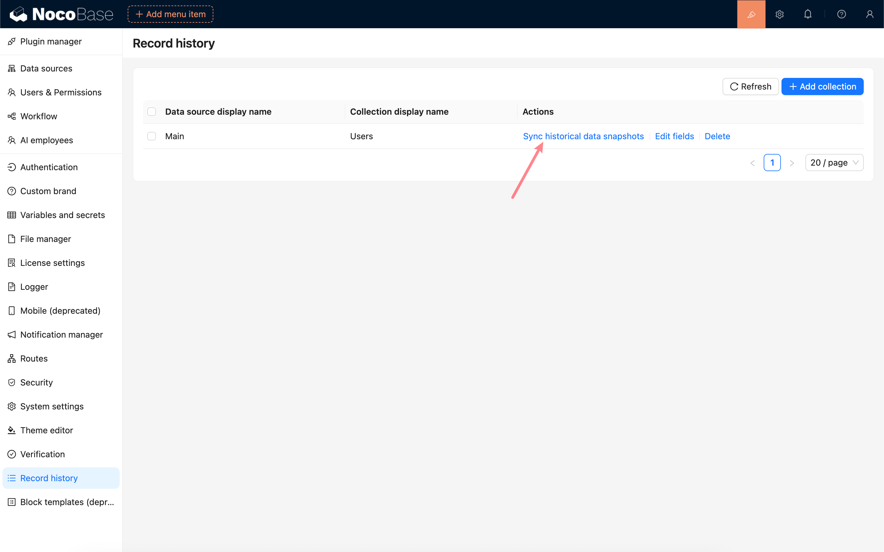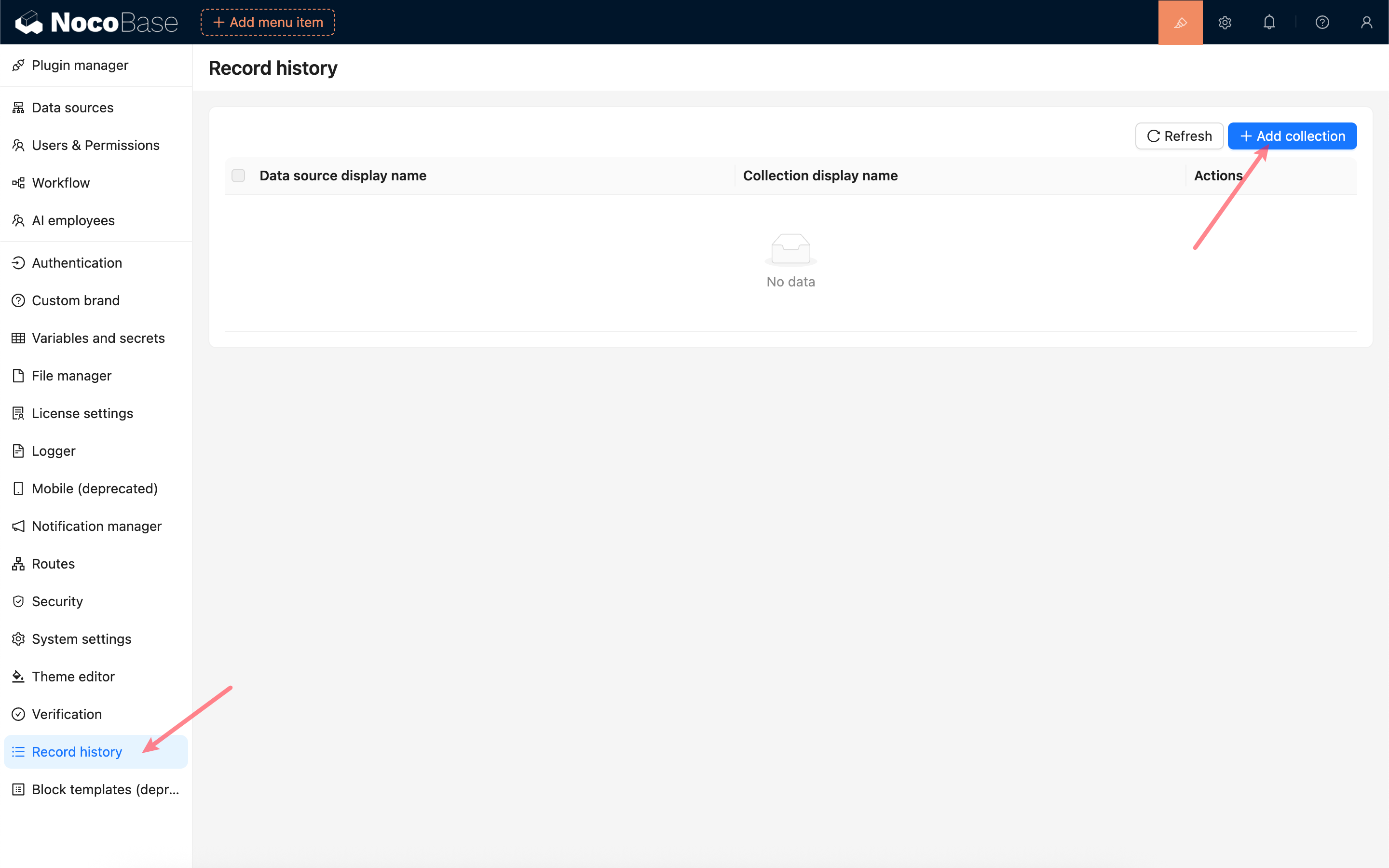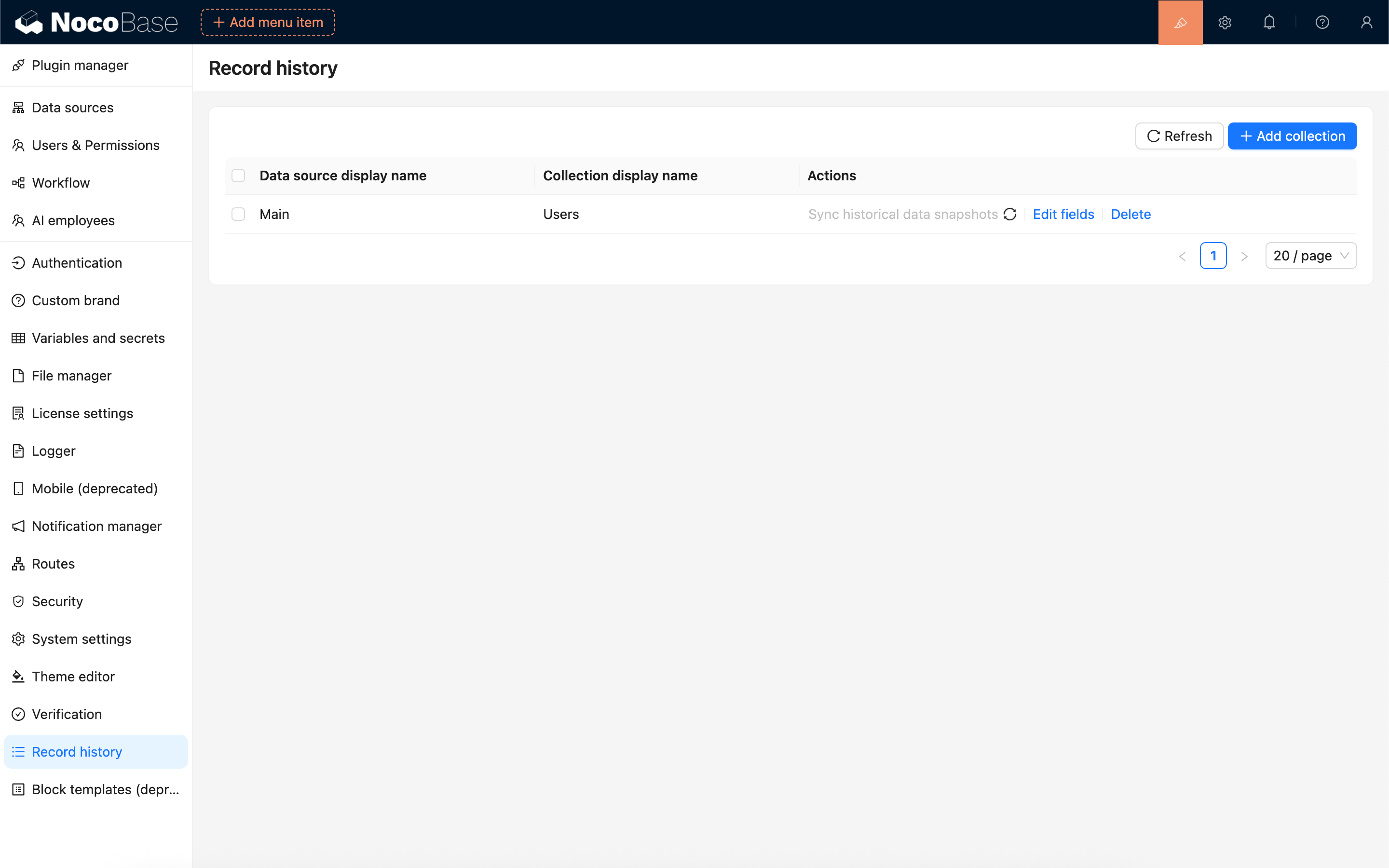 First, go to the Record History plugin settings page to add the collections and fields for which you want to track history. To improve recording efficiency and avoid data redundancy, it is recommended to track only essential fields. Fields such as unique ID, createdAt, updatedAt, createdBy, and updatedBy usually do not need to be recorded.