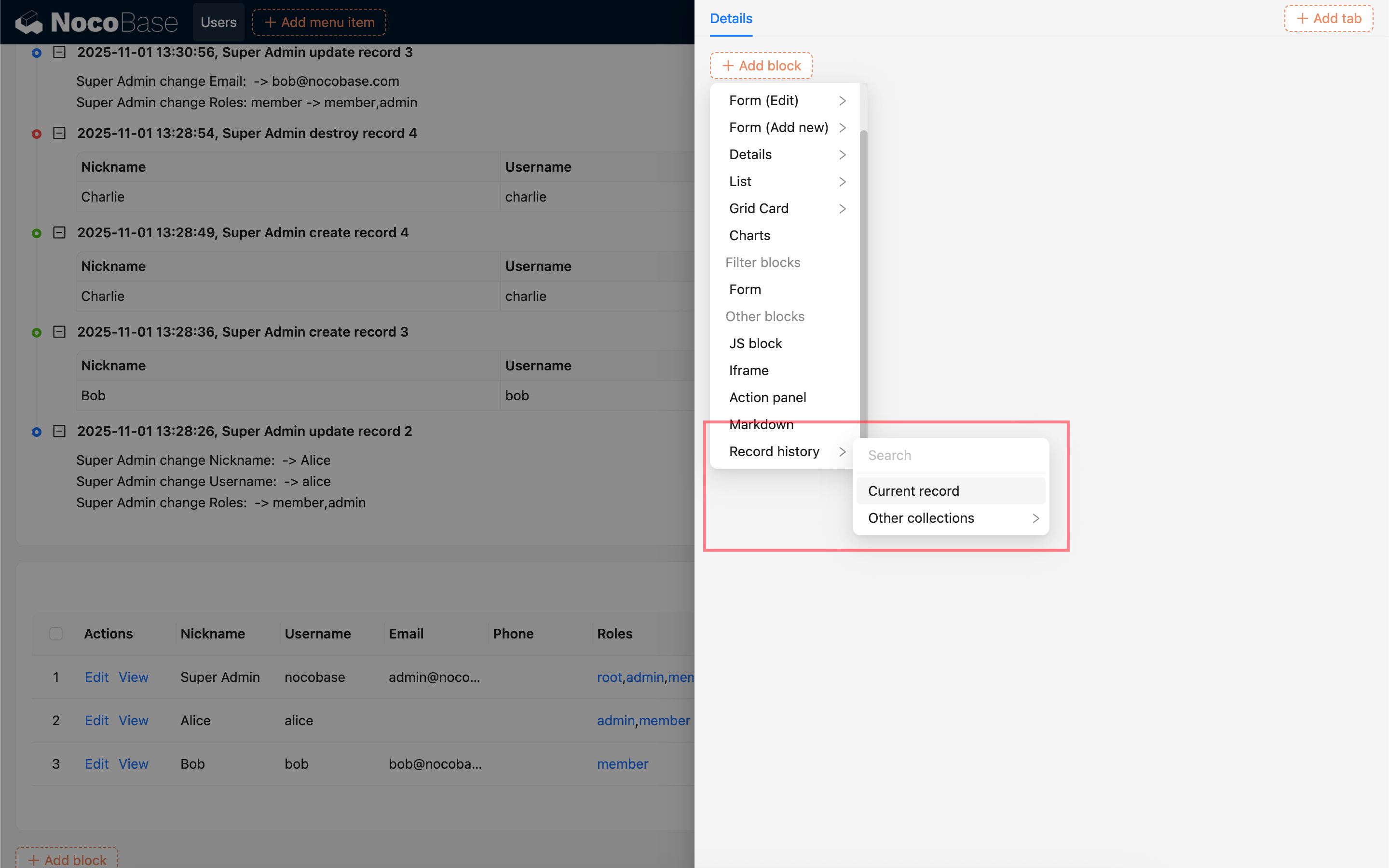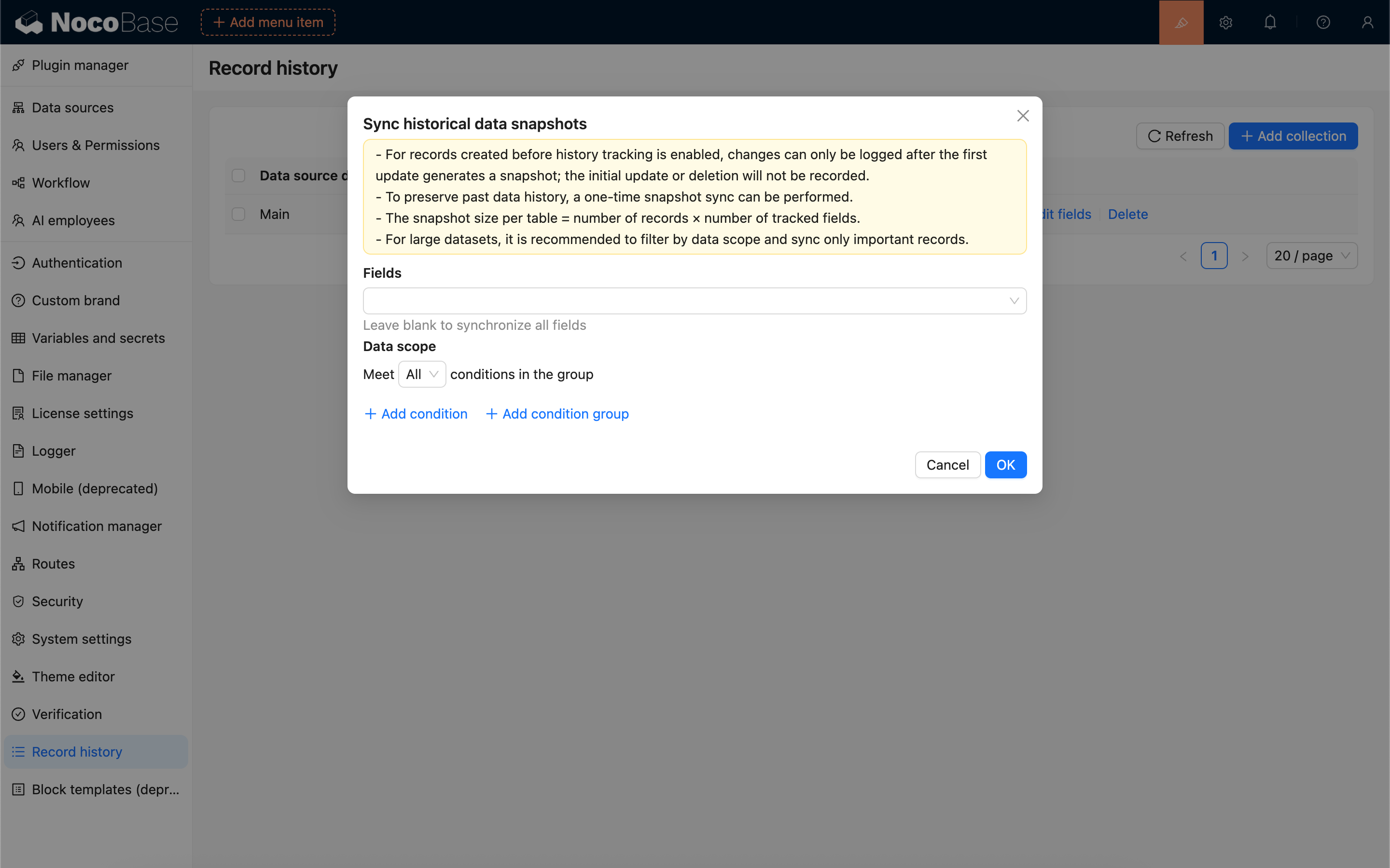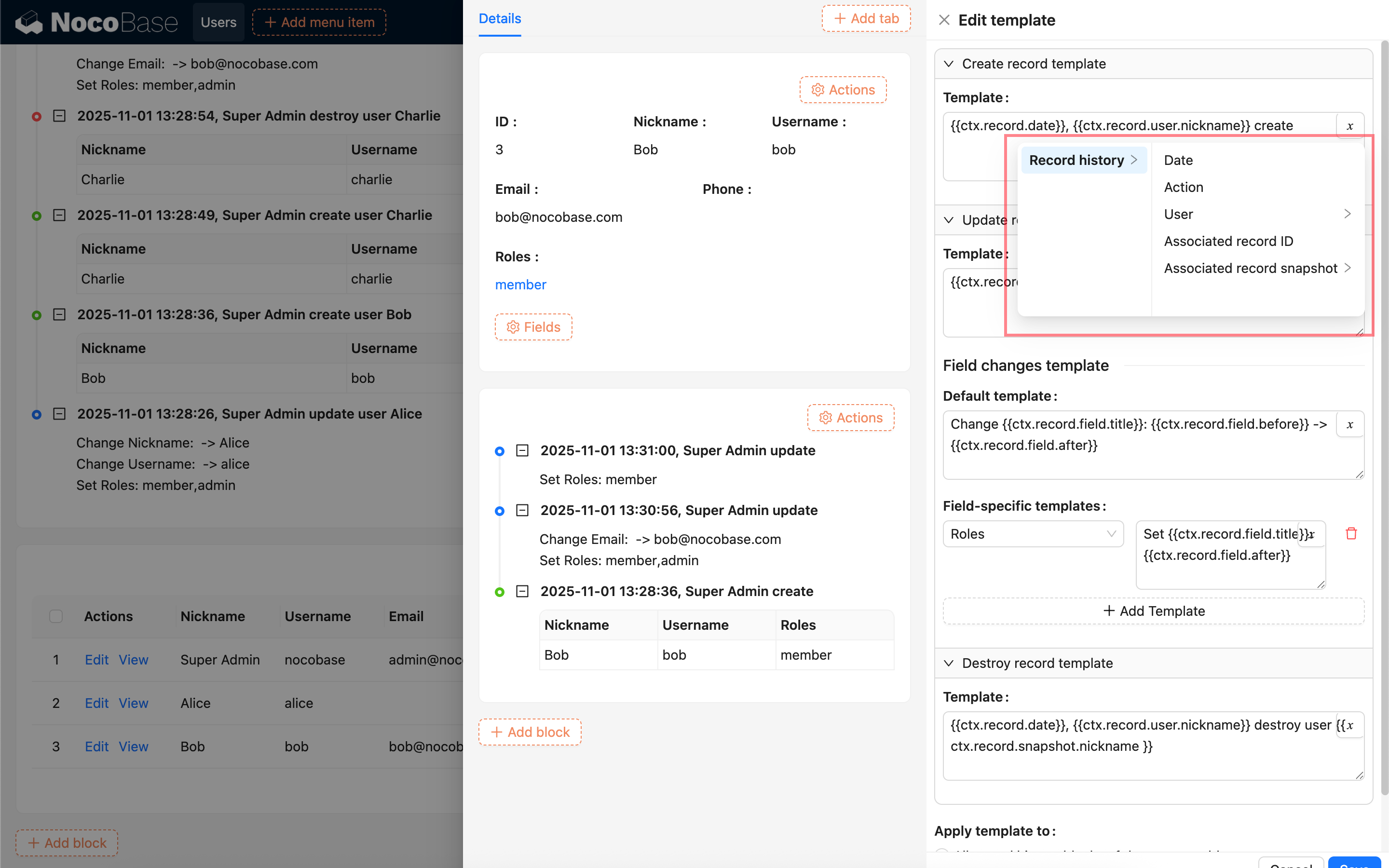 The Record History plugin tracks data changes by automatically saving snapshots and differences of create, update, and delete operations. It helps users quickly review data modifications and audit operation activities.