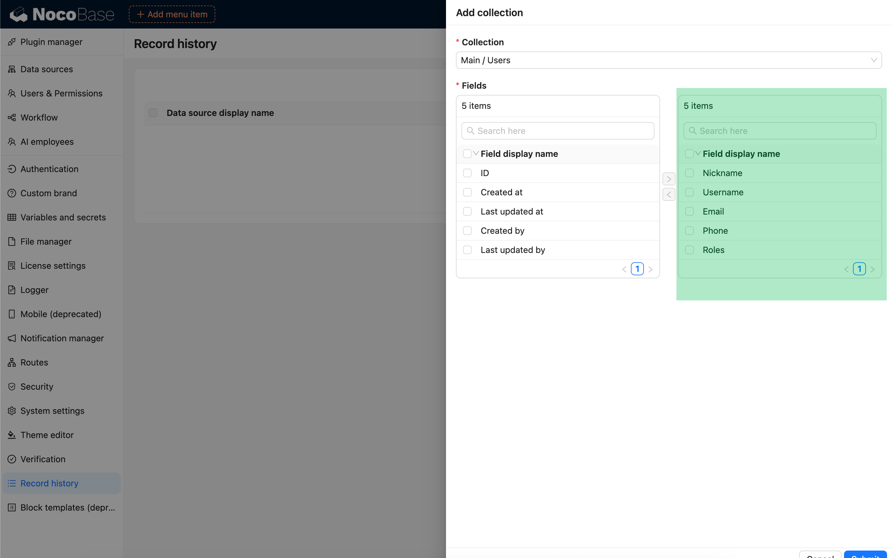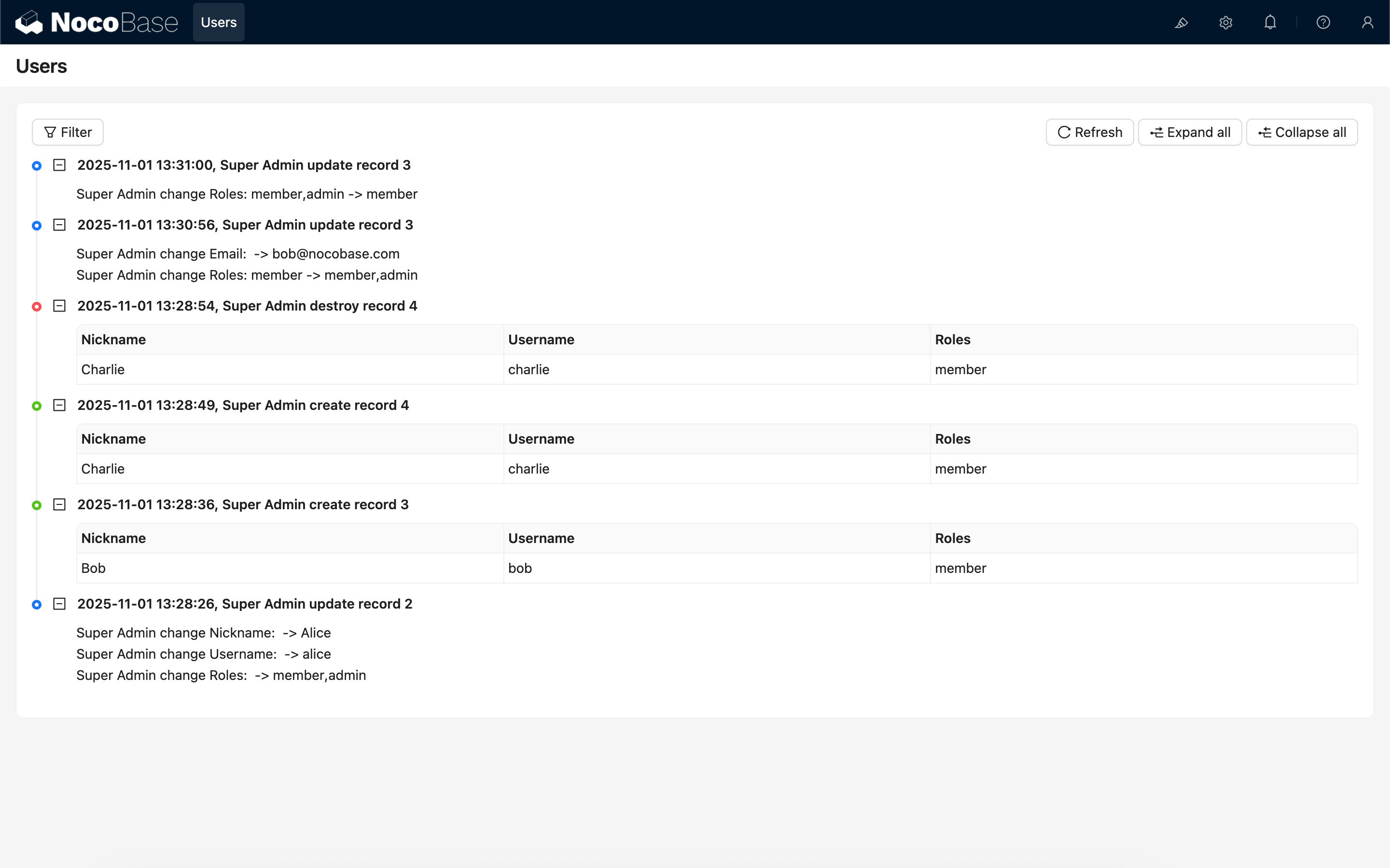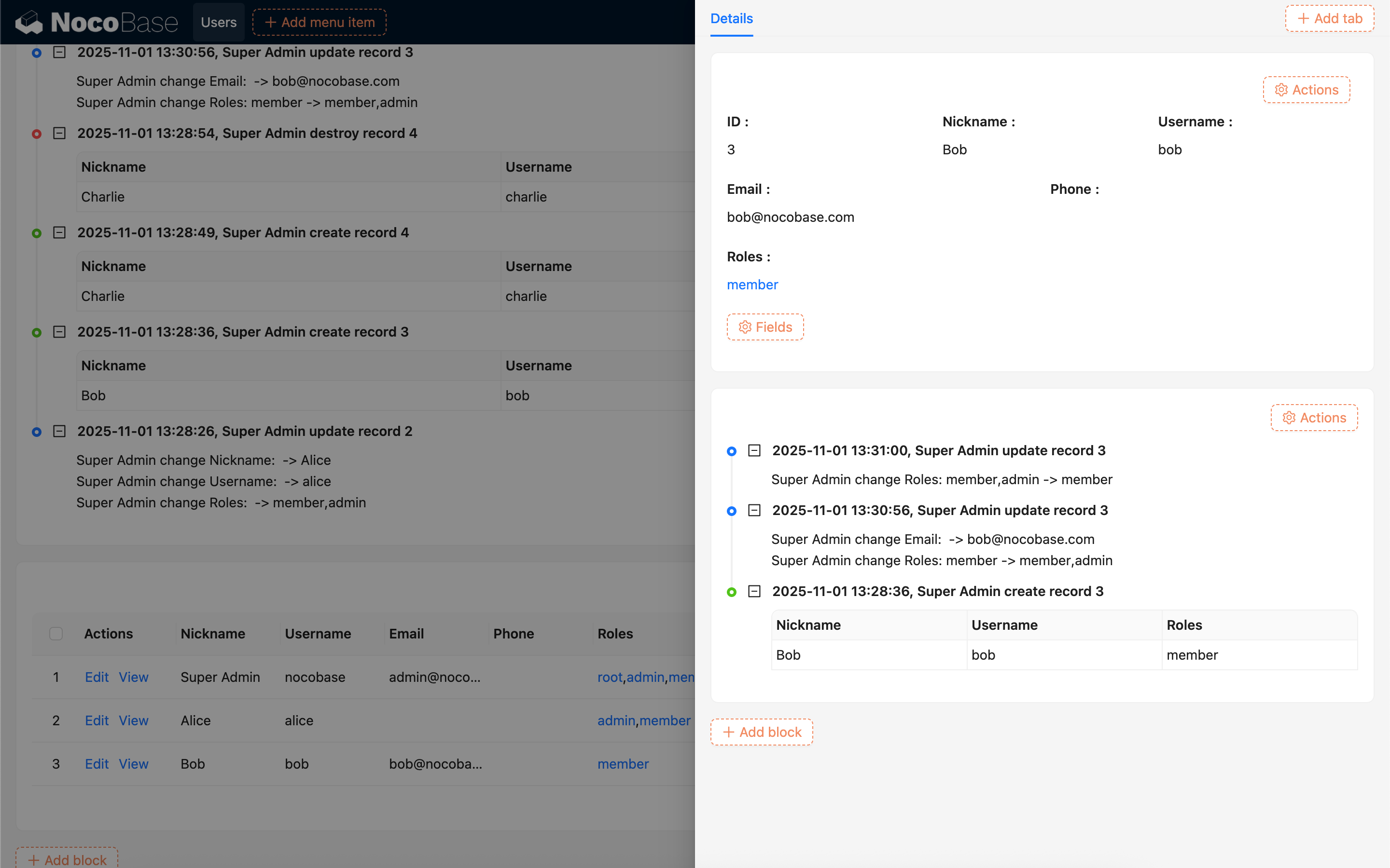 The Record History plugin tracks data changes by automatically saving snapshots and differences of create, update, and delete operations. It helps users quickly review data modifications and audit operation activities.