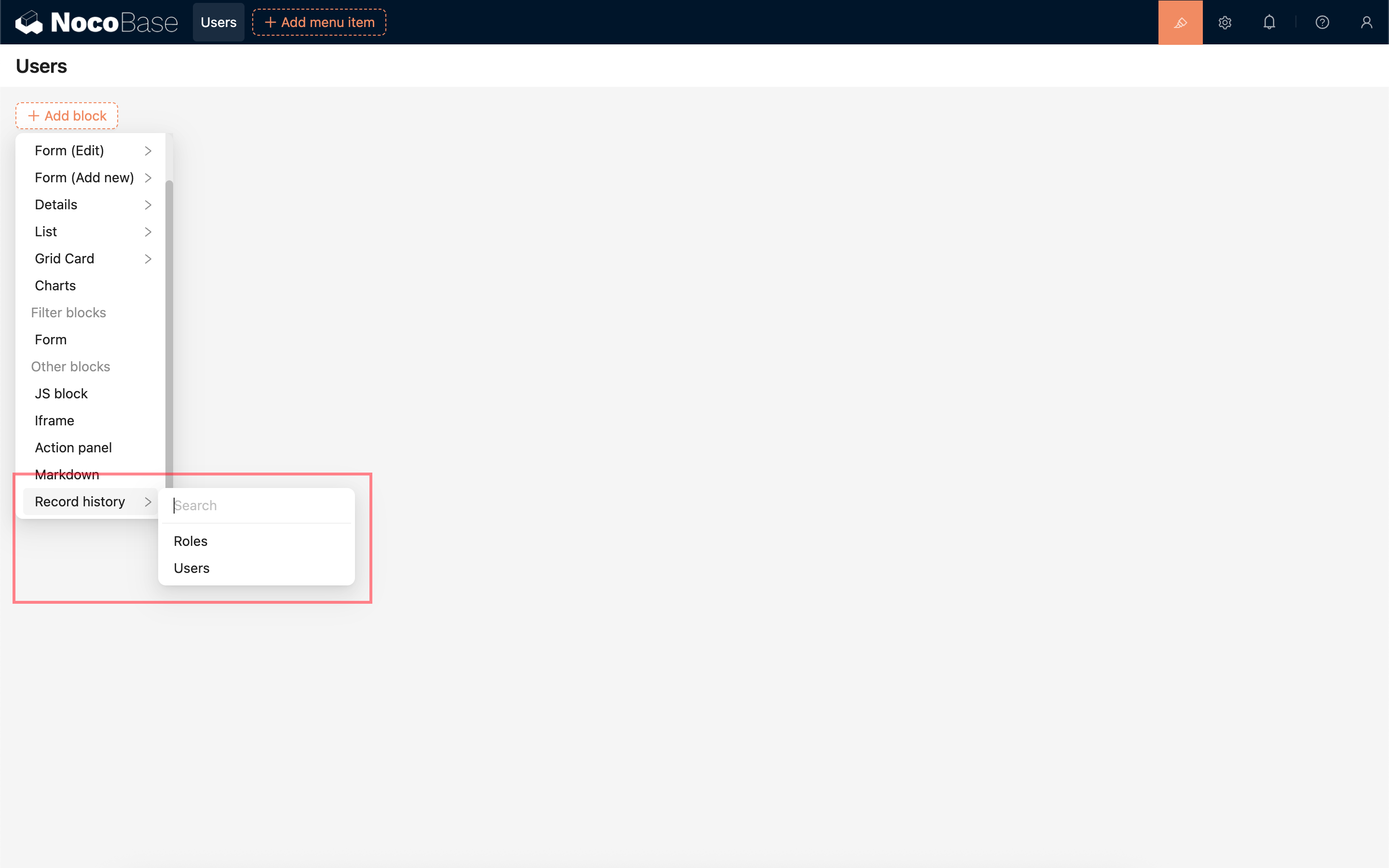 Select the Record History Block and choose a collection to add the corresponding history block to your page.