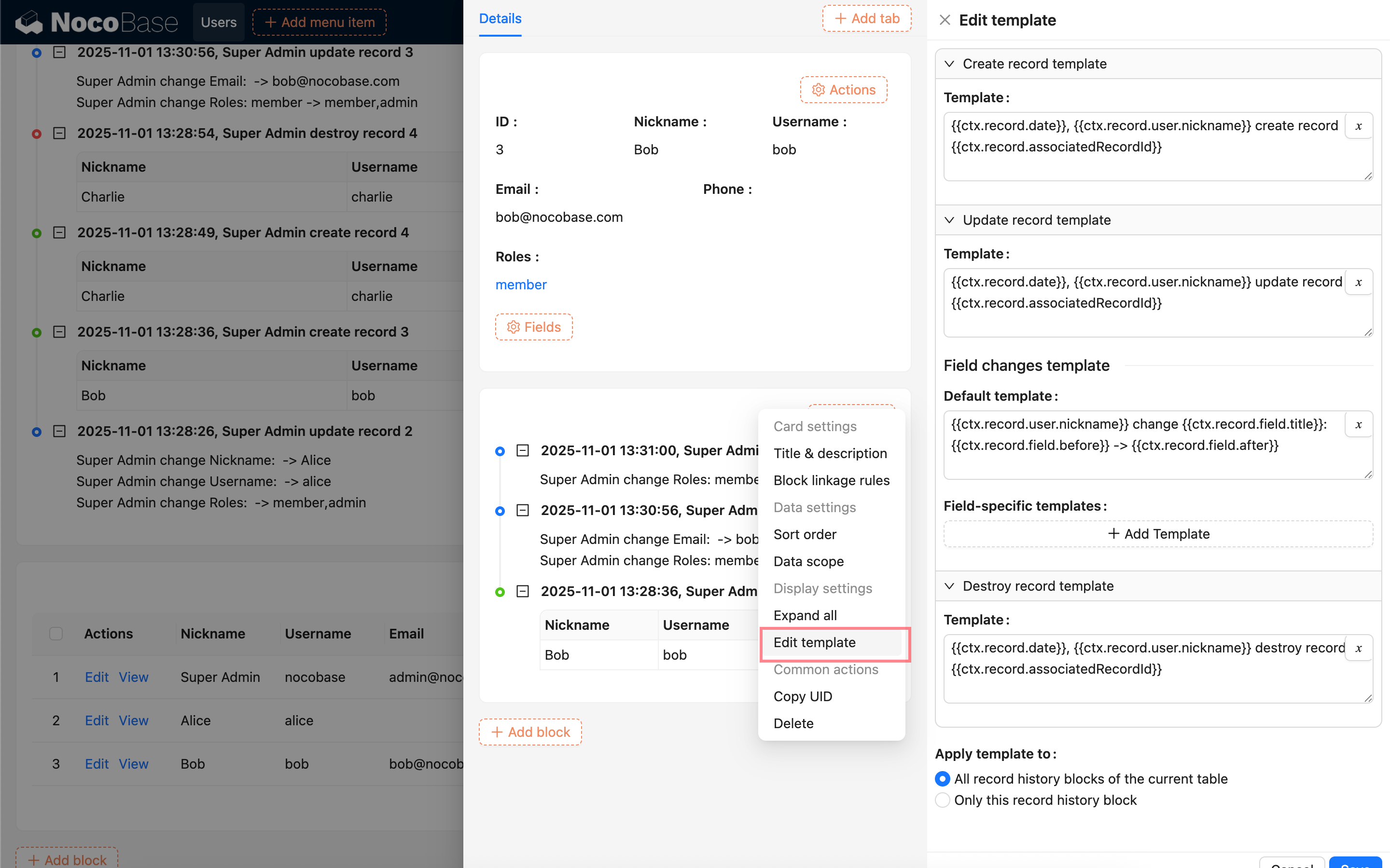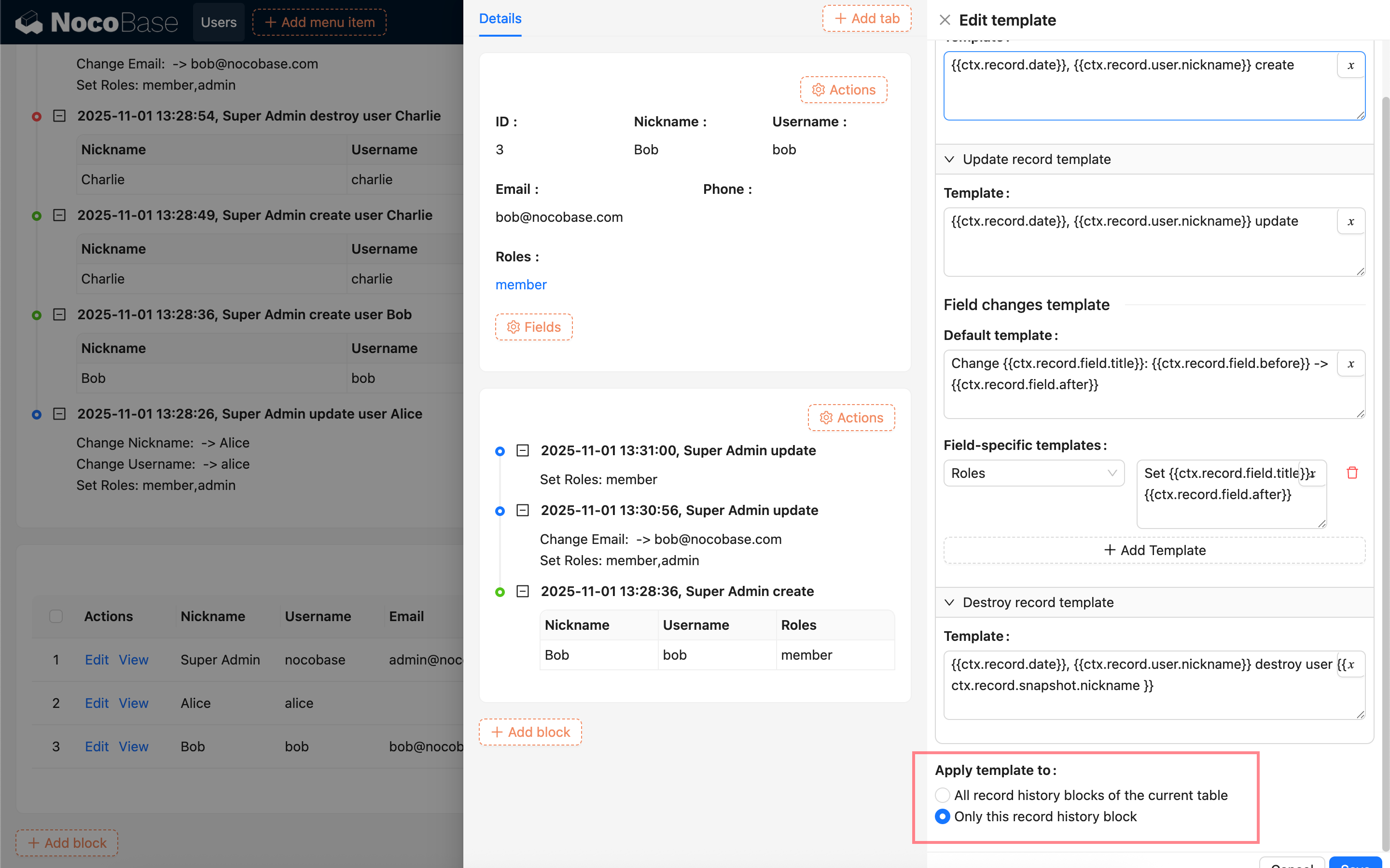 After configuration, you can choose to apply the template to All record history blocks of the current collection or Only this record history block.