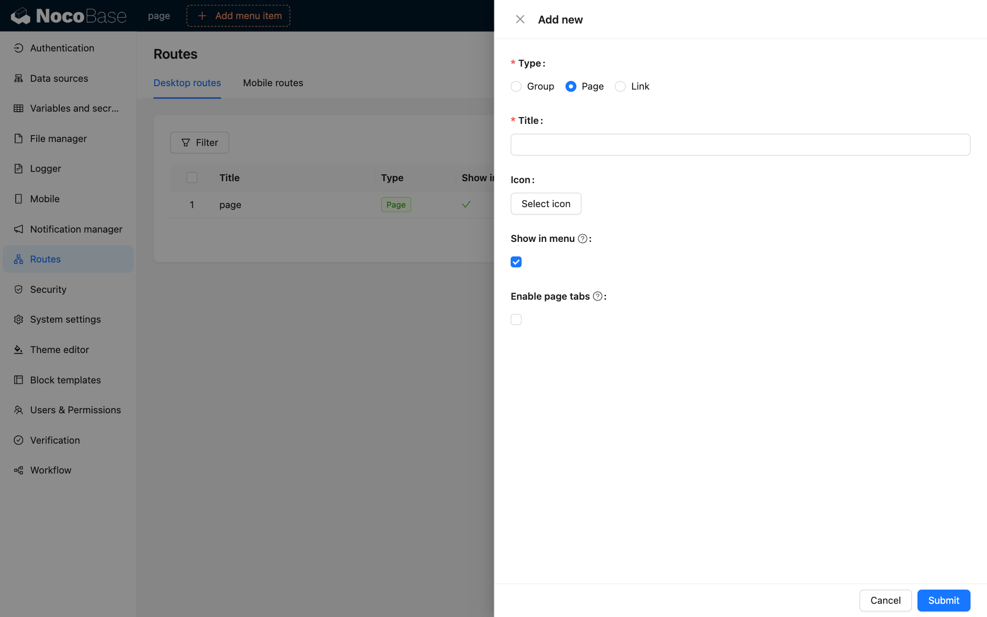 The route manager is a tool for managing the routes of the main page of the system, supporting desktop and mobile endpoints. Routes created using the route manager will be synchronized to the menu (can be configured to not display in the menu). Conversely, menus added in the page menu will also be synchronized to the route manager list.
