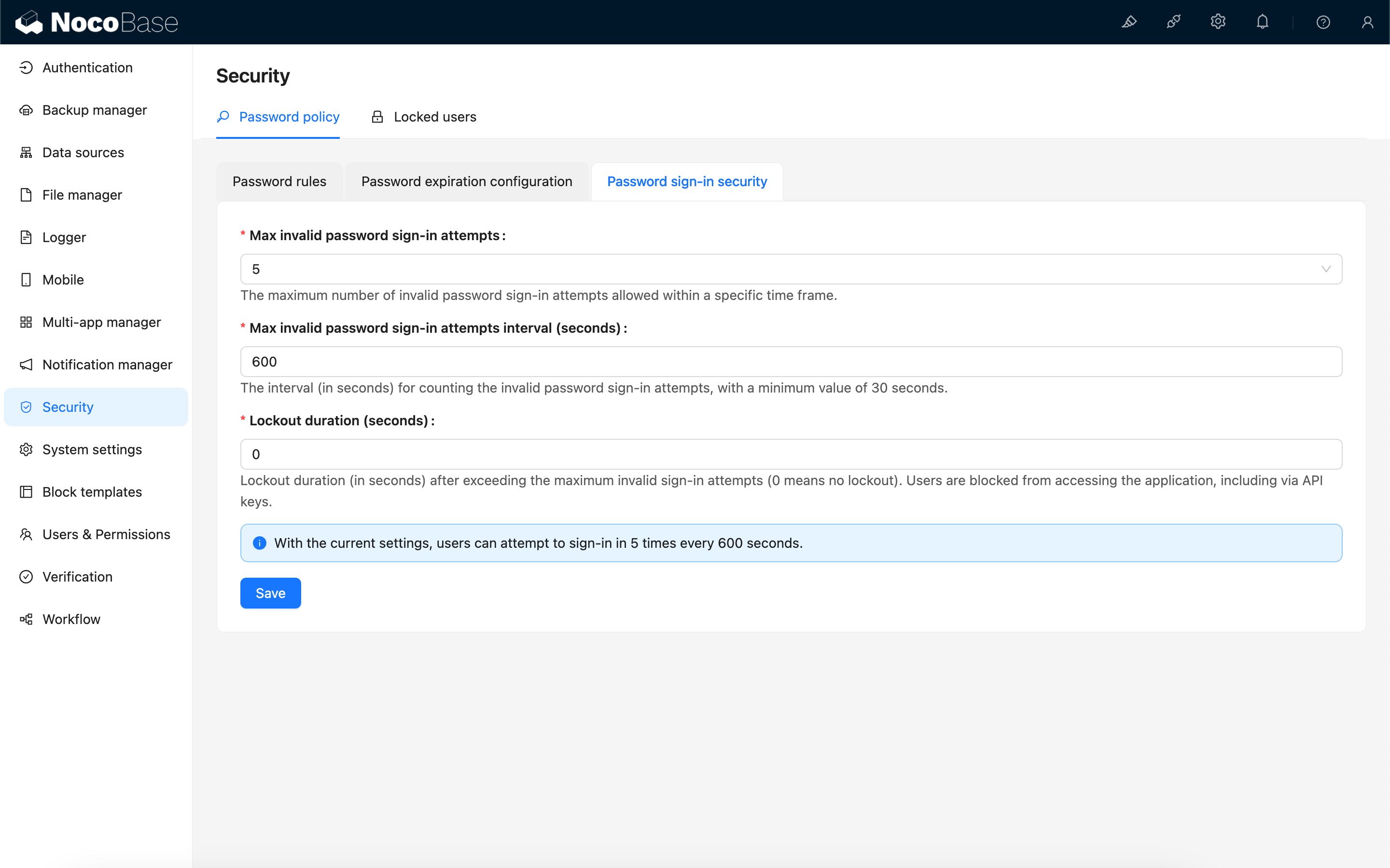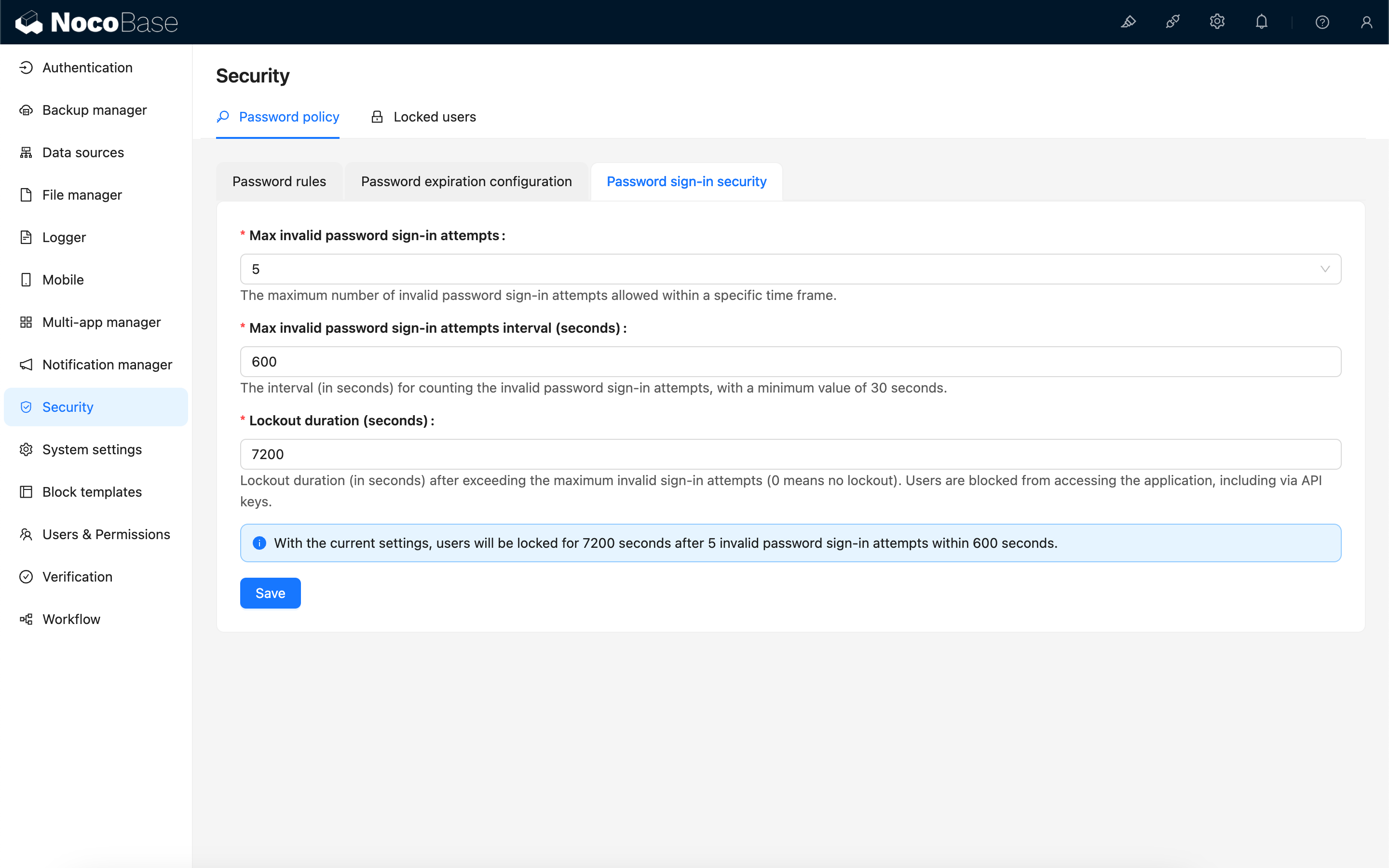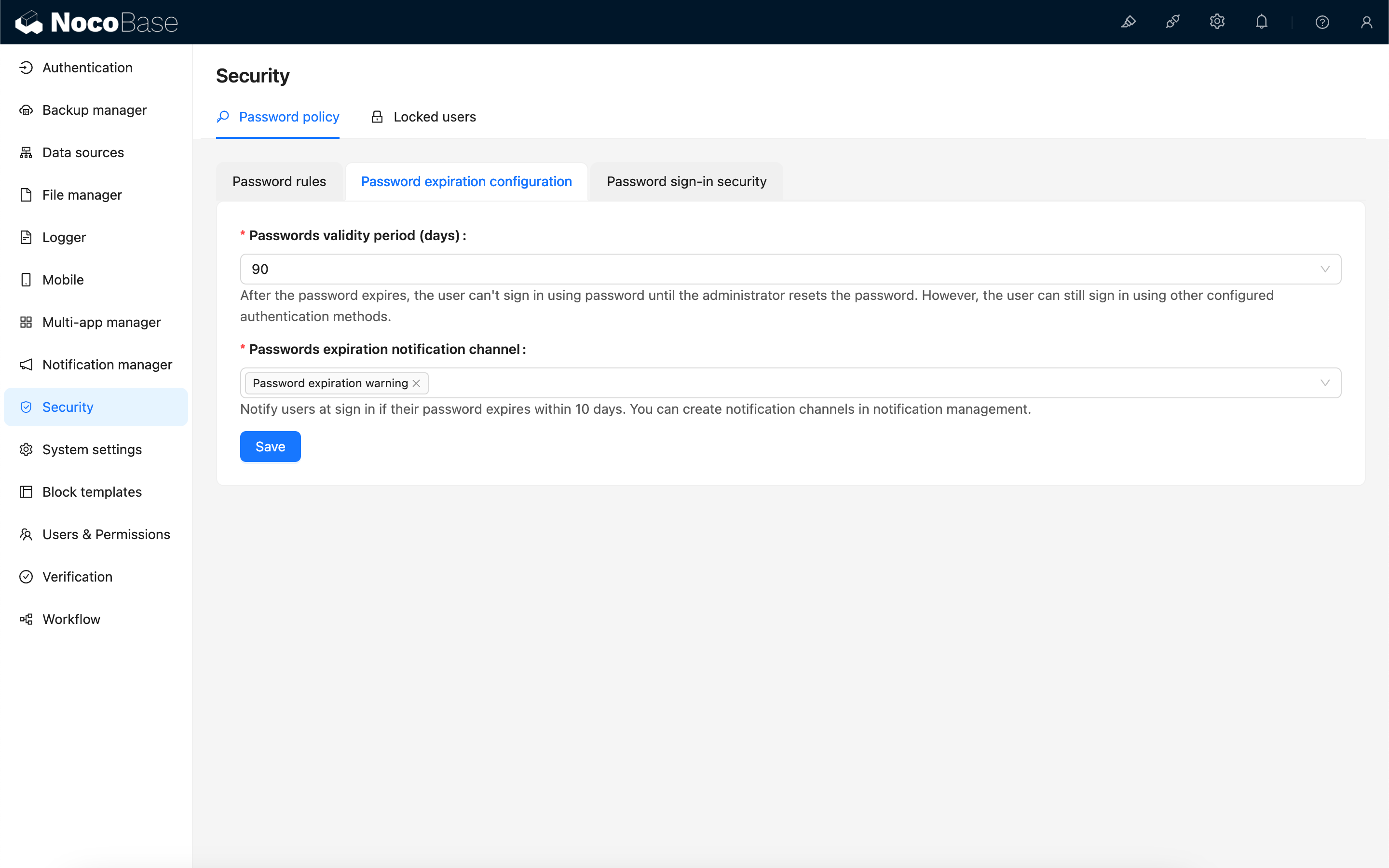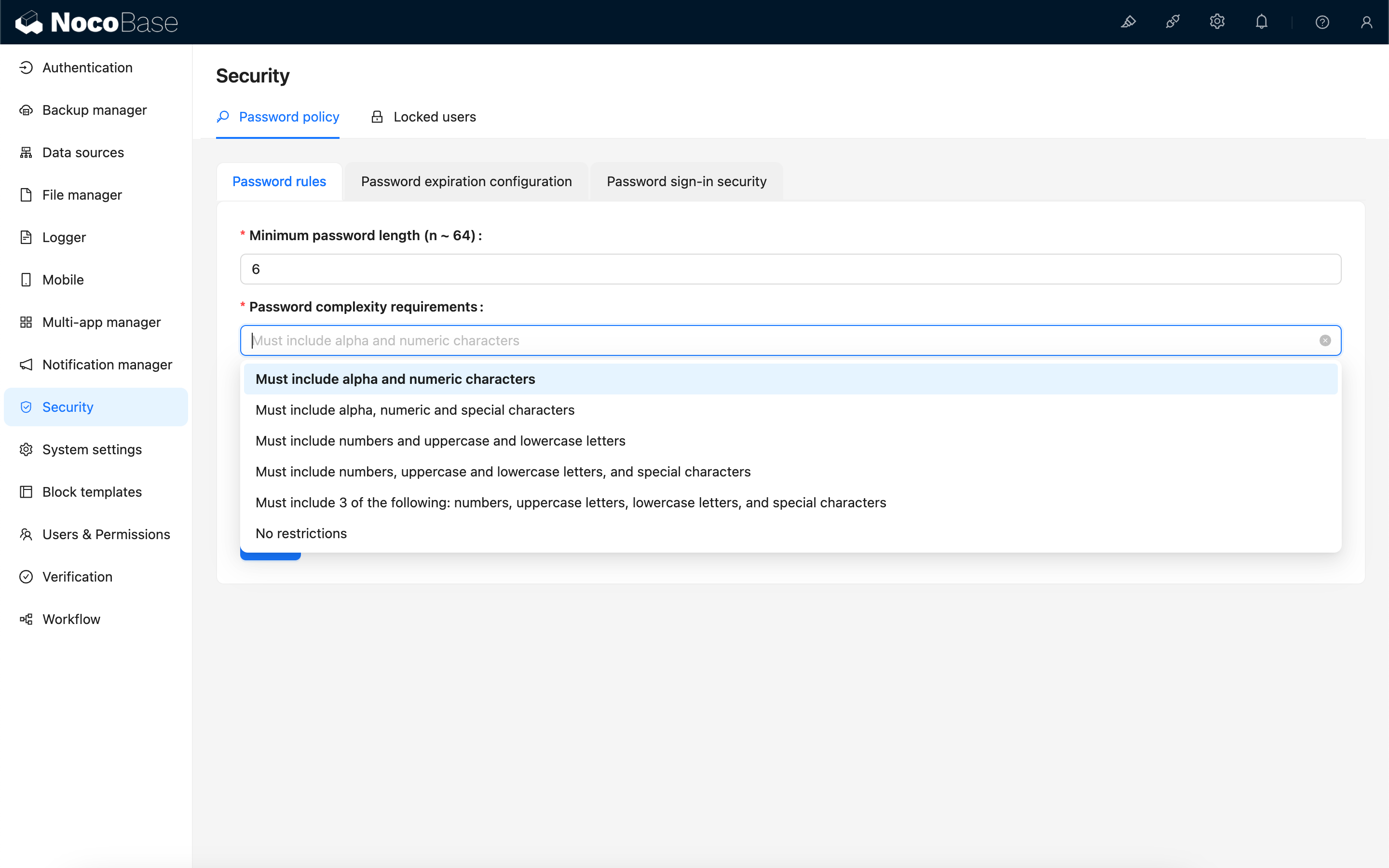 Set password rules, password expiration, and password login security policies for all users, and manage locked users.
