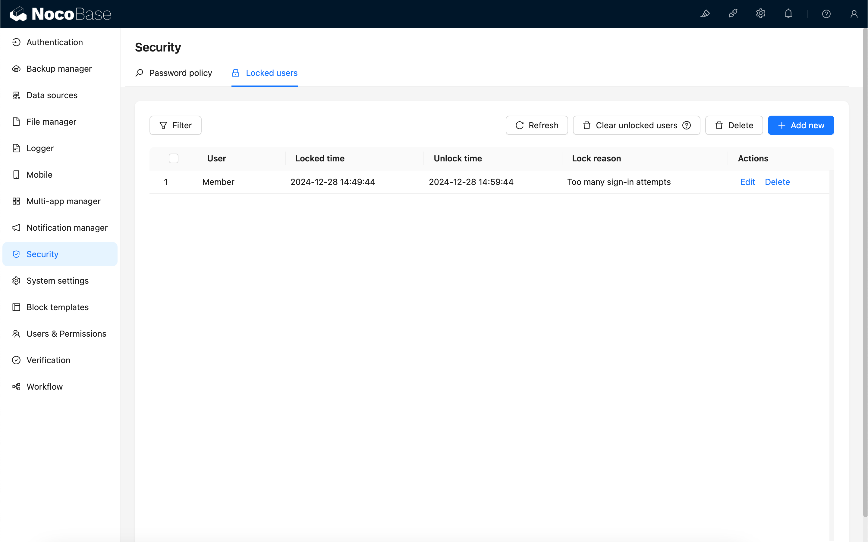 Users who are locked out due to exceeding the invalid password login limit can be unlocked by deleting the record.