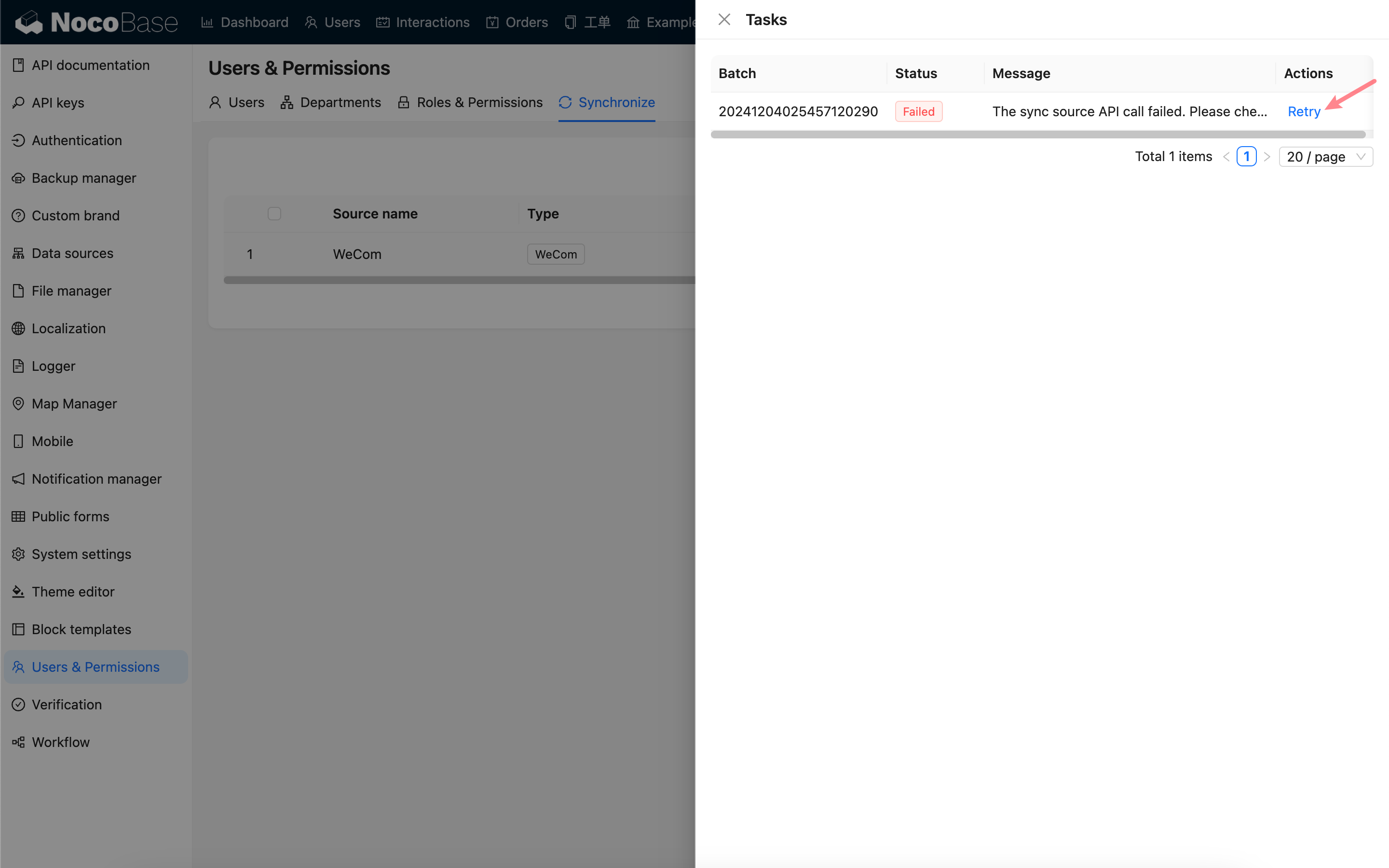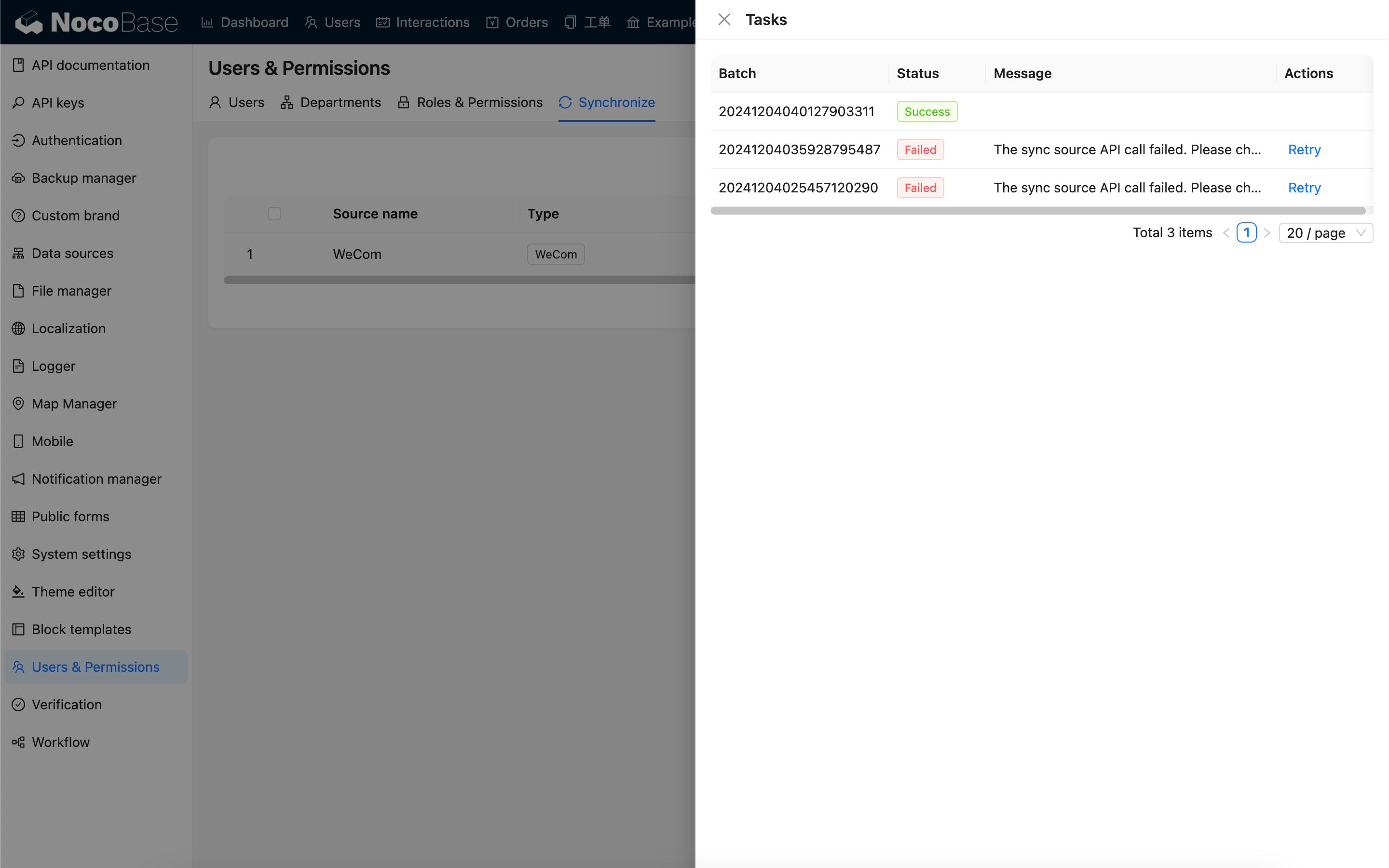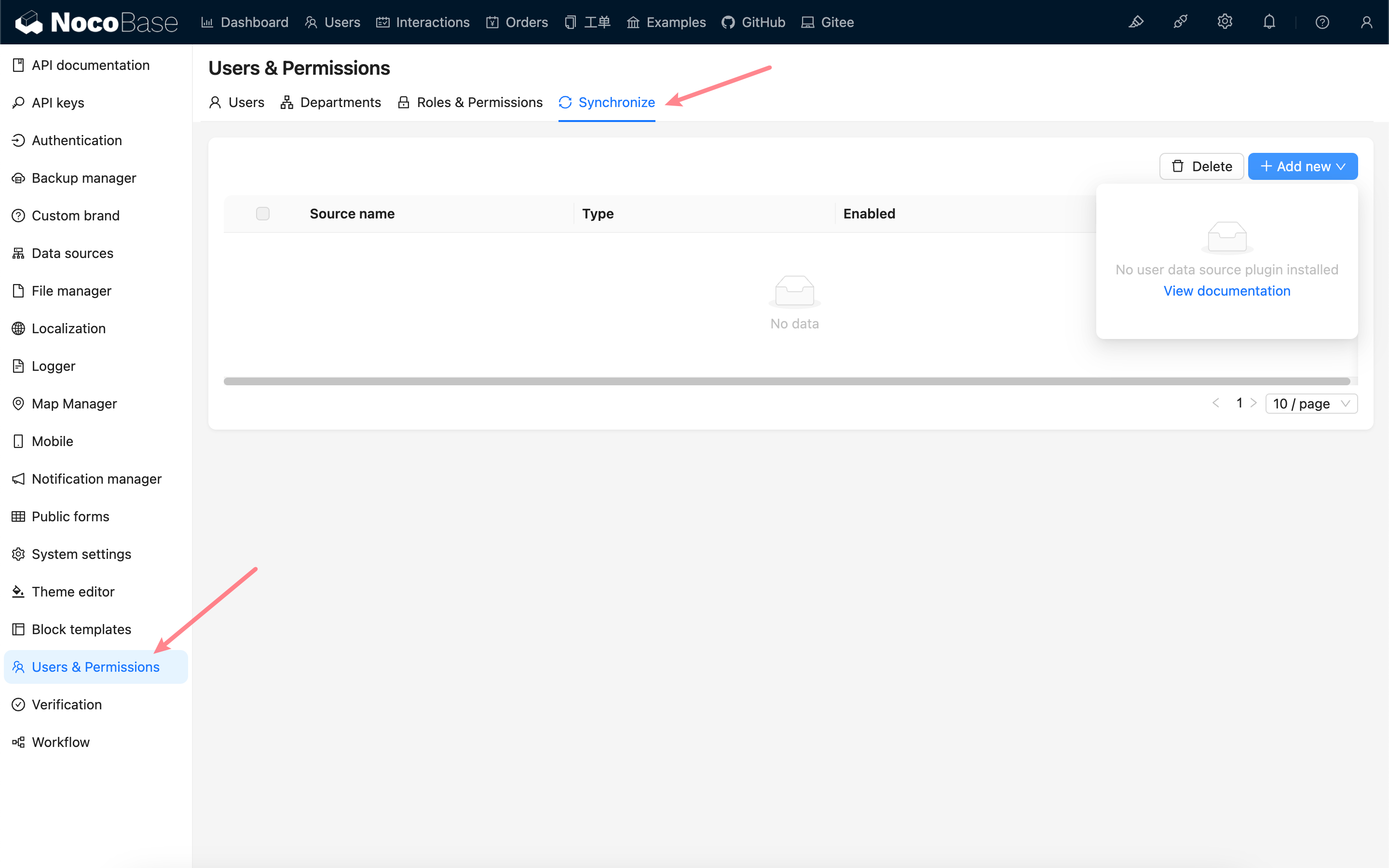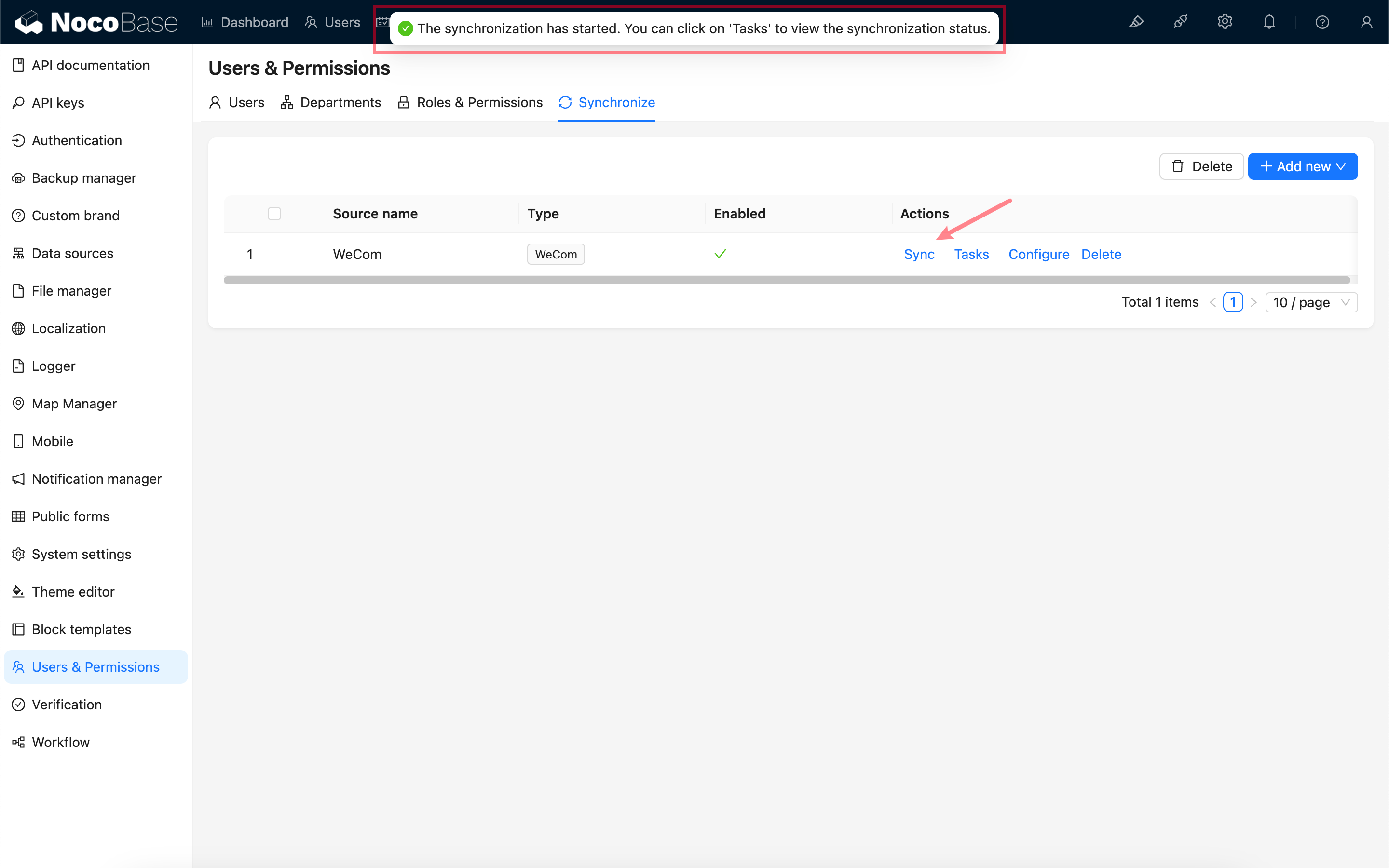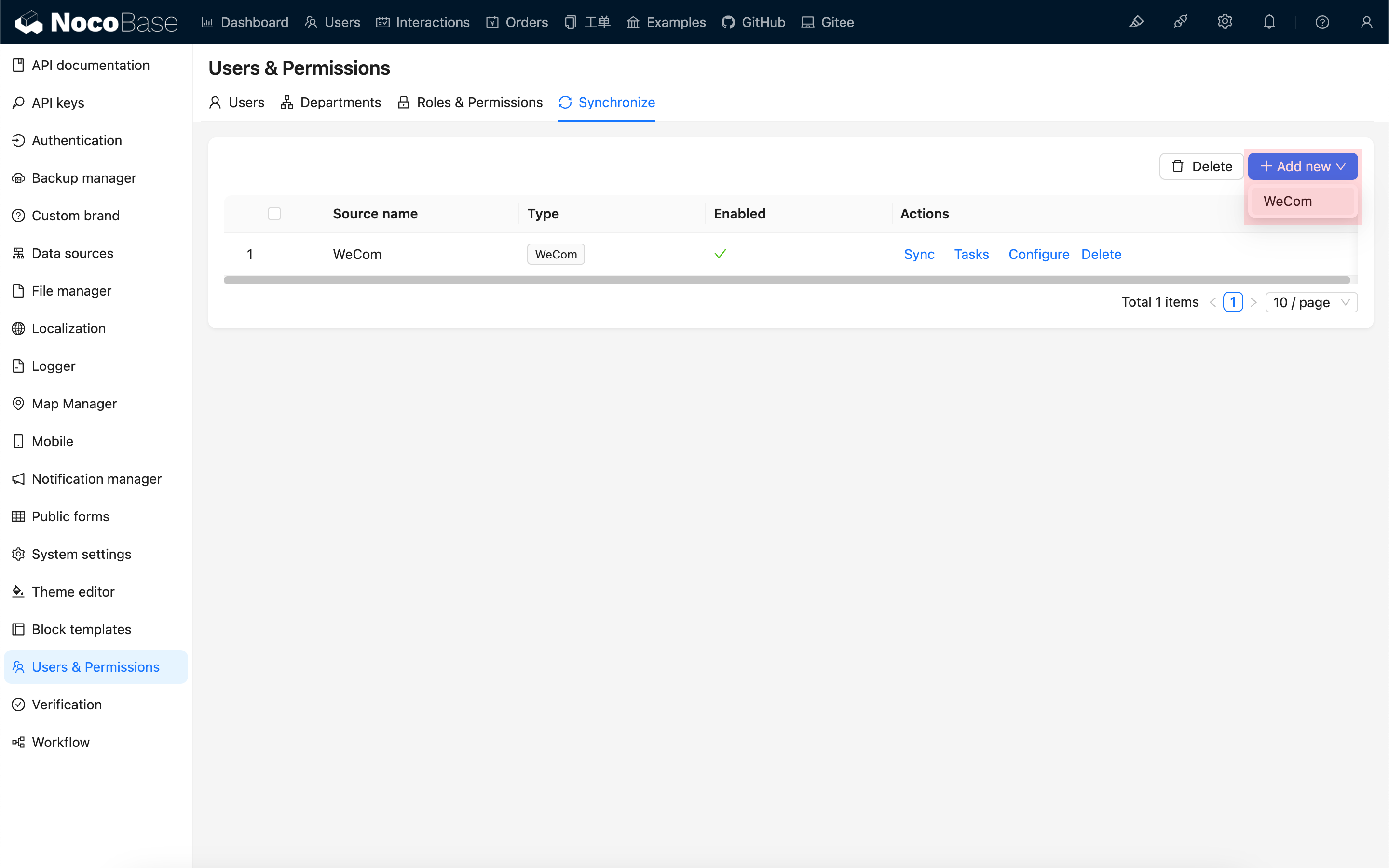 Once you install a plugin that provides a user data synchronization source, you can add the corresponding data source. Only enabled data sources will display the "Sync" and "Task" buttons.