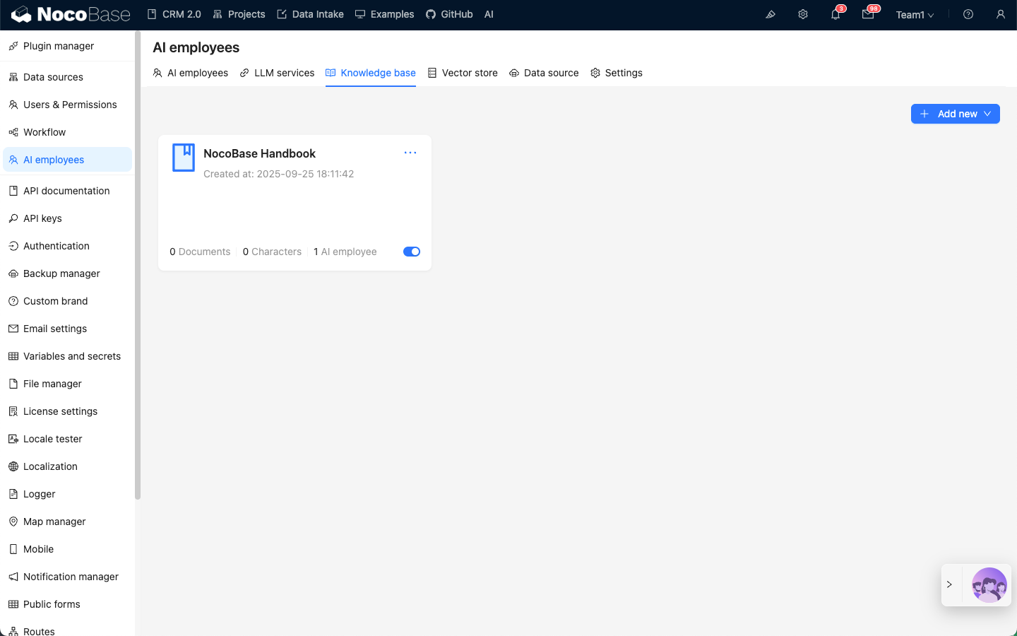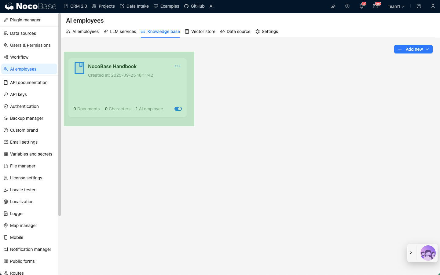 Truy cập trang cấu hình plugin nhân viên AI, nhấp vào tab Knowledge base để vào trang quản lý cơ sở tri thức.